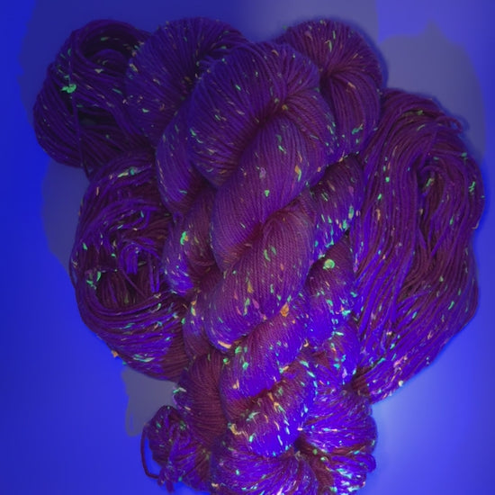 Raspberry is a semi-solid colourway of Raspberry Pink that could be used as a base colour for a large project. This colourway is dyed on our Neon Nep yarn base, the neon neps are spun into the wool, meaning the neps will glow under U.V. light (see video). They also don't pick up the dye solution so add a pop of colour throughout the skein.