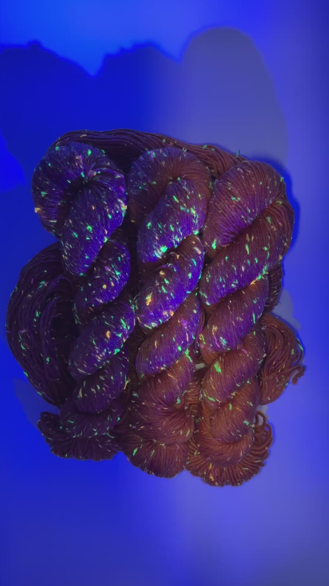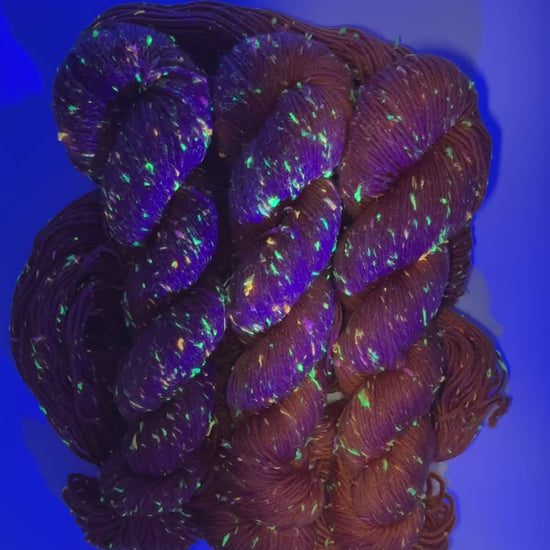 Saffron is a semi-solid colourway of Saffron Orange that could be used as a base colour for a large project. This colourway is dyed on our Neon Nep yarn base, the neon neps are spun into the wool, meaning the neps will glow under U.V. light (see video). They also don't pick up the dye solution so add a pop of colour throughout the skein.