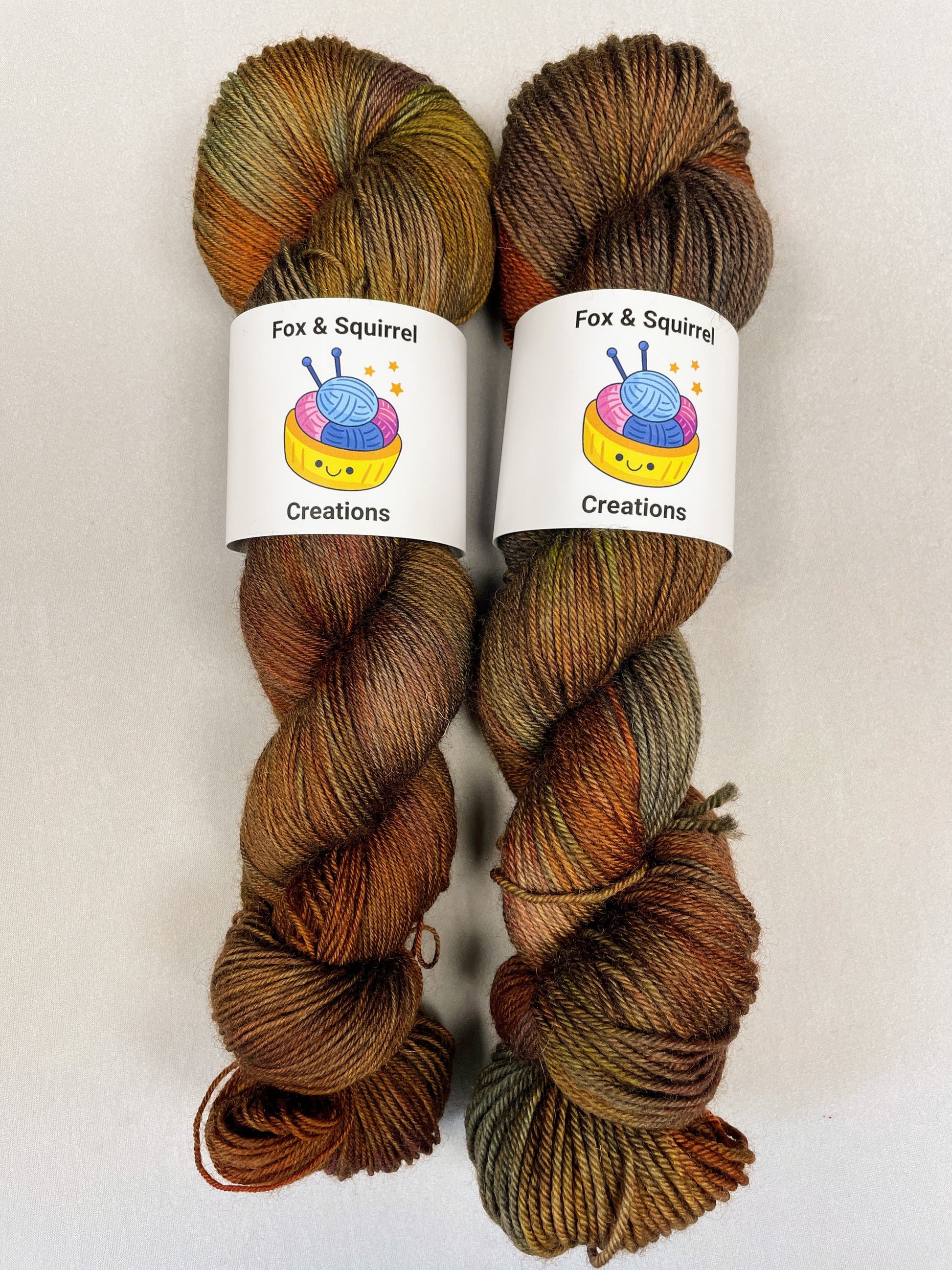 BFL 001 has a chestnut brown base colour with layers of orange, mustard, green and grey throughout the skein. A rich and deep colourway that shouts Autumnal, cosy vibes. Only one skein available on each yarn base.