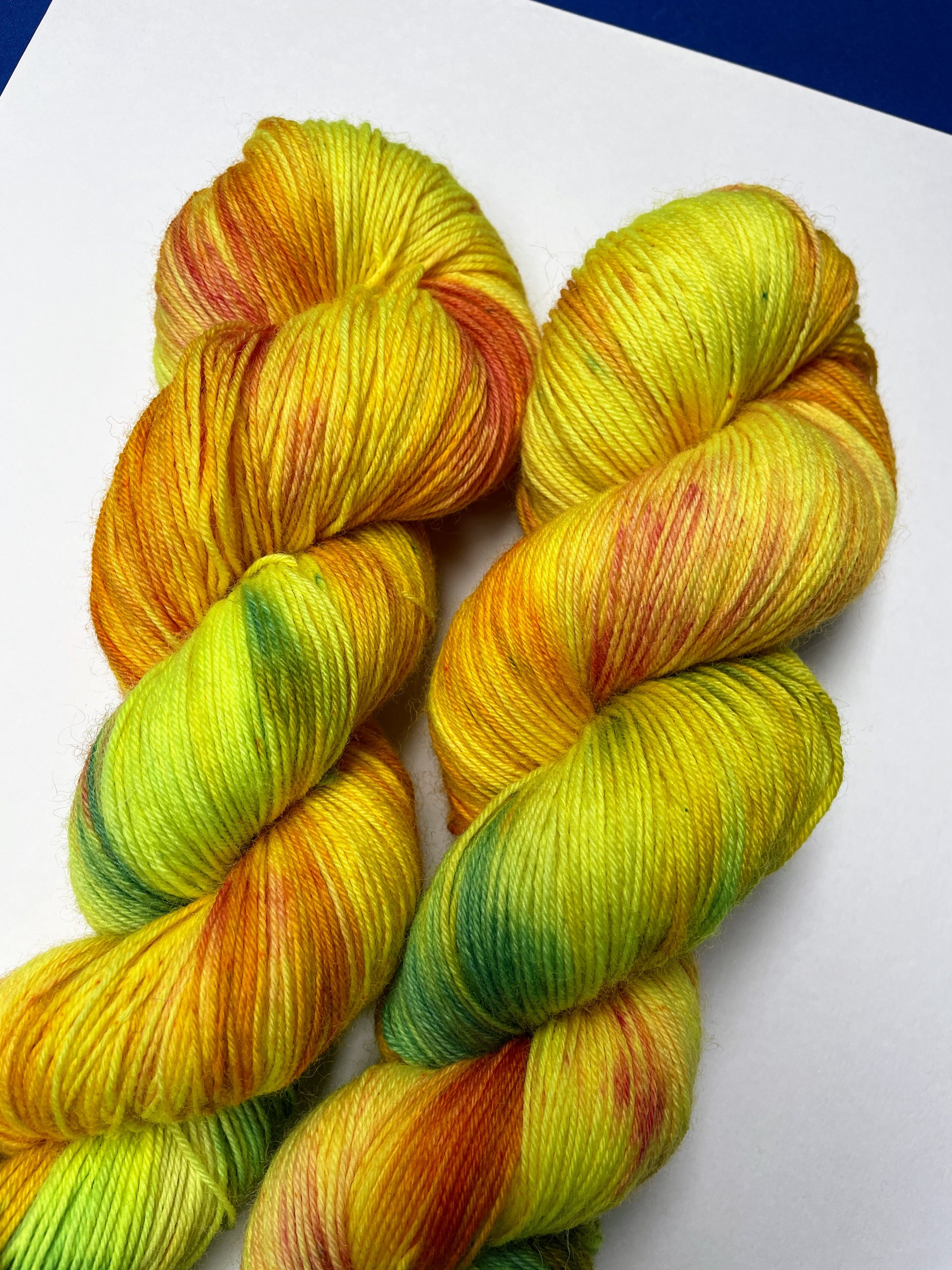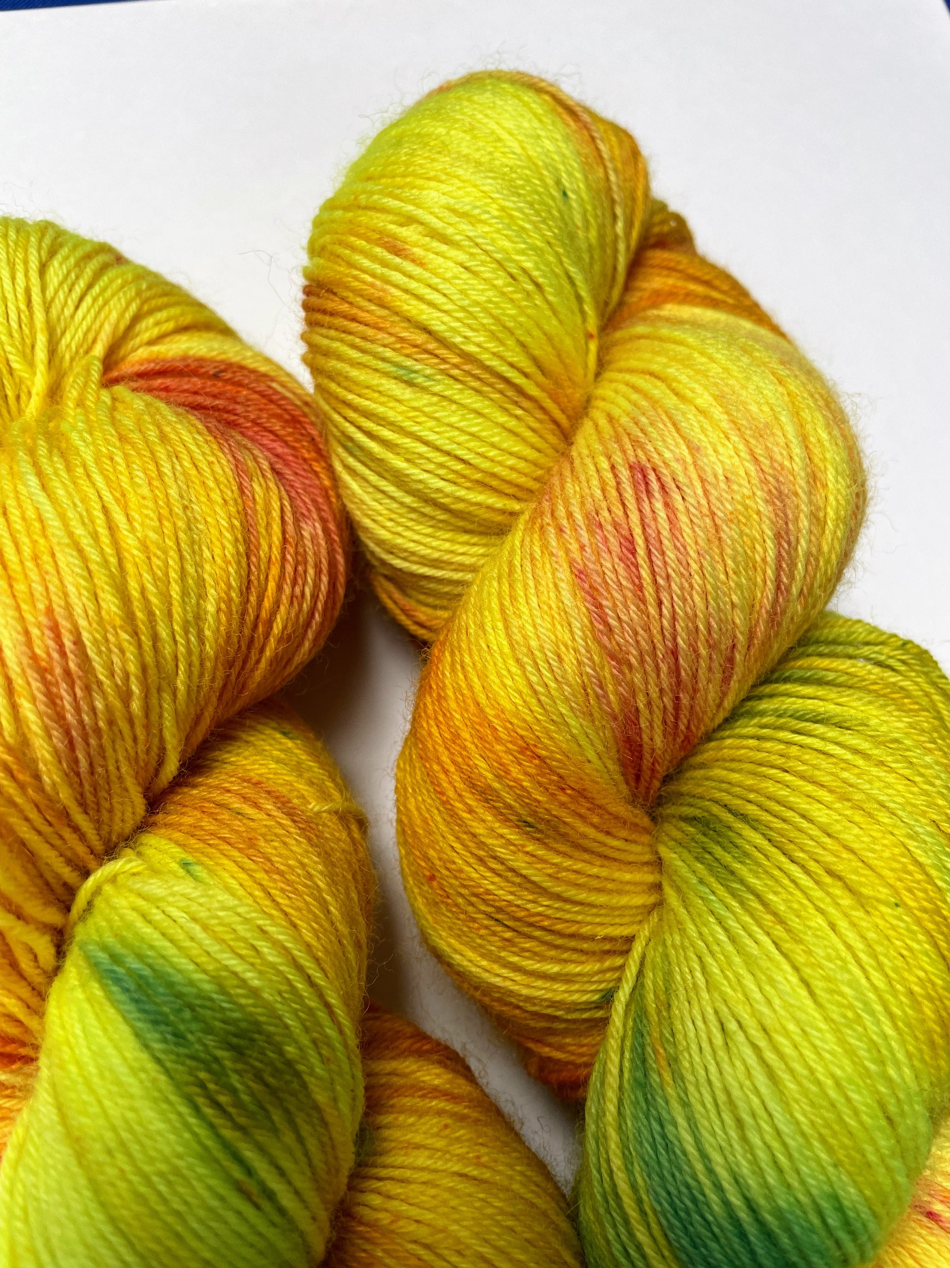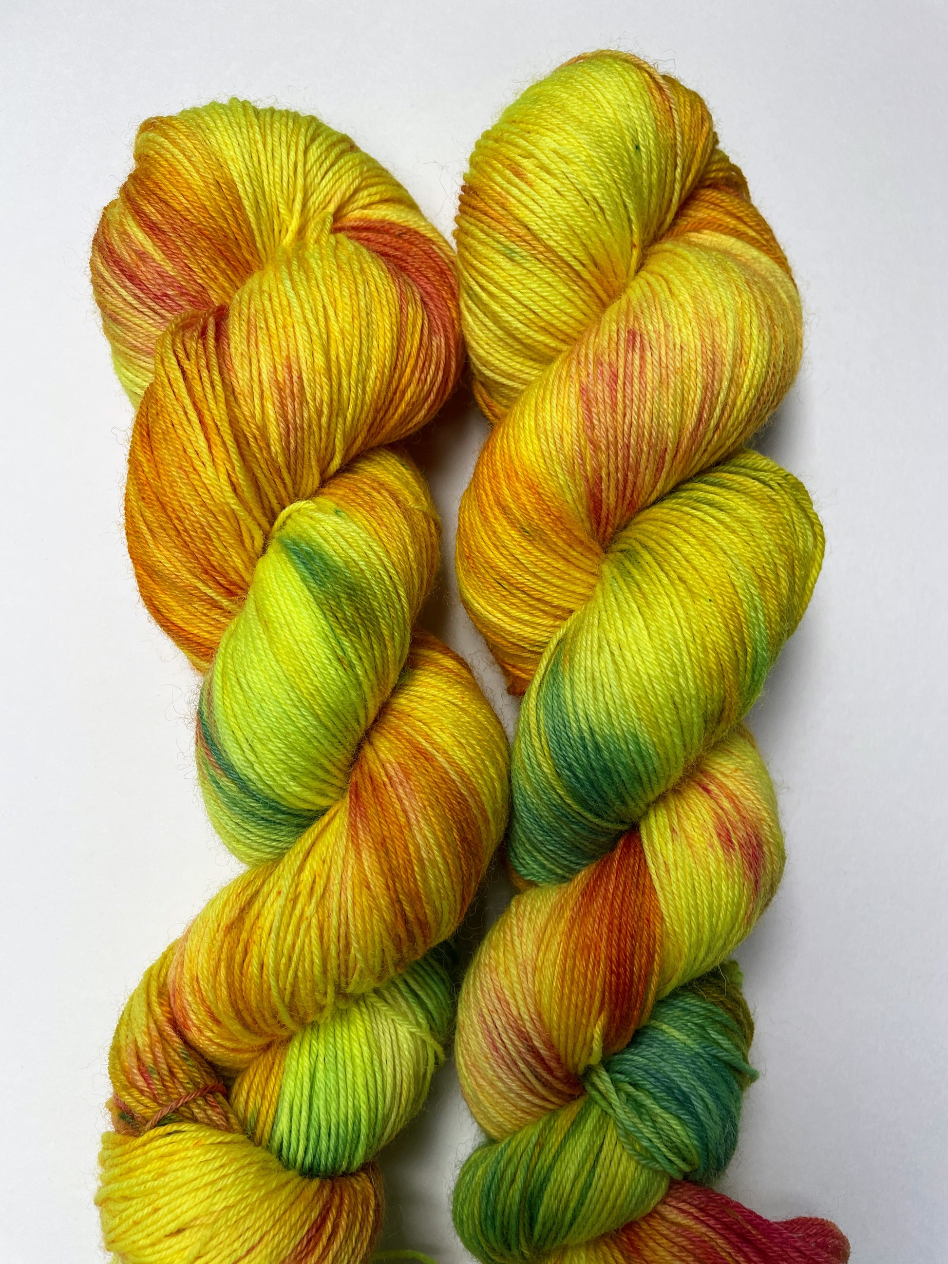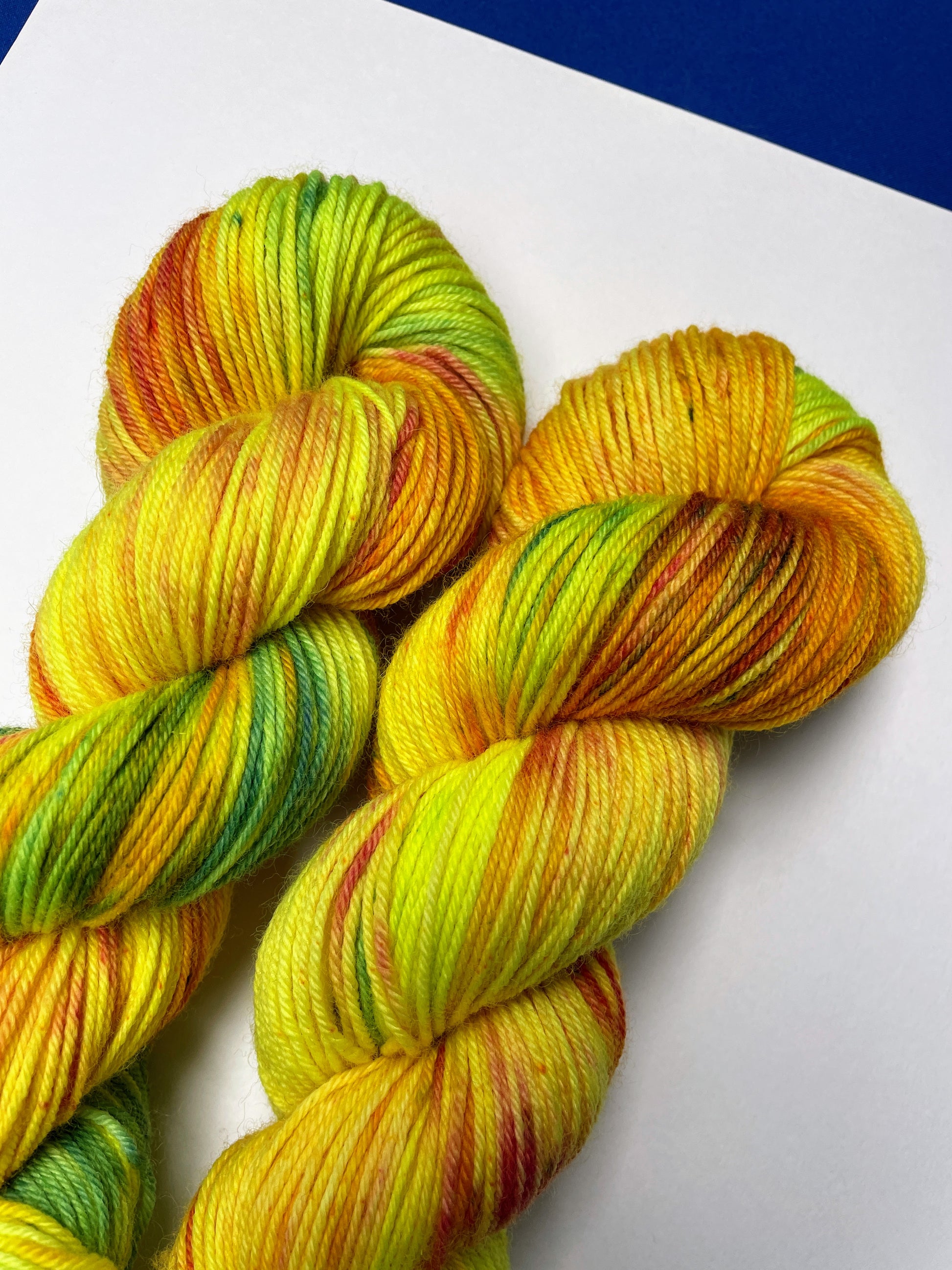 Marigold is dyed on our 100% superwash BFL (no nylon) yarn base and is a bright colourway with yellows, oranges, pink/red and splashes of green.