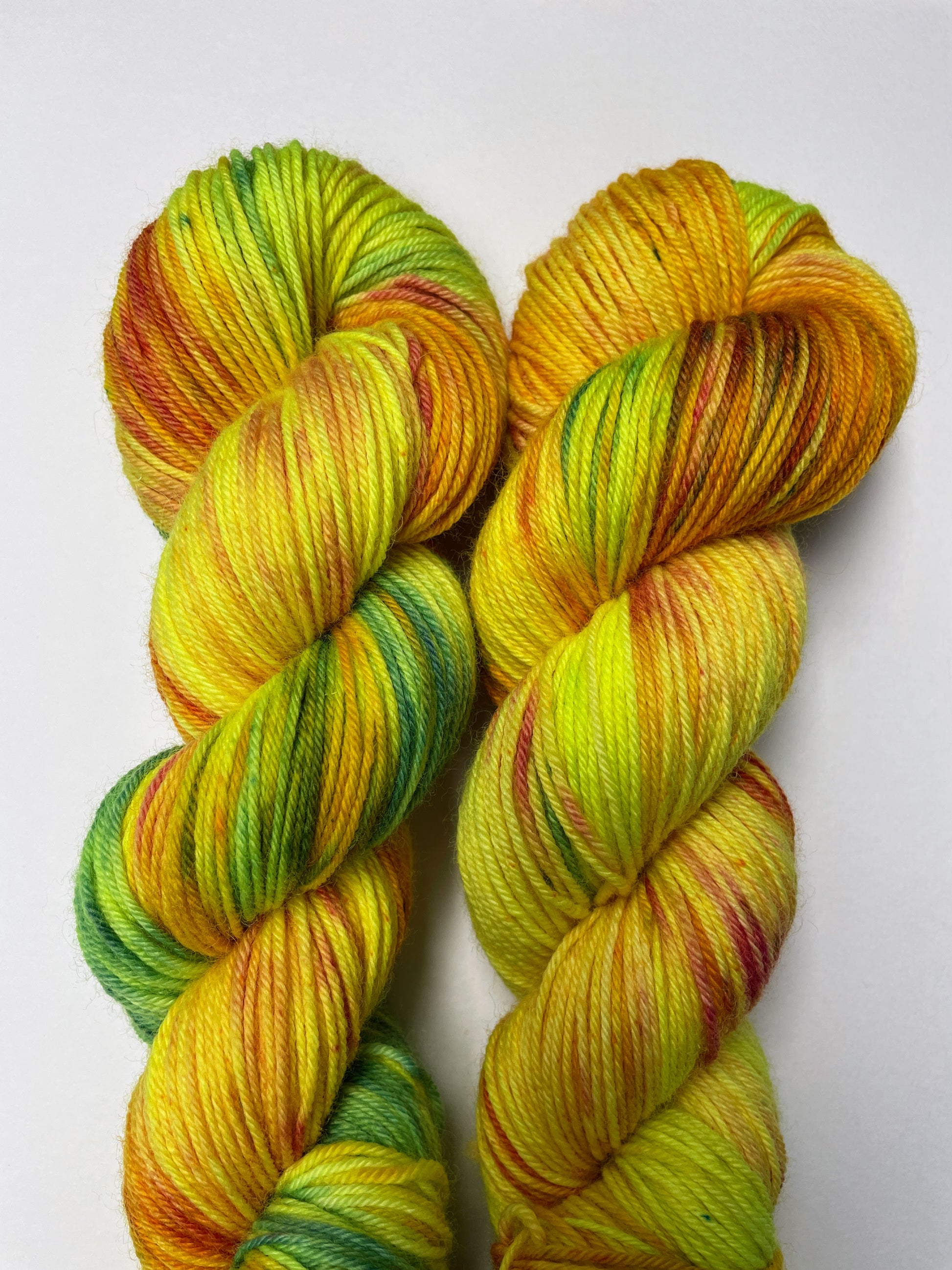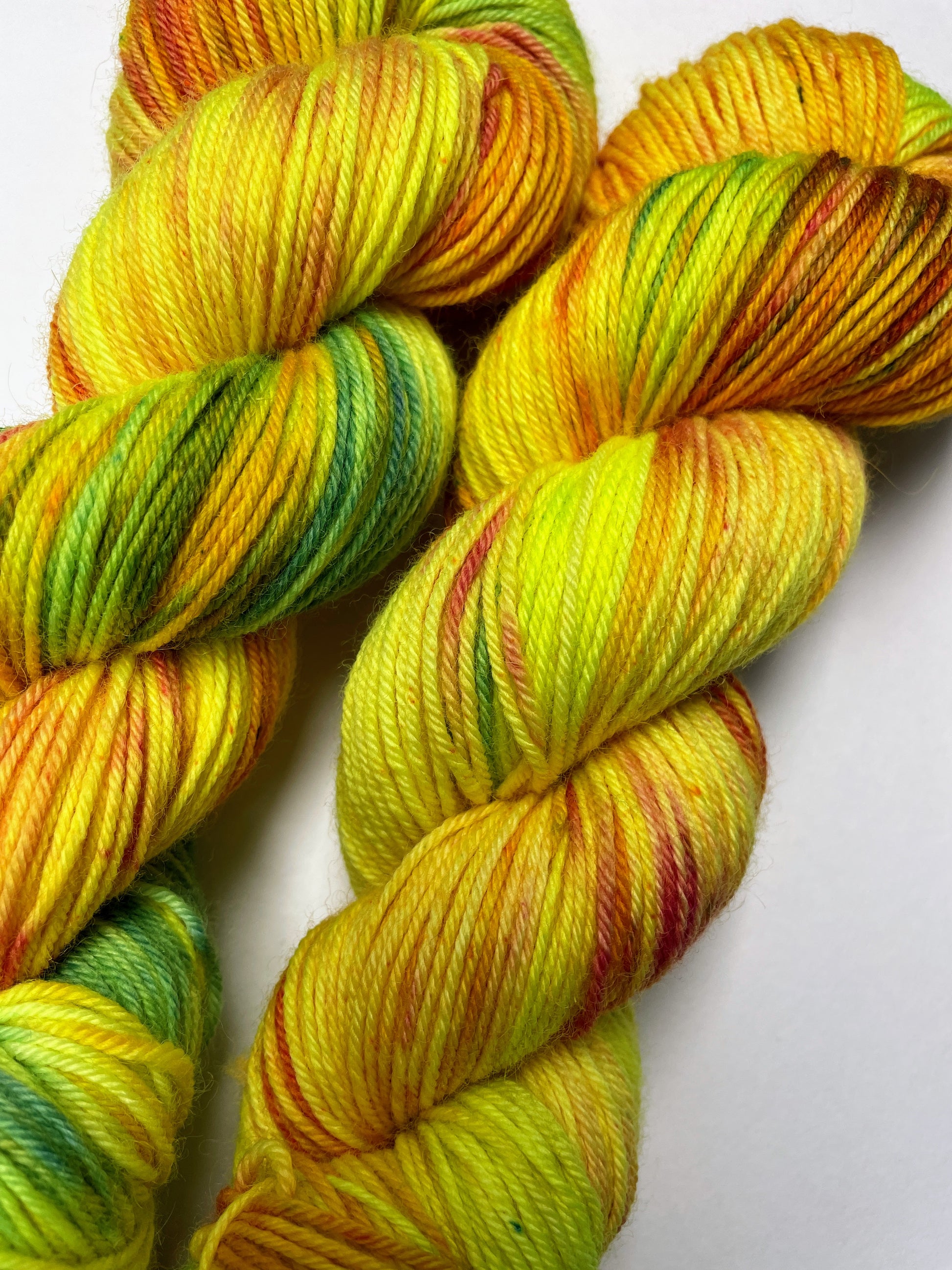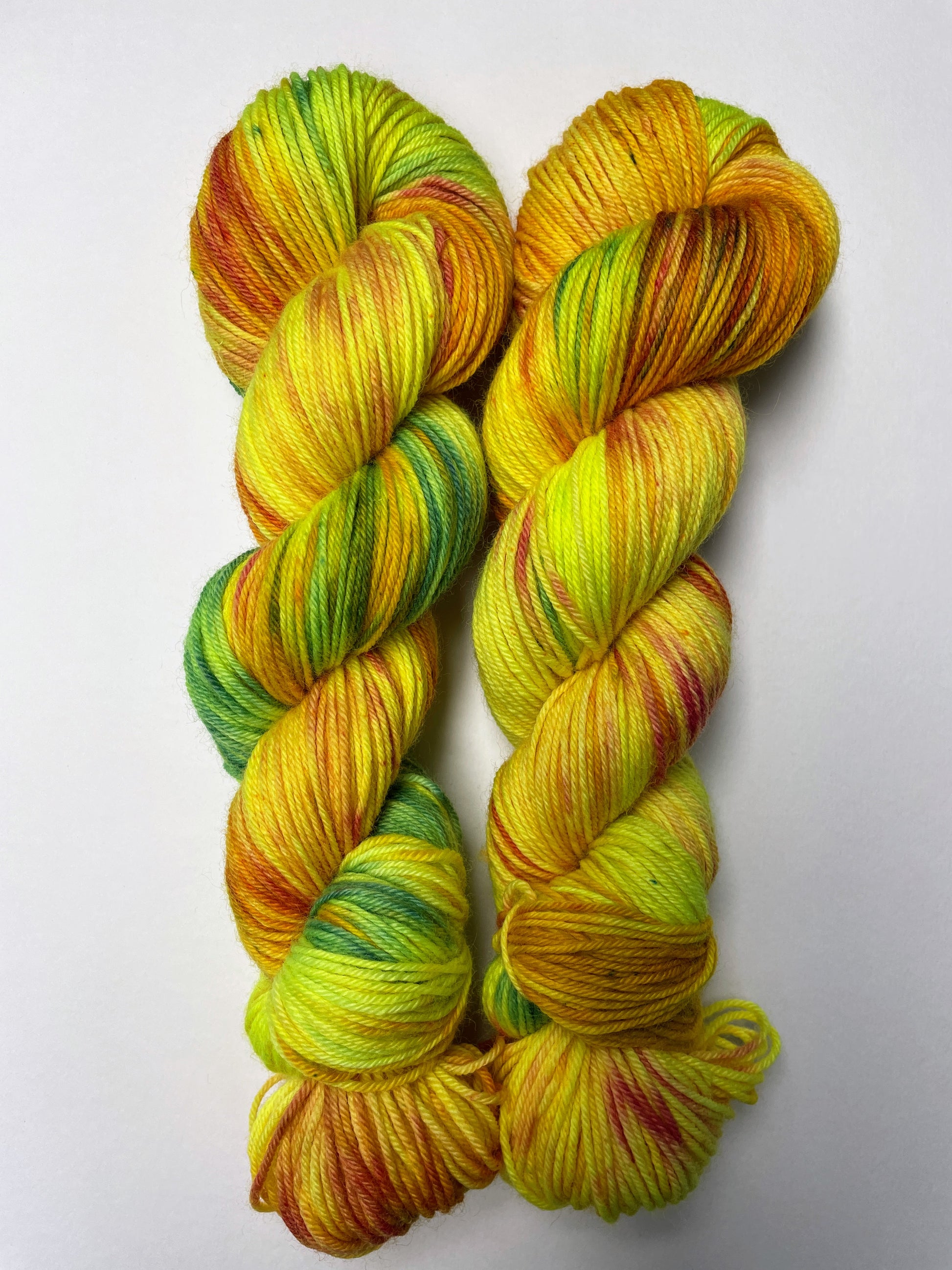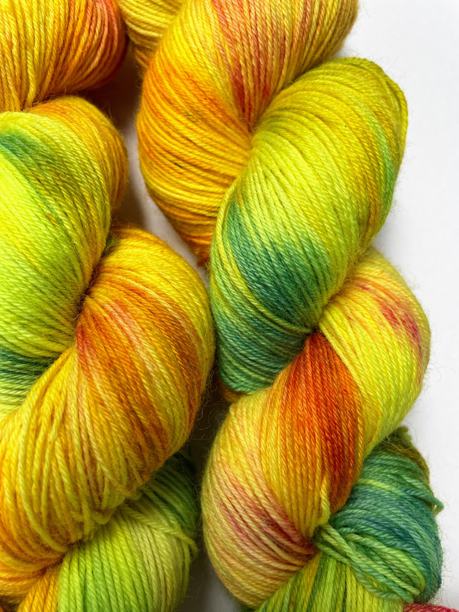 Marigold is dyed on our 100% superwash BFL (no nylon) yarn base and is a bright colourway with yellows, oranges, pink/red and splashes of green.