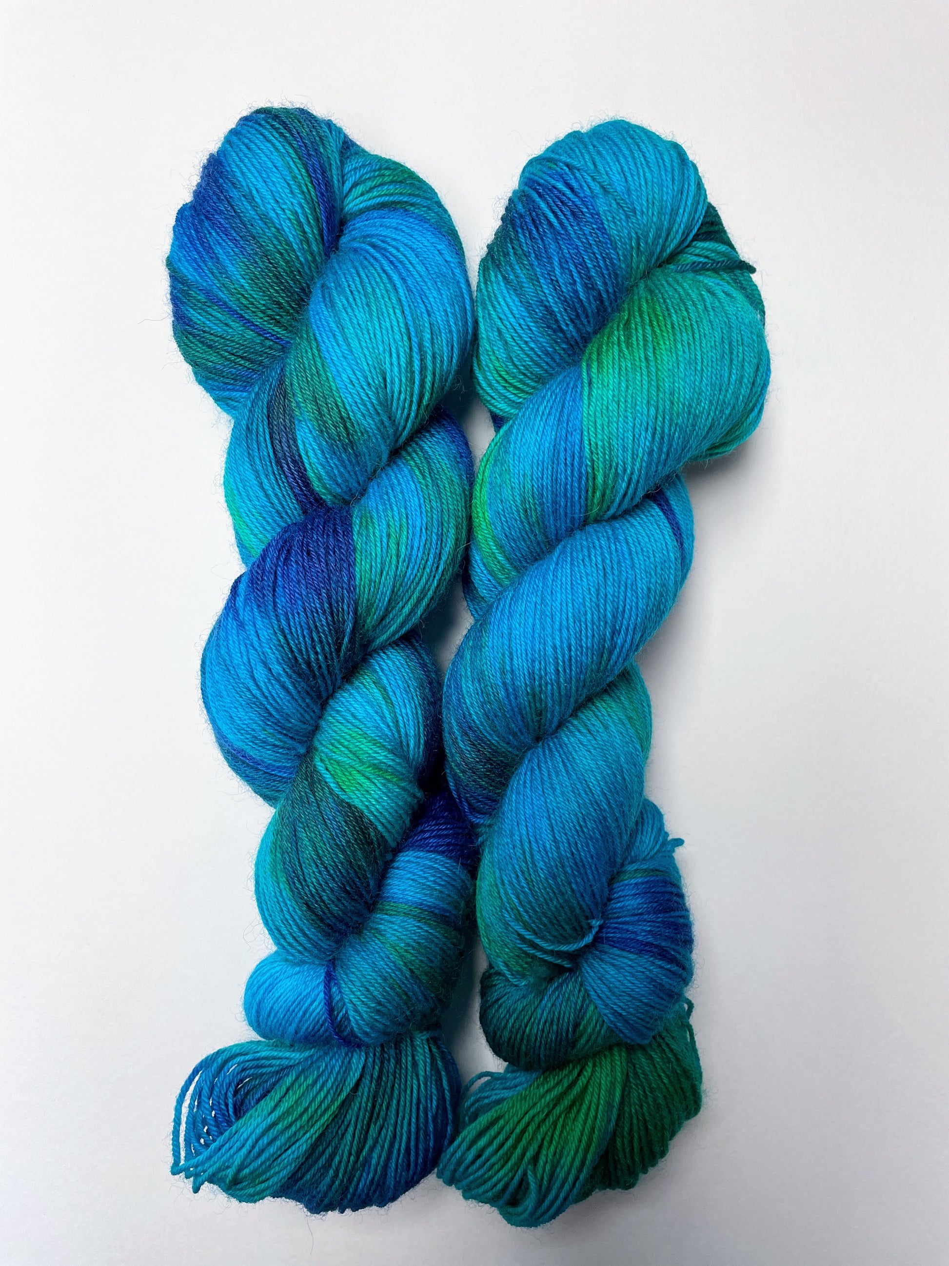 Tidal Vibes is dyed on our 100% Superwash DK BFL (no nylon) yarn base and is a deep, rich colourway with blues, turquoise, teal and splashes of green/yellow.