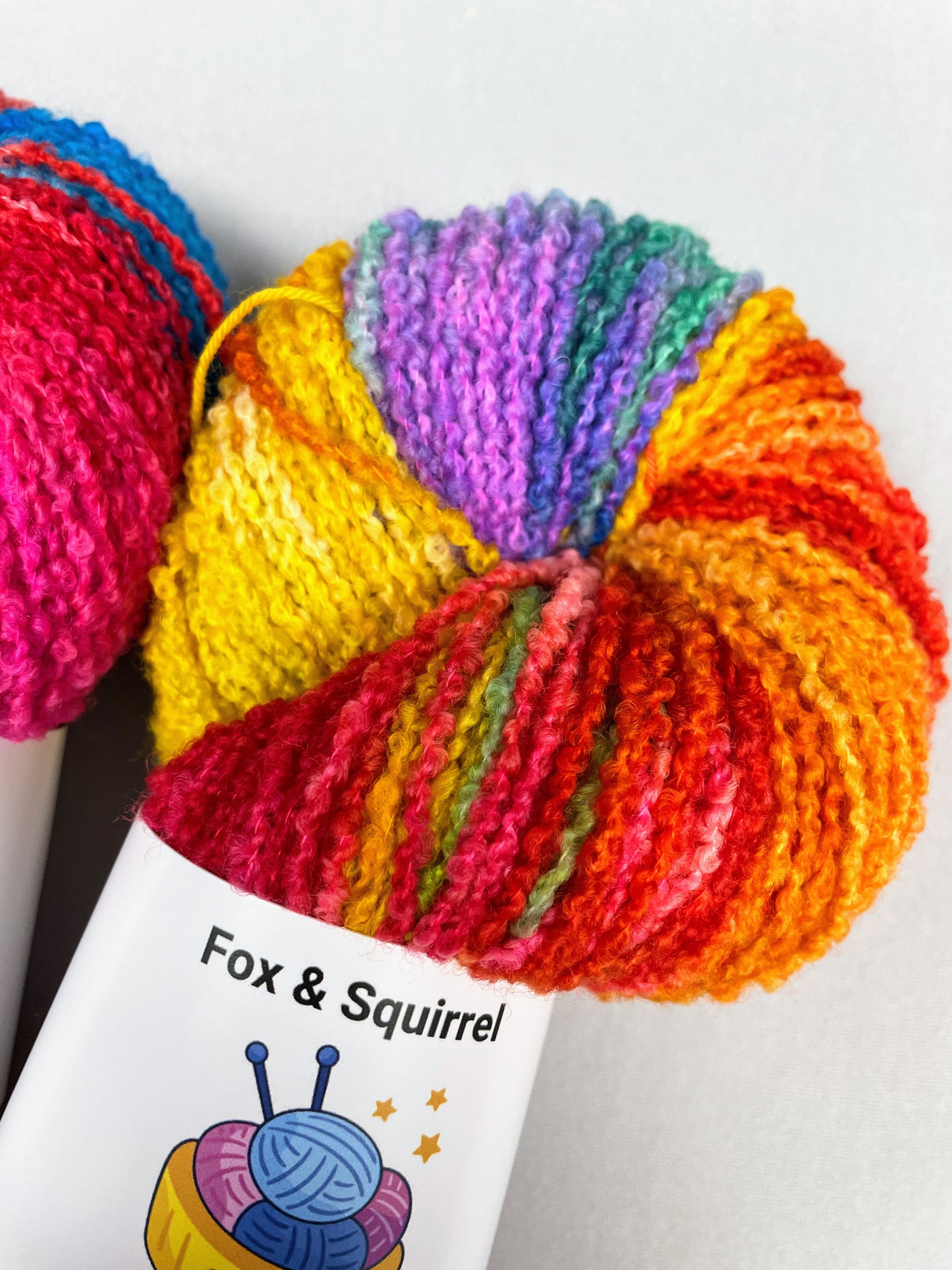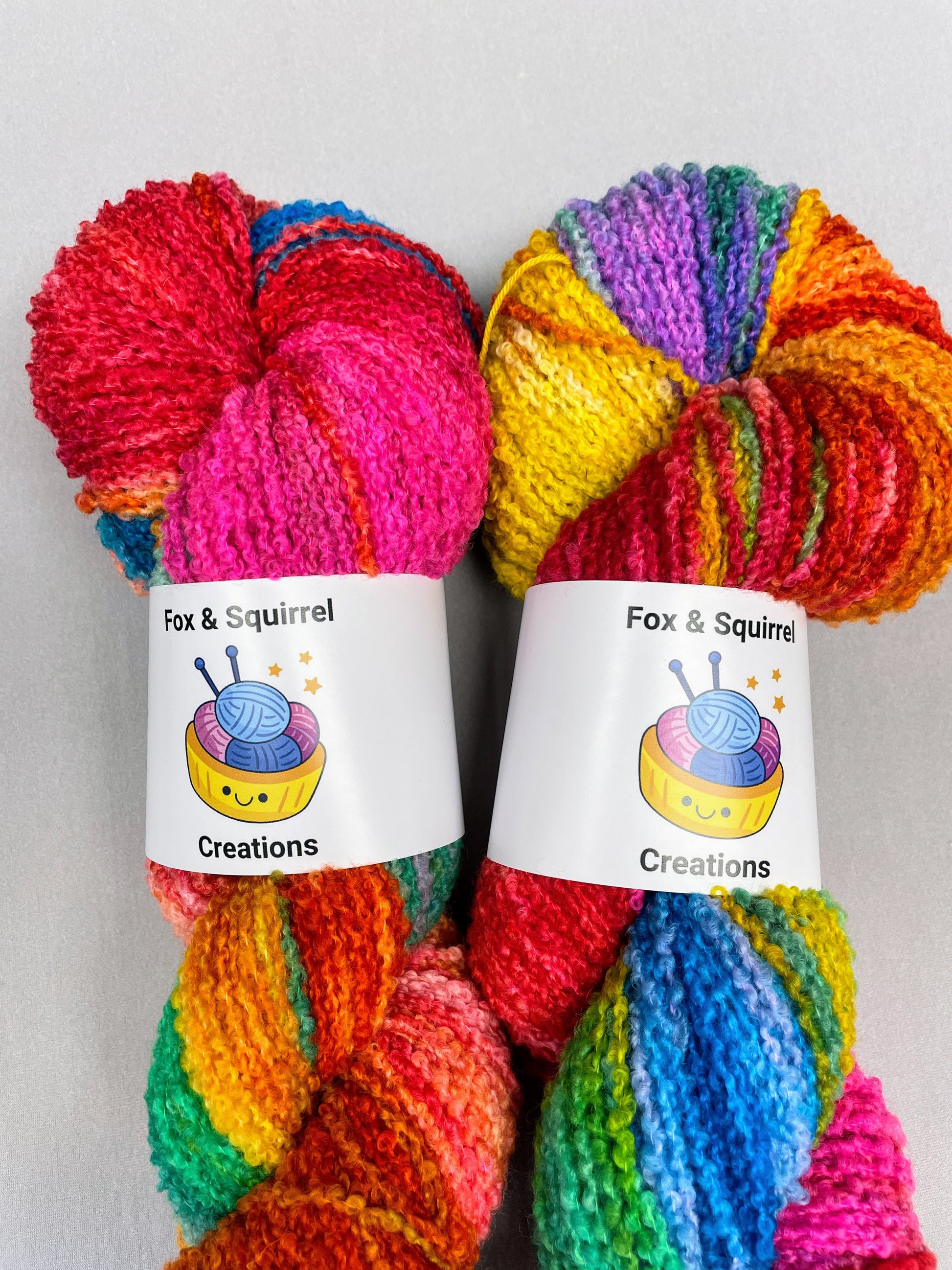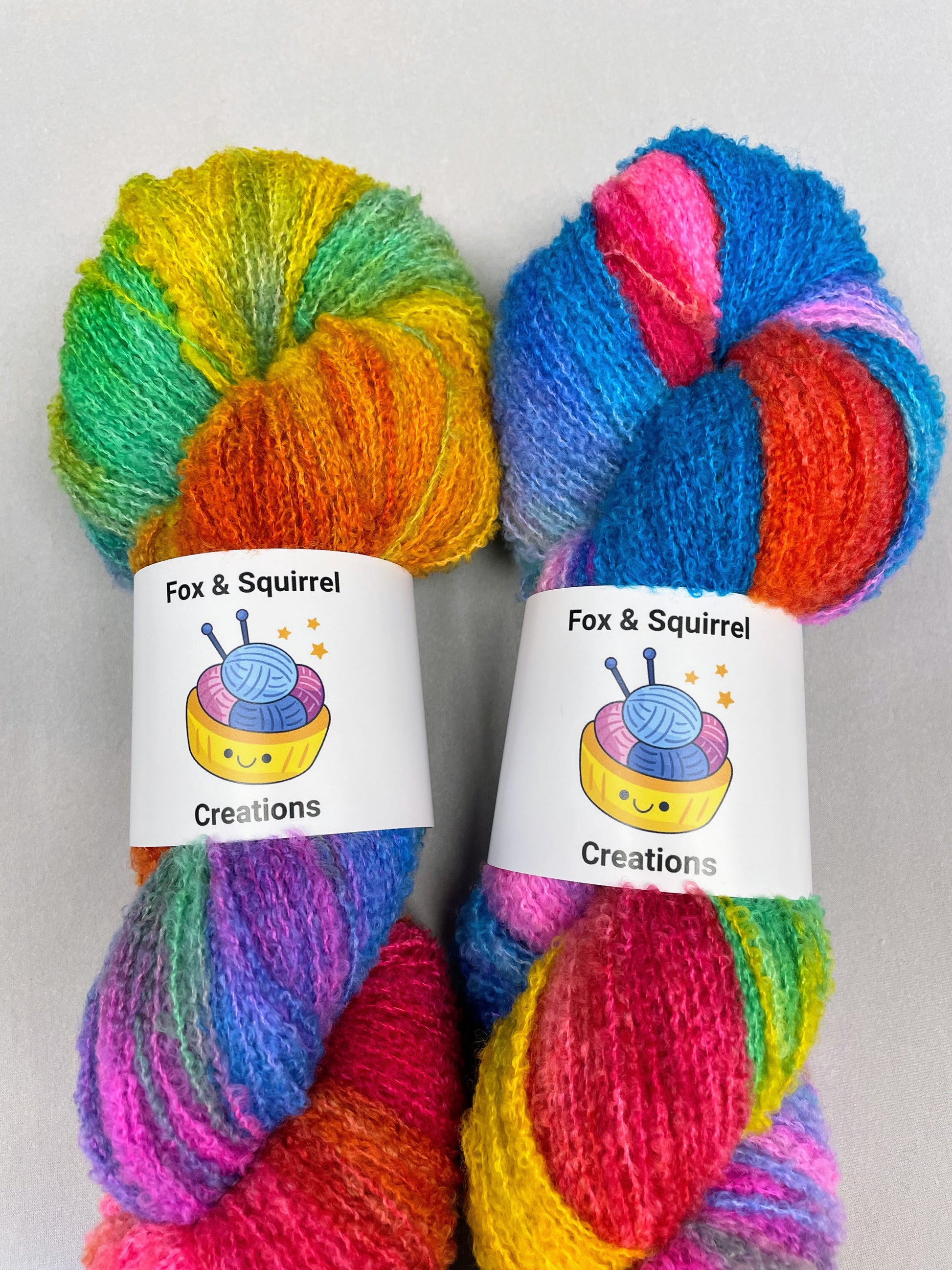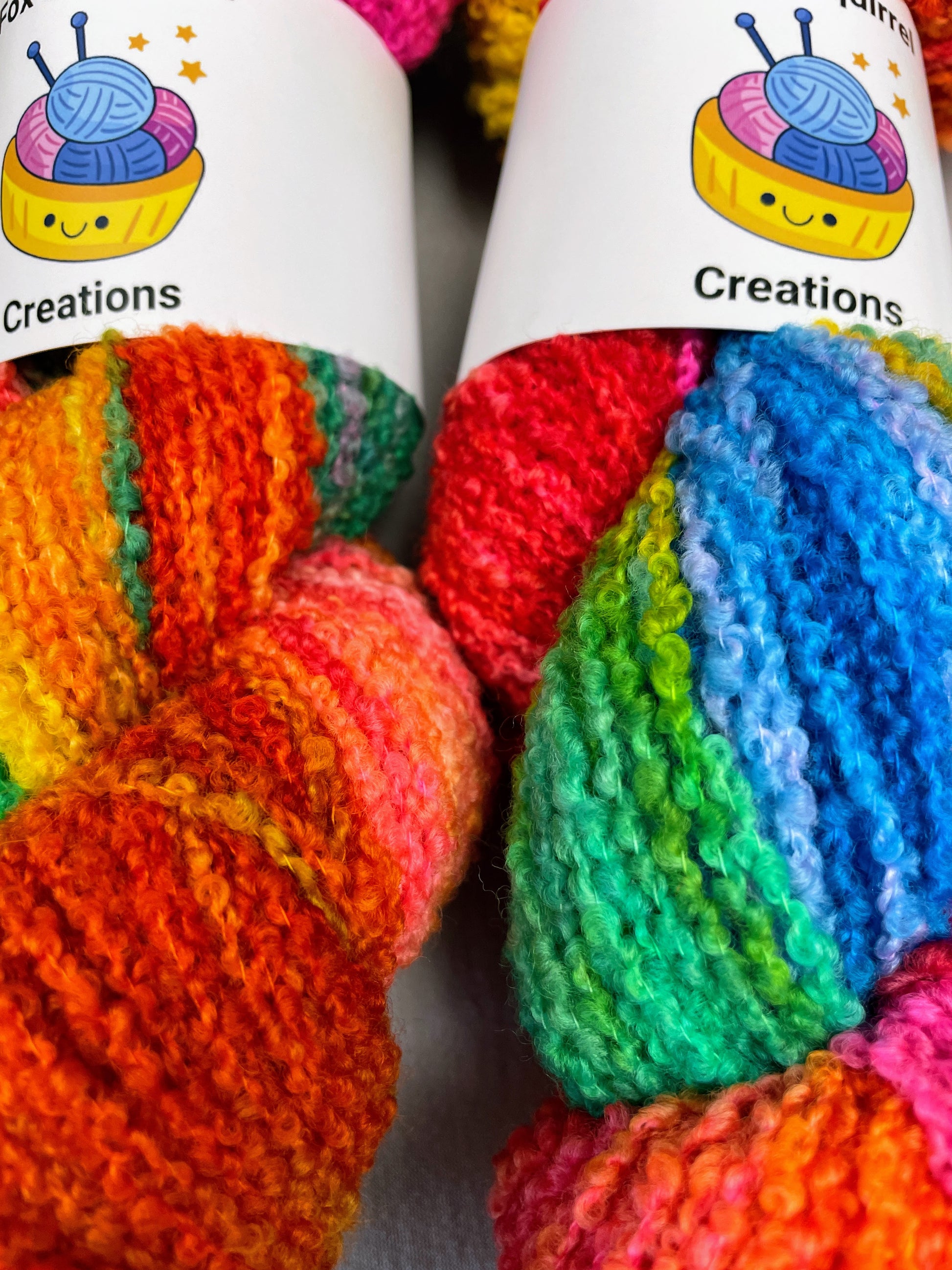 Rainbow is dyed on our Boucle yarn base, a super soft, squishy textured yarn that can be used to add texture to projects such as jumpers and shawls. Rainbow is a bold colourway of Red, Blue, Green, Pink, Yellow, Orange and Purple.