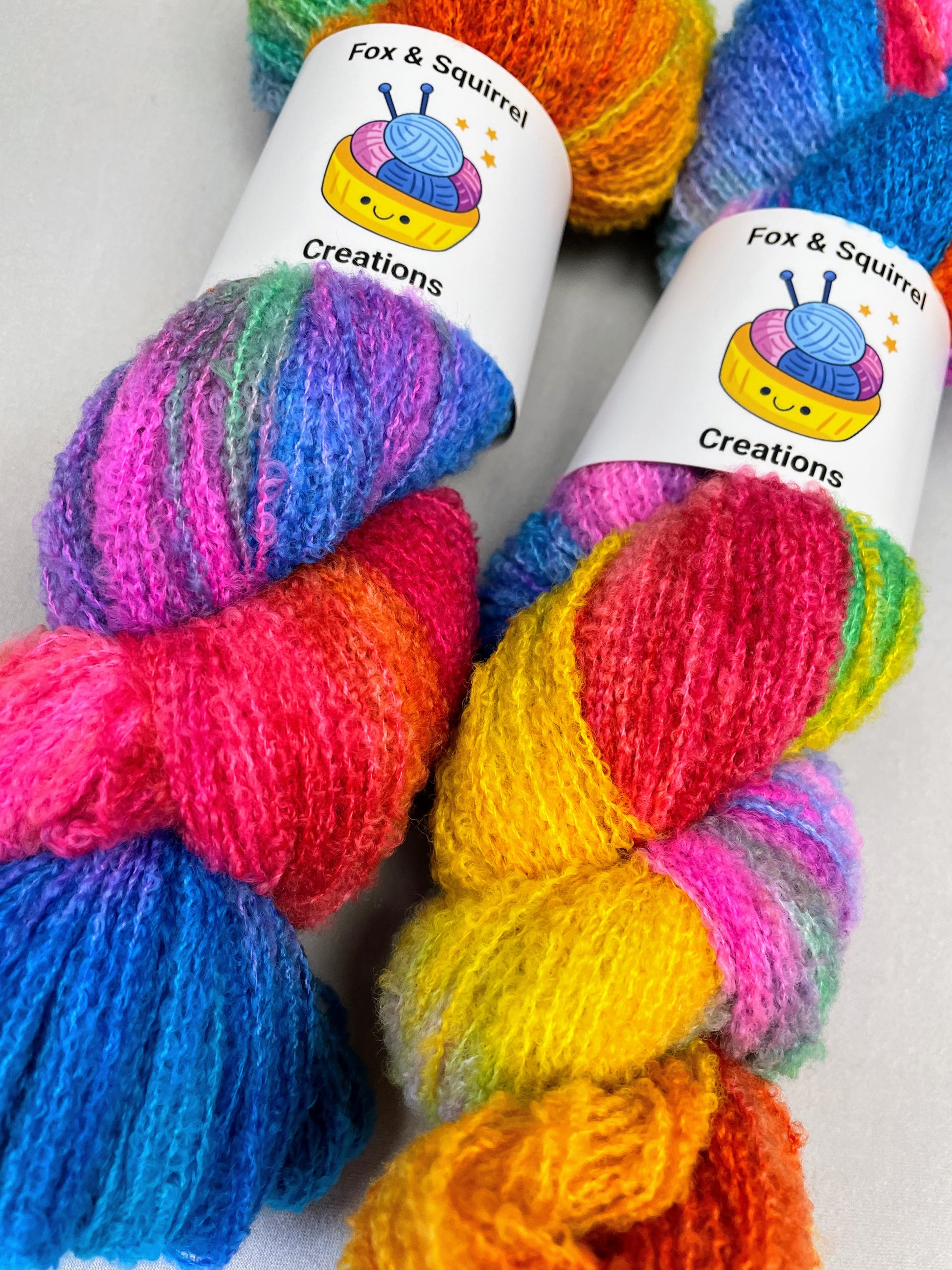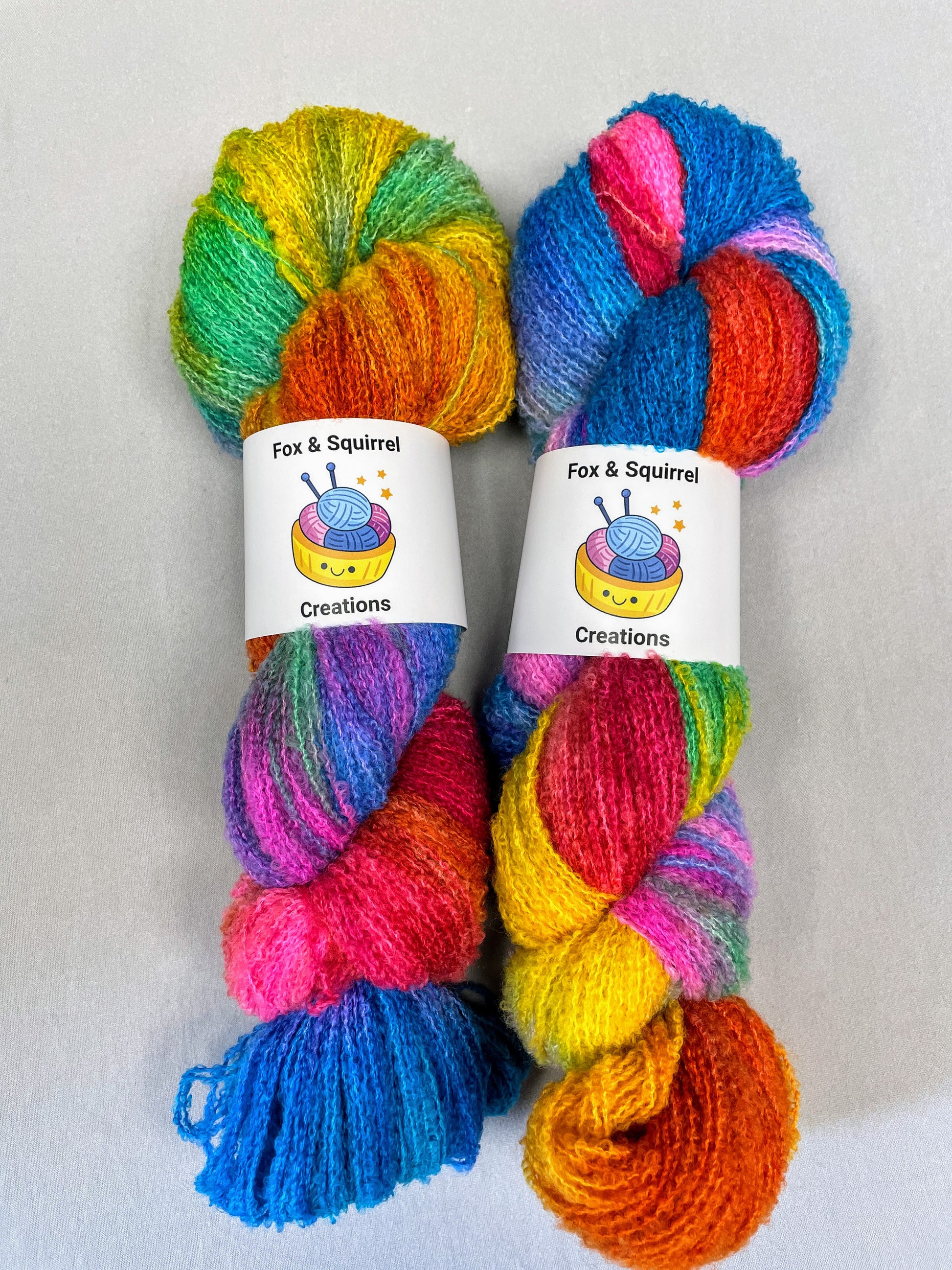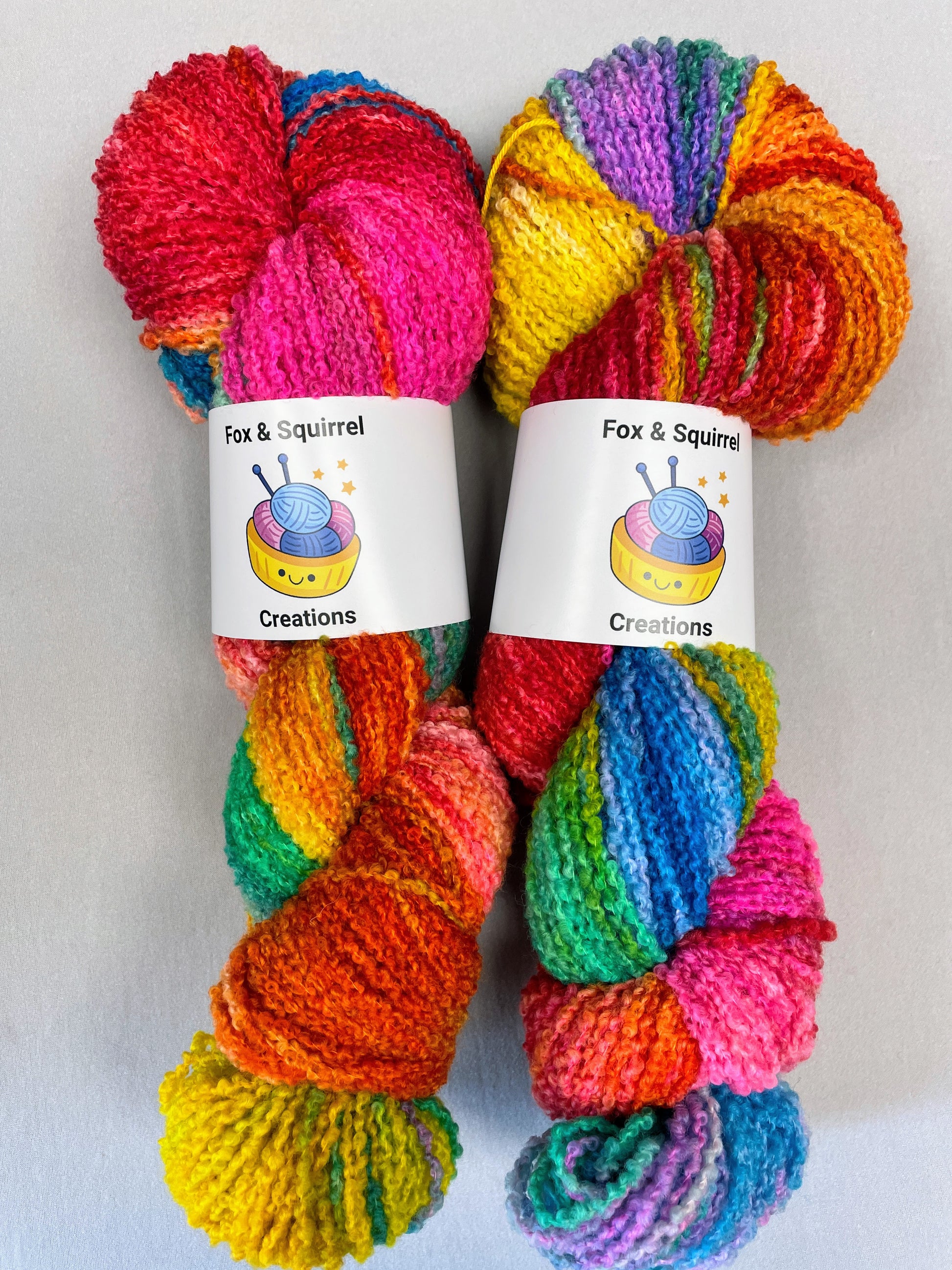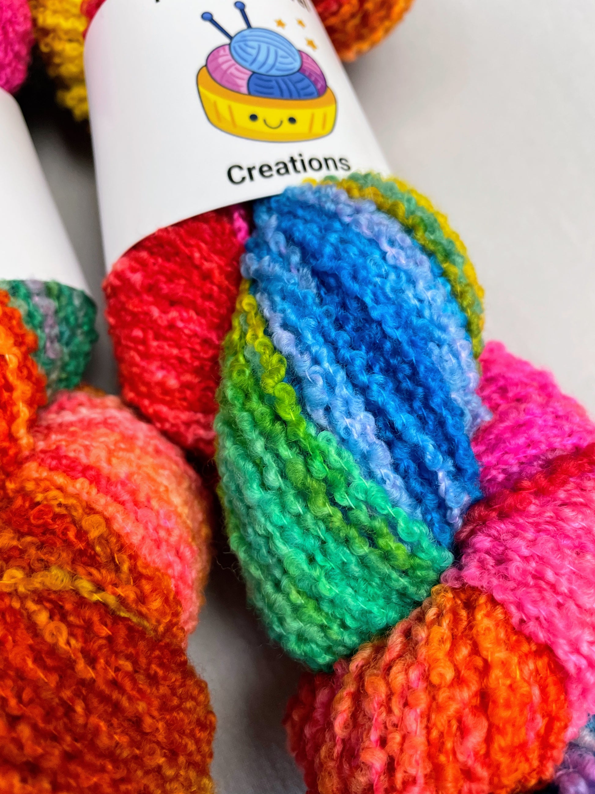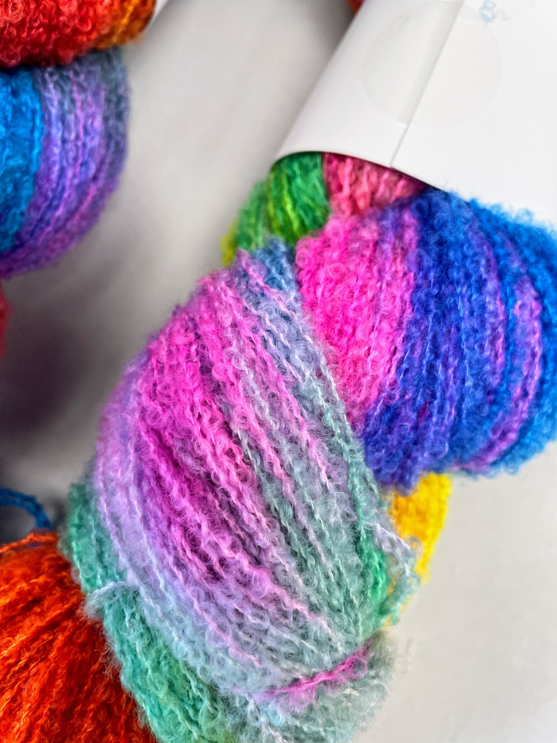 Rainbow is dyed on our Boucle yarn base, a super soft, squishy textured yarn that can be used to add texture to projects such as jumpers and shawls. Rainbow is a bold colourway of Red, Blue, Green, Pink, Yellow, Orange and Purple.