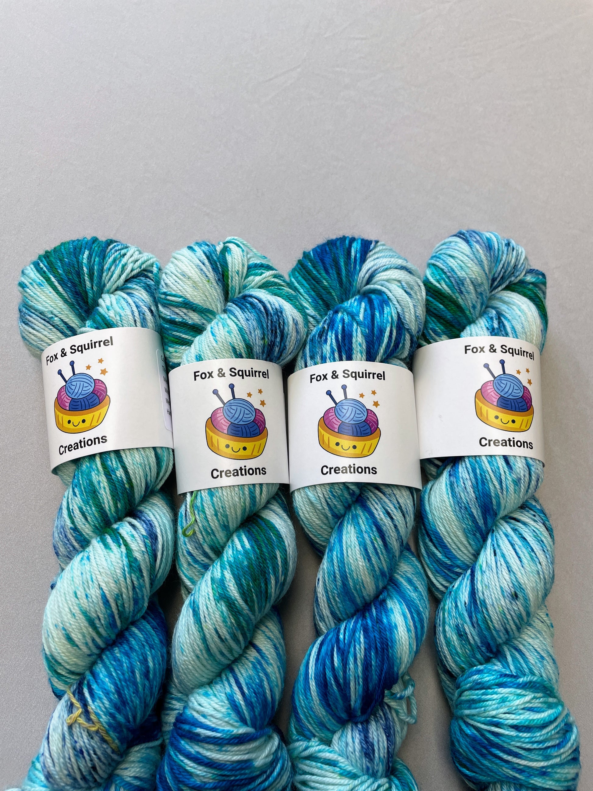 Ice Sprinkles is a speckled colourway, with speckles of different shades of blue and teal. Due to the nature of the speckling technique each skein is unique in colour depth and placement.