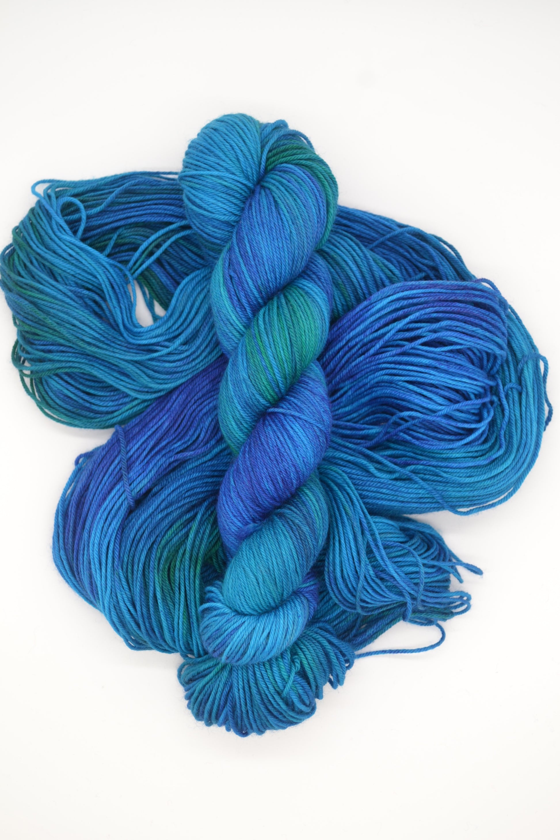 DK Merino/Nylon 012 has a Turquoise base colour with shades of Teal, Navy and Cobalt throughout the skein. A deep and rich colourway.