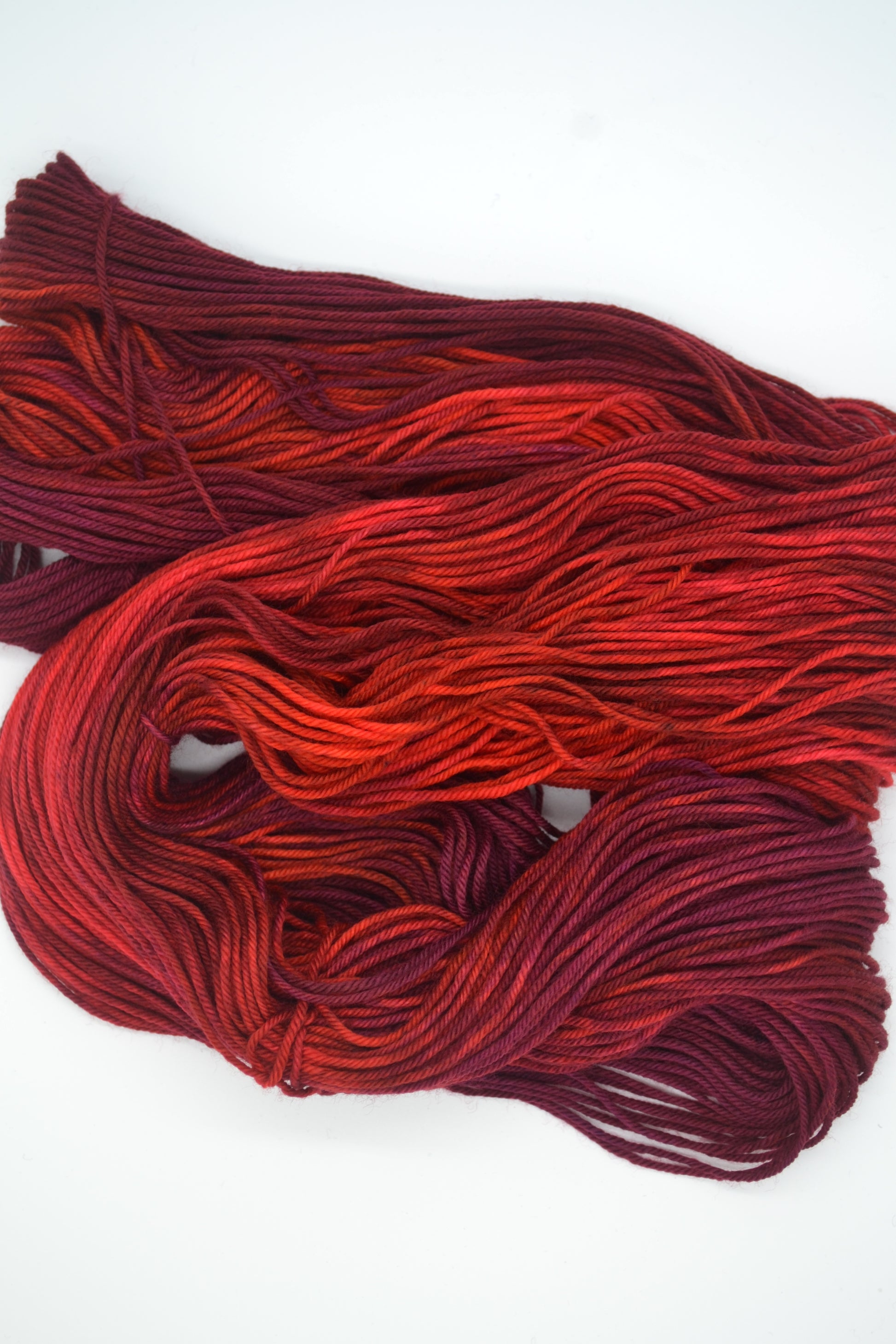 DK Merino/Nylon 020 has a Bright Red base colour with shades of Dark Red and Plum throughout the skein. A deep and rich colourway.