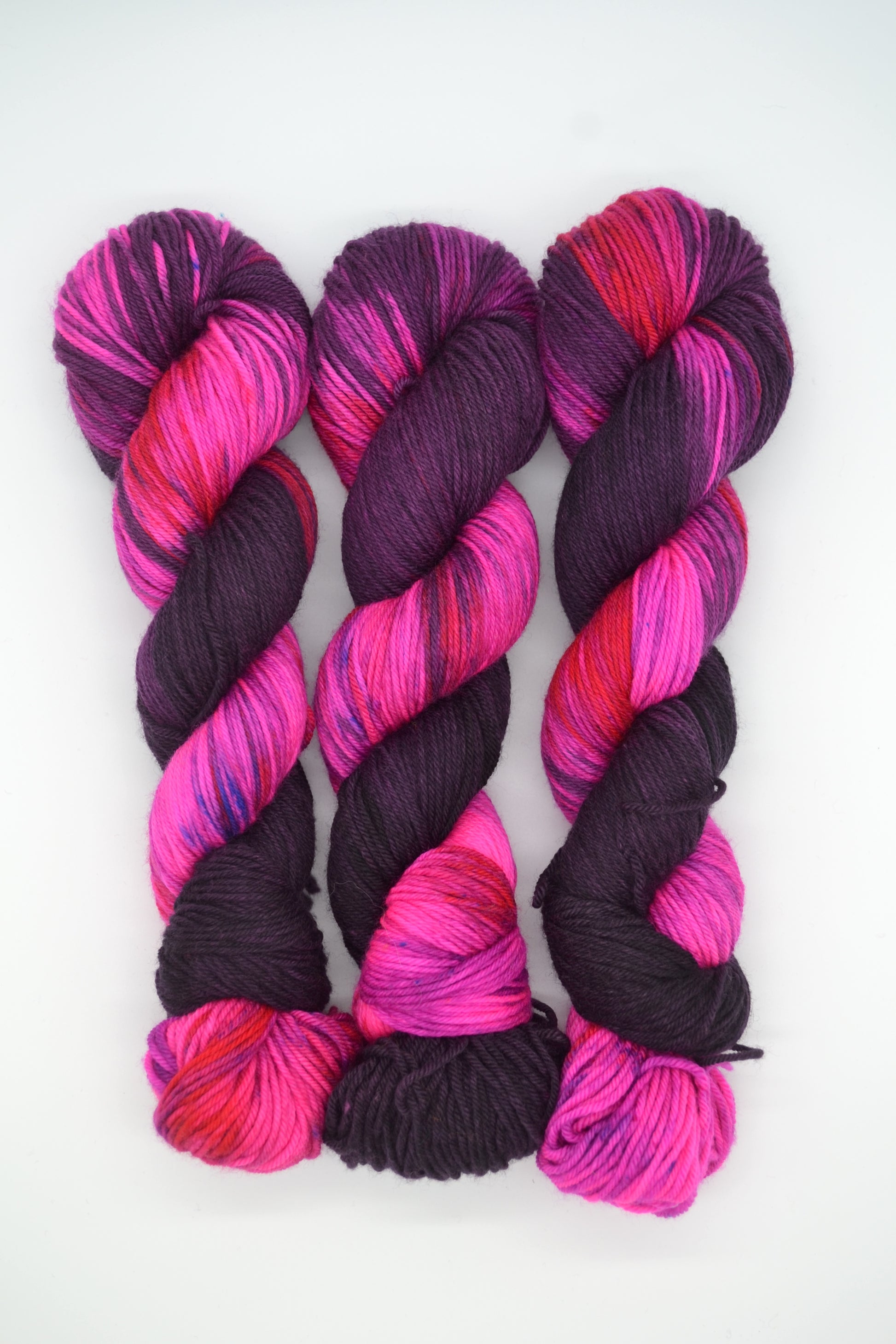 DK Merino/Nylon 023 is a two toned skein with Neon Pink at one end and Deep Plum at the other end with splashes of Red and Blue through the skein, a punchy colourway with pops of colour.
