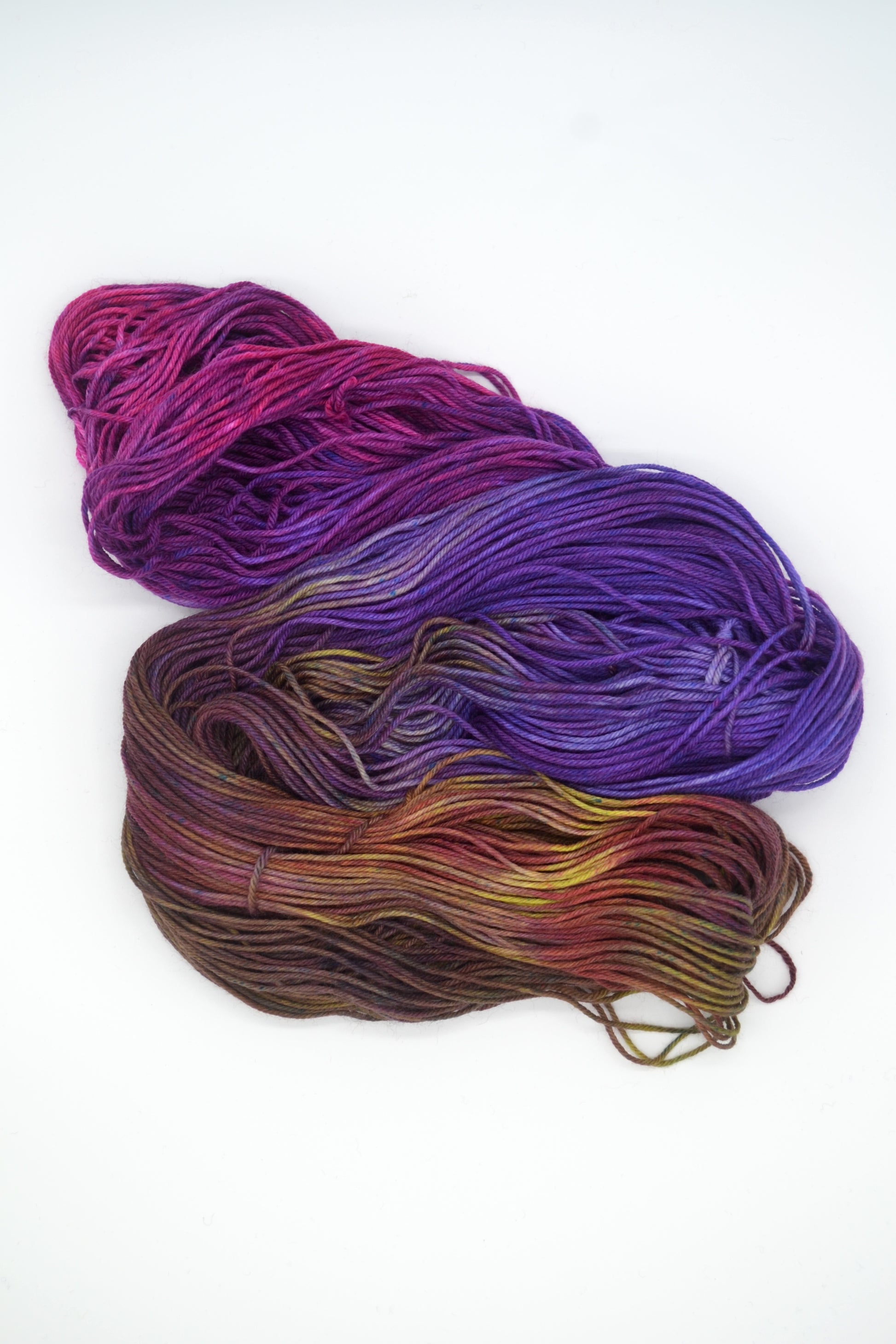 DK Merino/Nylon 033 has a shades of Purple, Pink, Olive Green and Plum, a rich colourway built on our existing Passion Flower colourway.