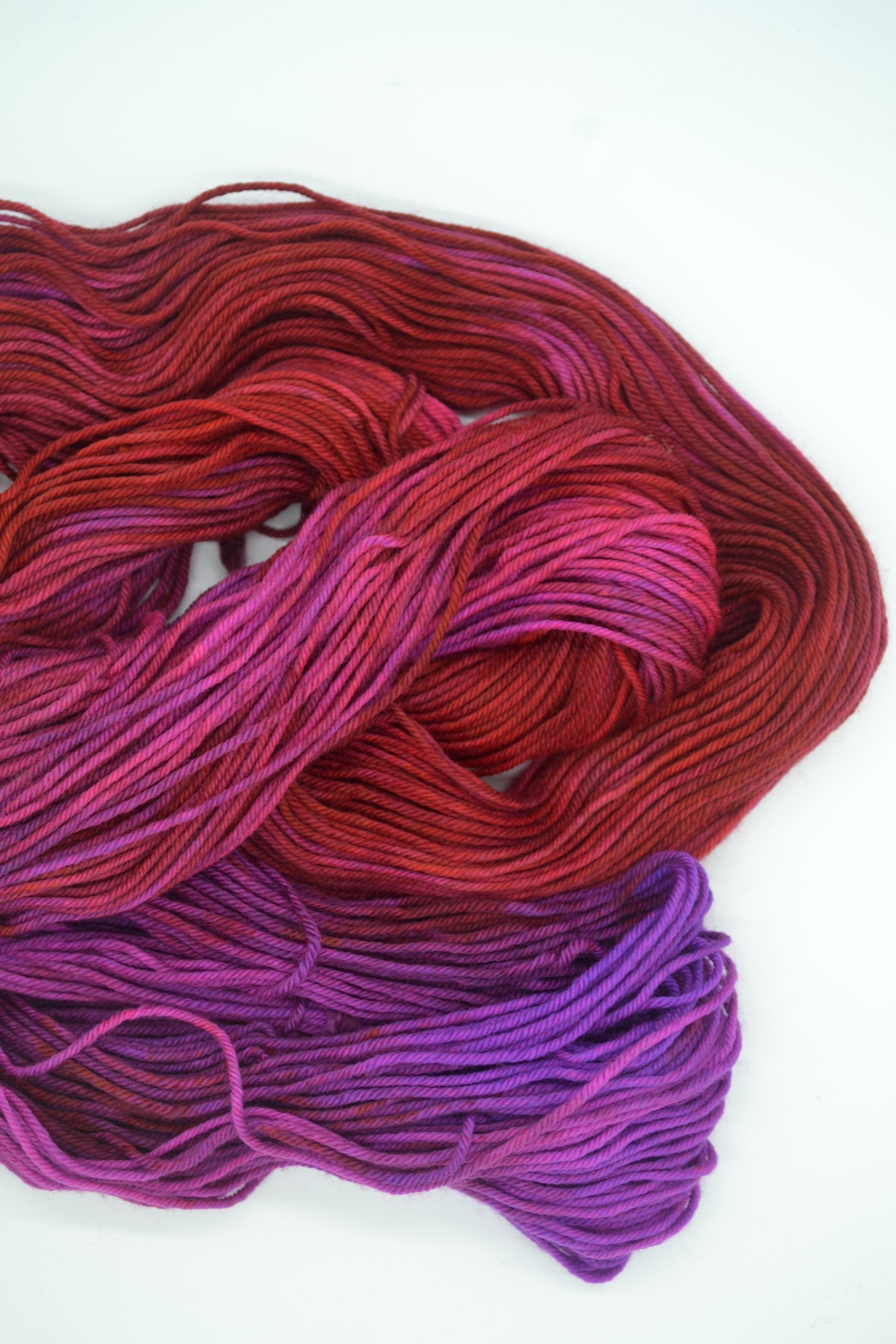 DK Merino/Nylon 018 has a Plum base colour with shades of Pink, Red and Purple throughout the skein. A deep and rich colourway.