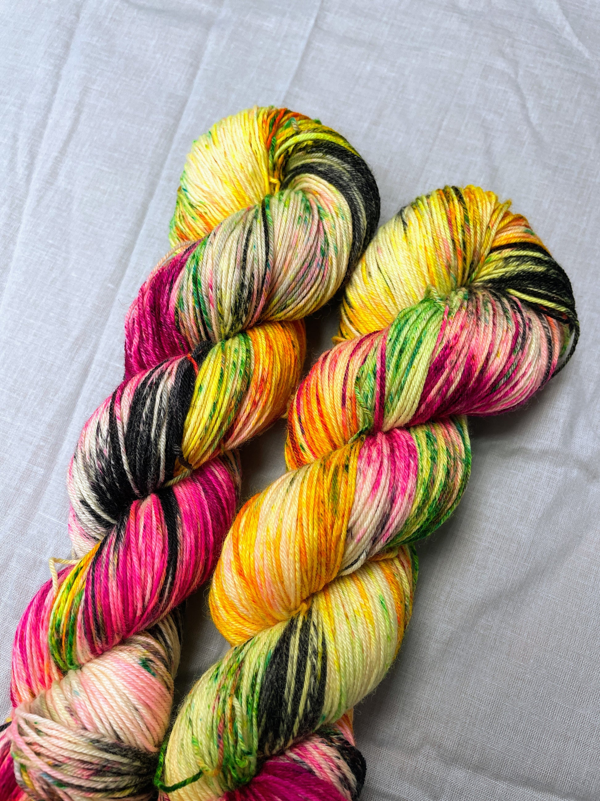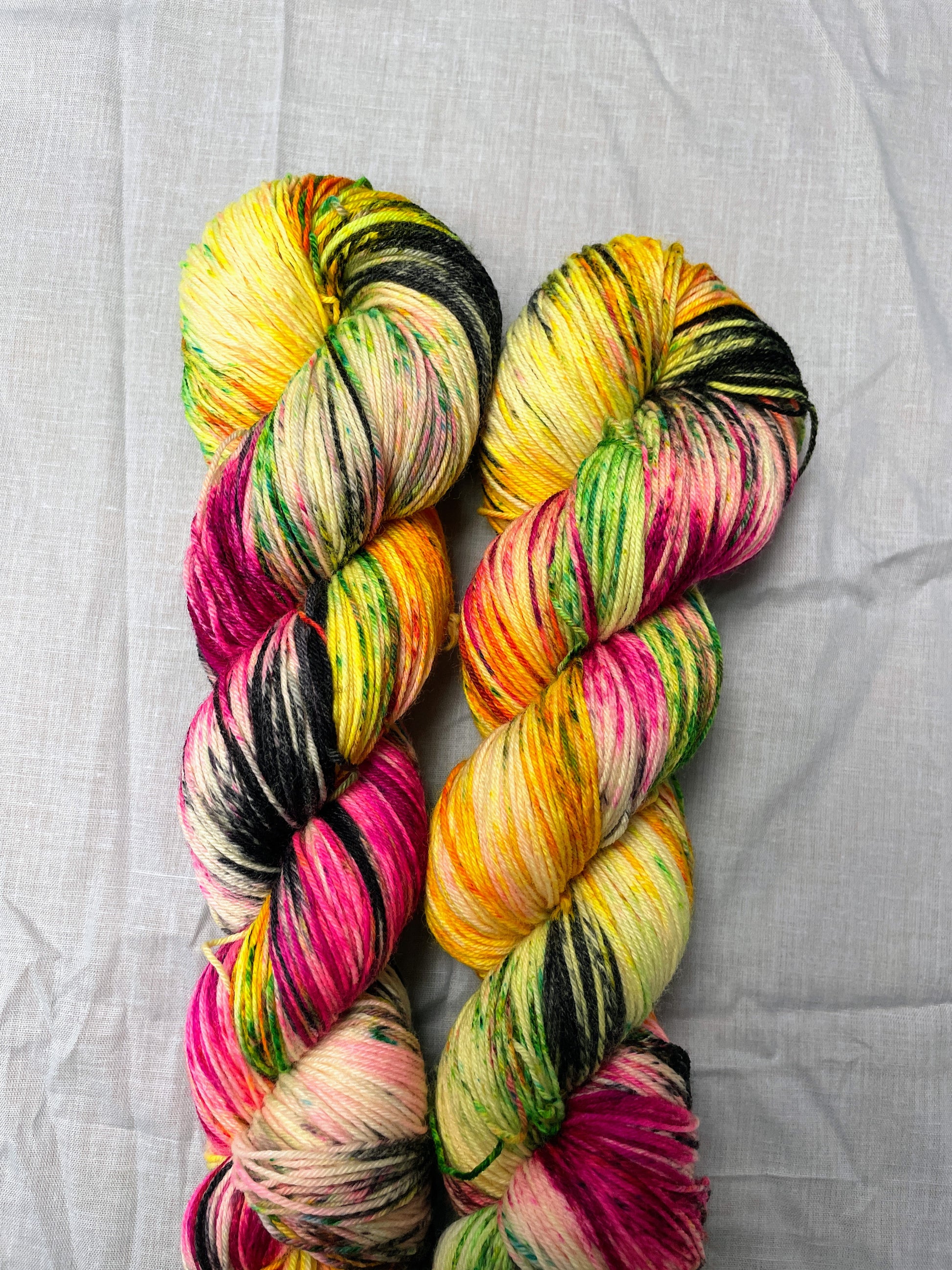 These skeins are in the Oopsies section as they were suppose to be a replication of Punk Rocker, however due to changing our technique the skeins came out more saturated than normal and there is less undyed yarn as the base. Not to be replicated again.