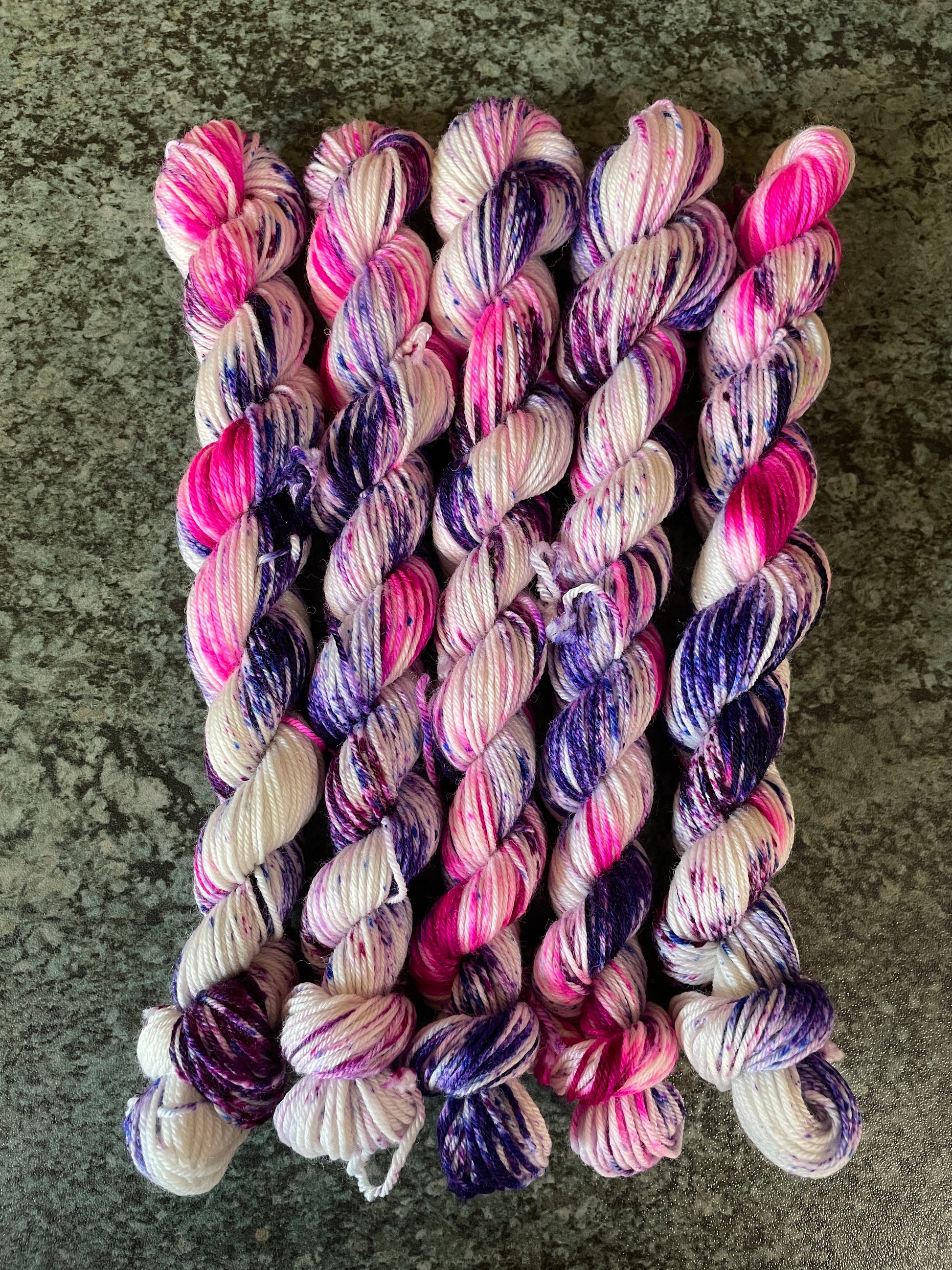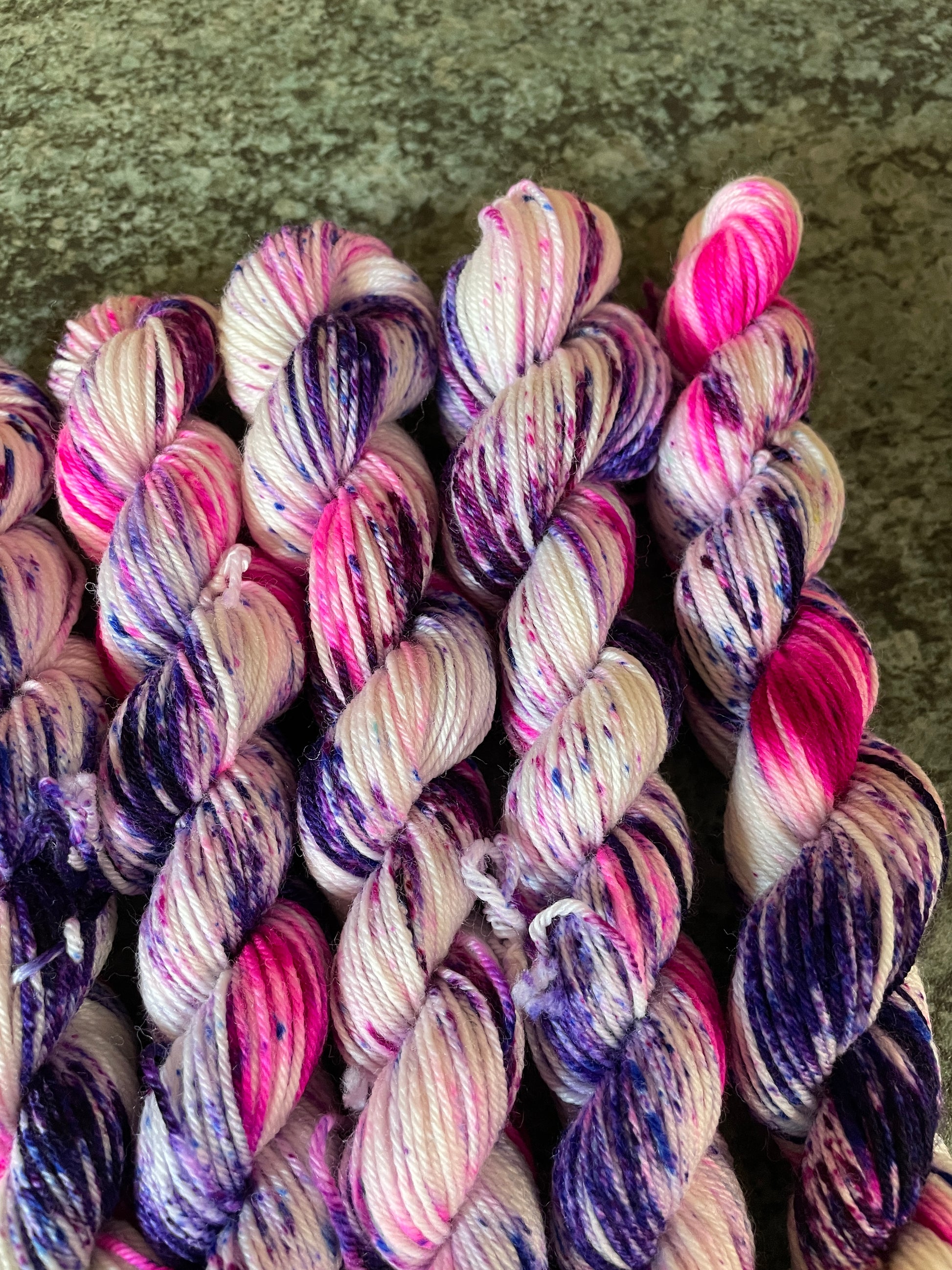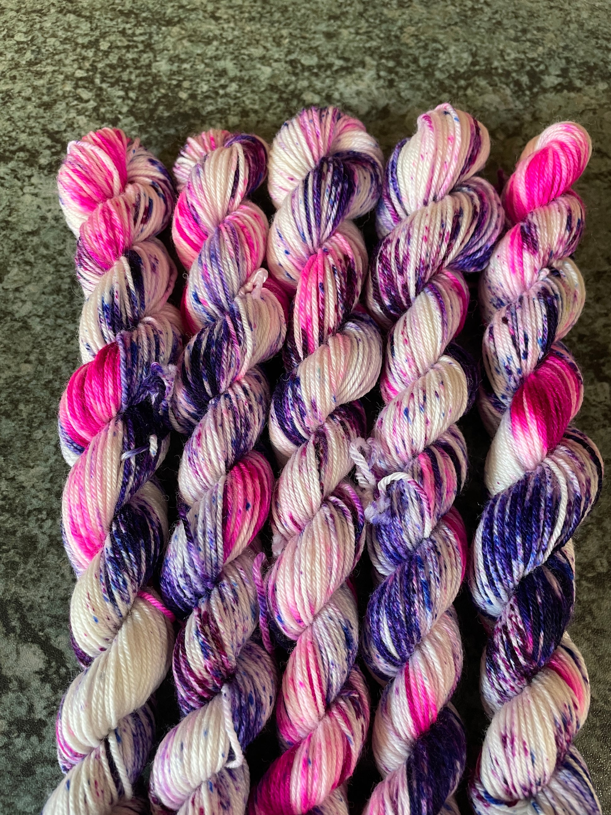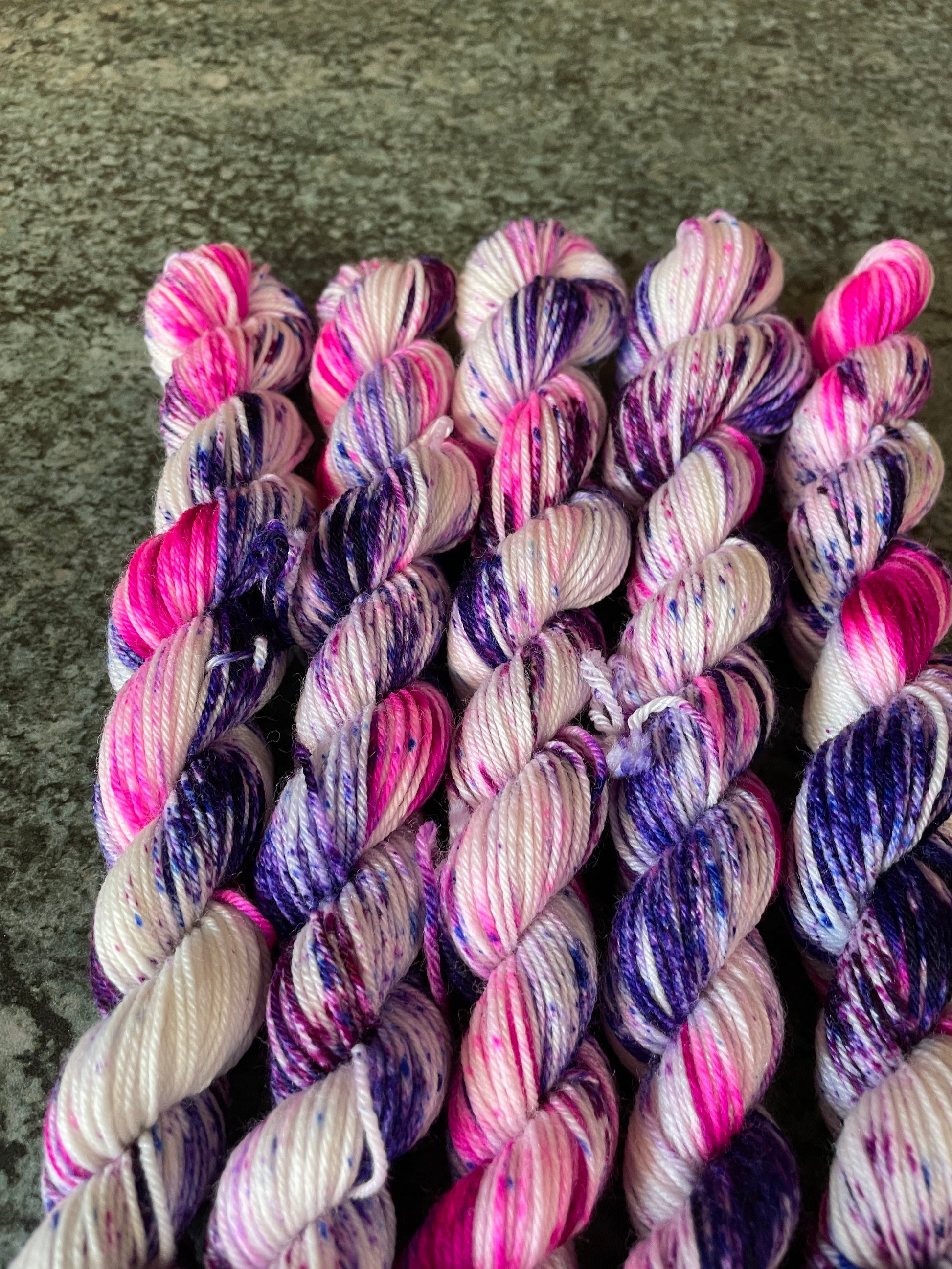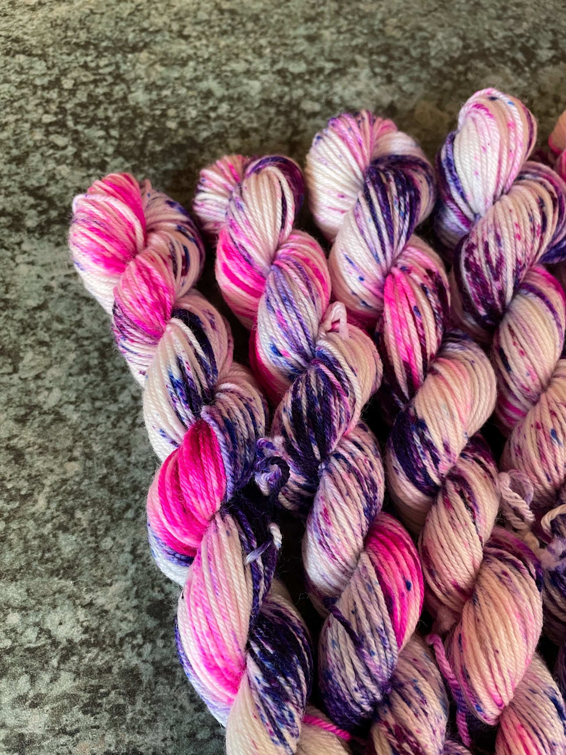 Berry Sprinkles is a speckled colourway, the base of the yarn is undyed, layered with speckles of lilac, lavender, purple, pink and raspberry. Due to the nature of the speckling technique each skein is unique in colour depth and placement.