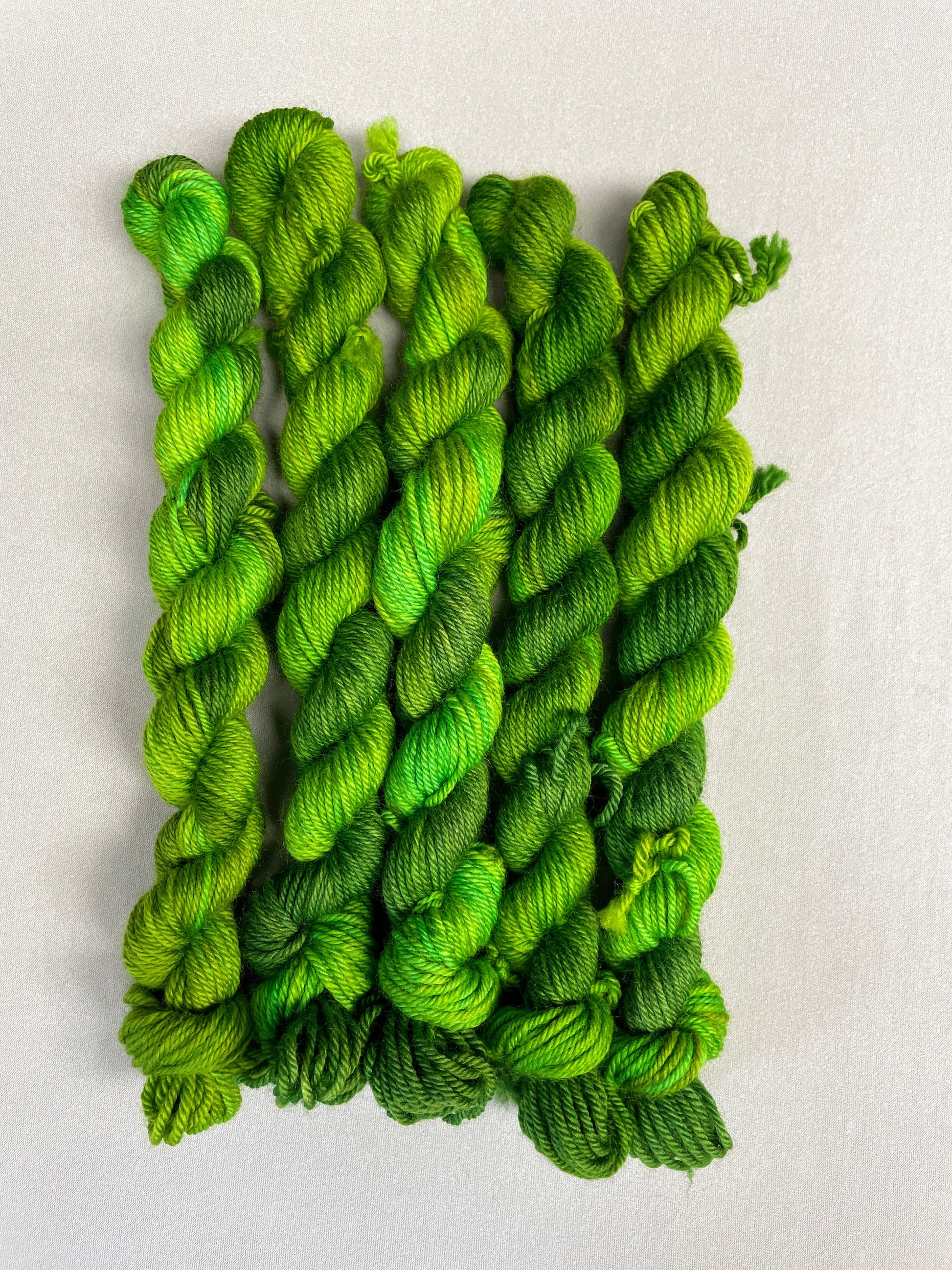 Mossy Frog is a variegated colourway with tones of Emerald, Moss Green and Olive Green. A rich, tonal colourway that pairs well with the Green/Blue semi-solids.
