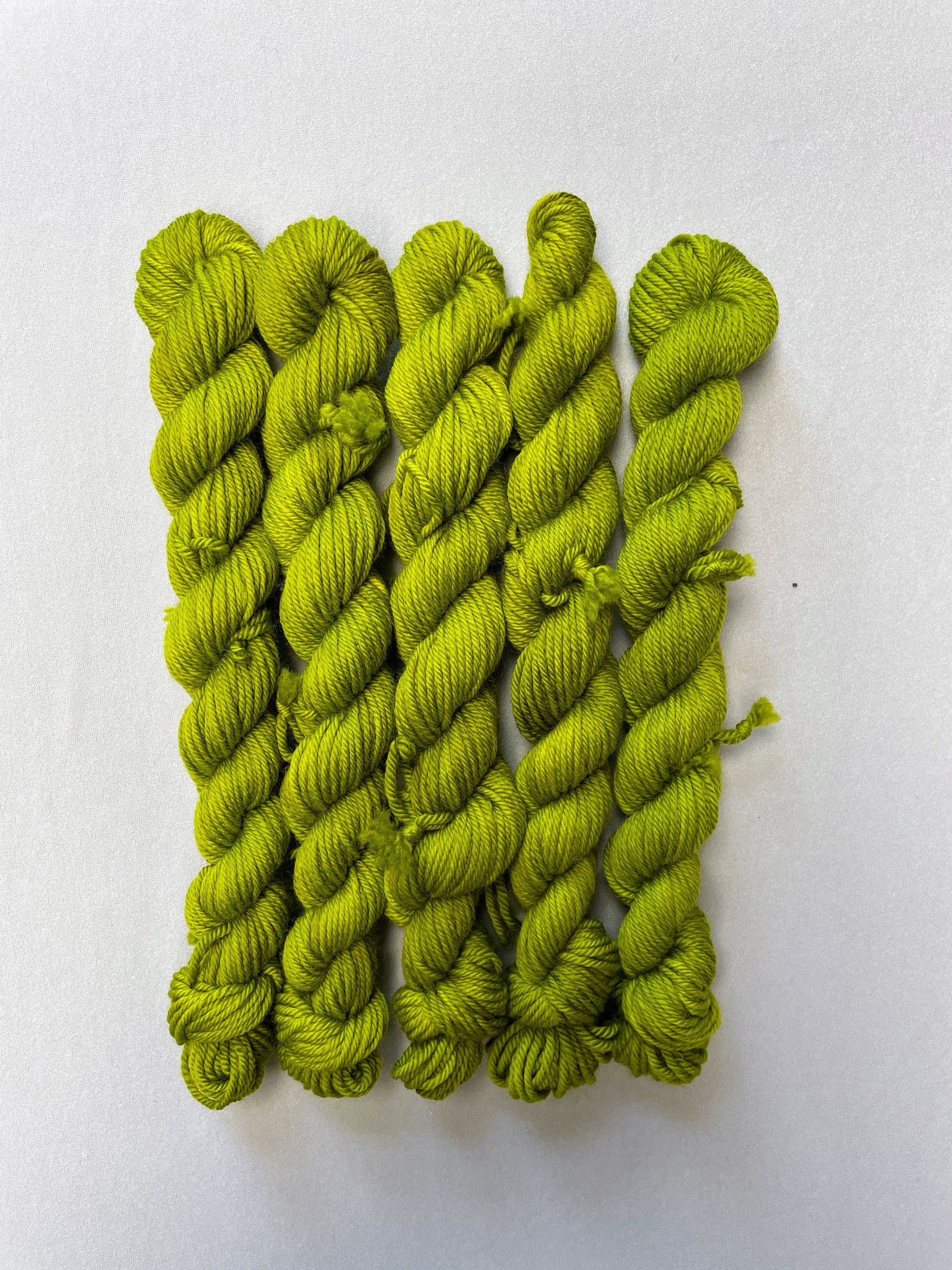 Olive Green is a semi-solid colourway, of bright, lime green. Semi-solids pair well with variegated colourways or to add variation to a big project, they are great for contrasting heel and toes on a pair of socks.