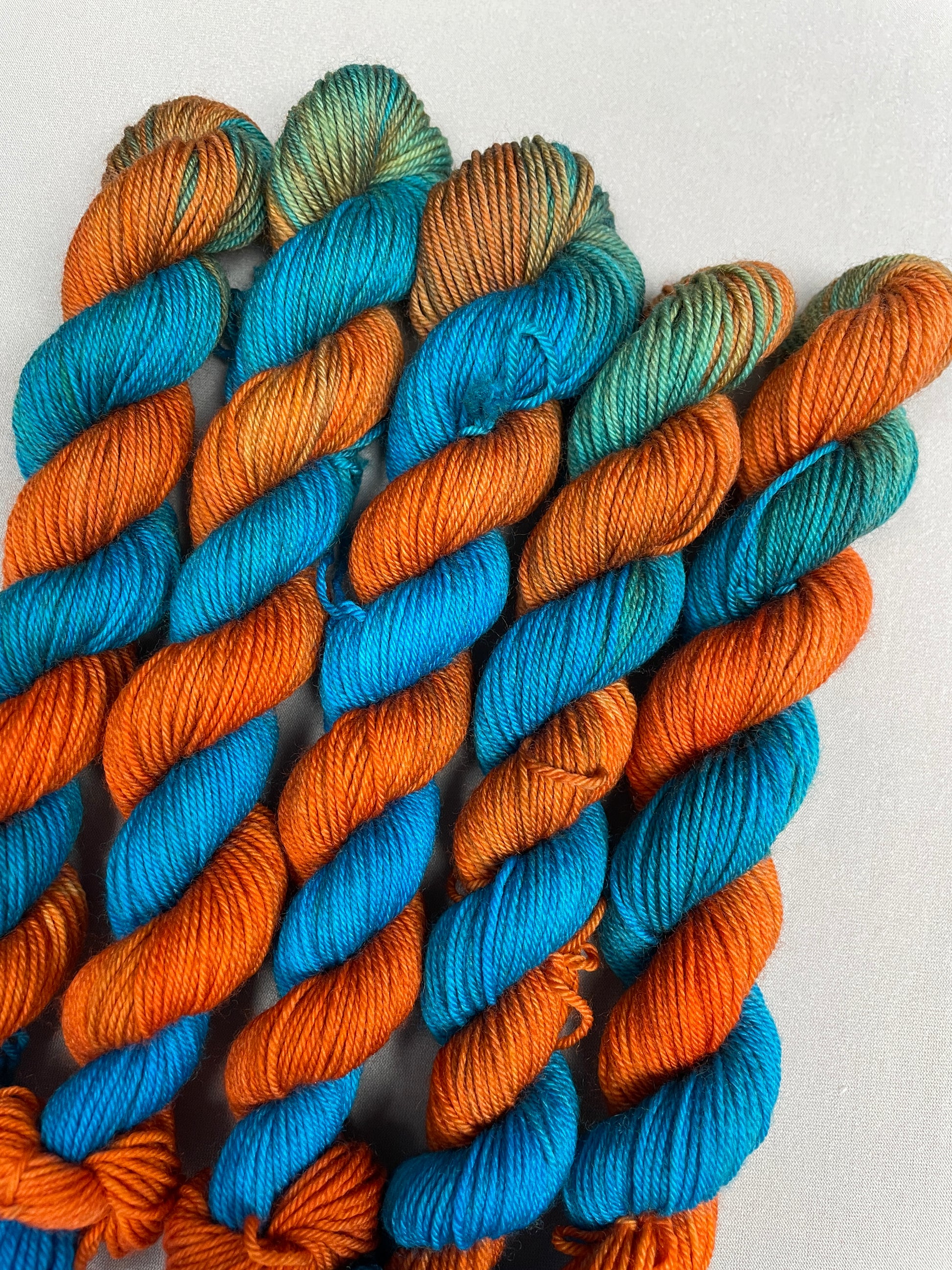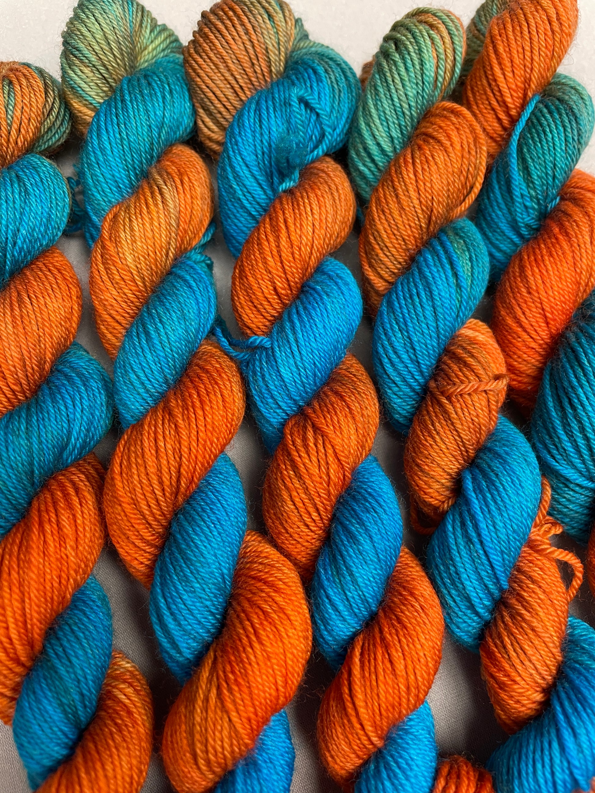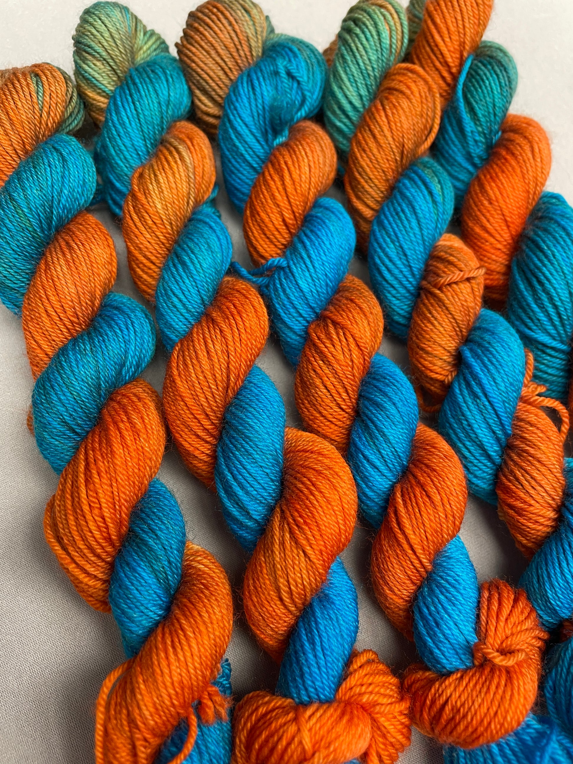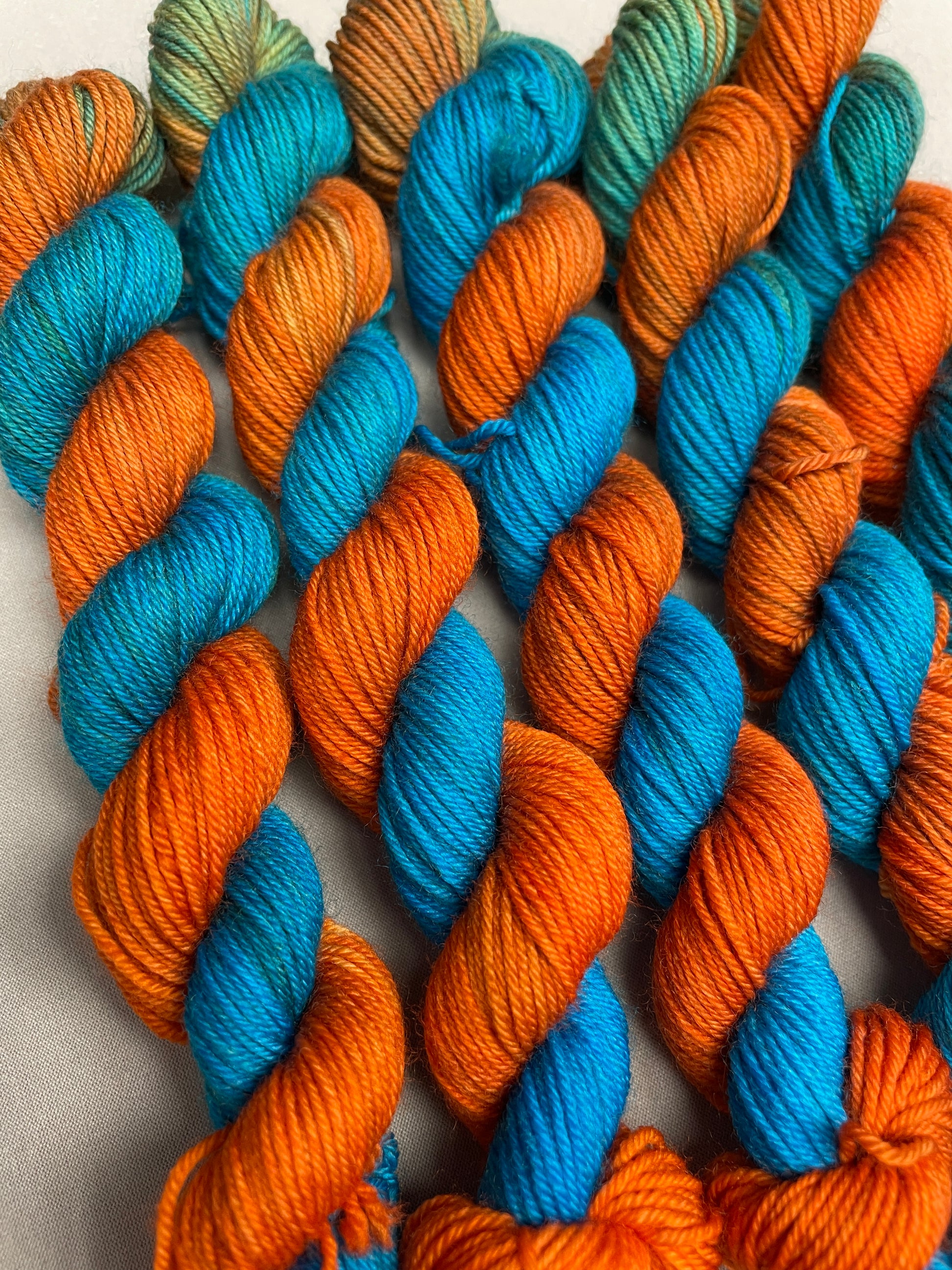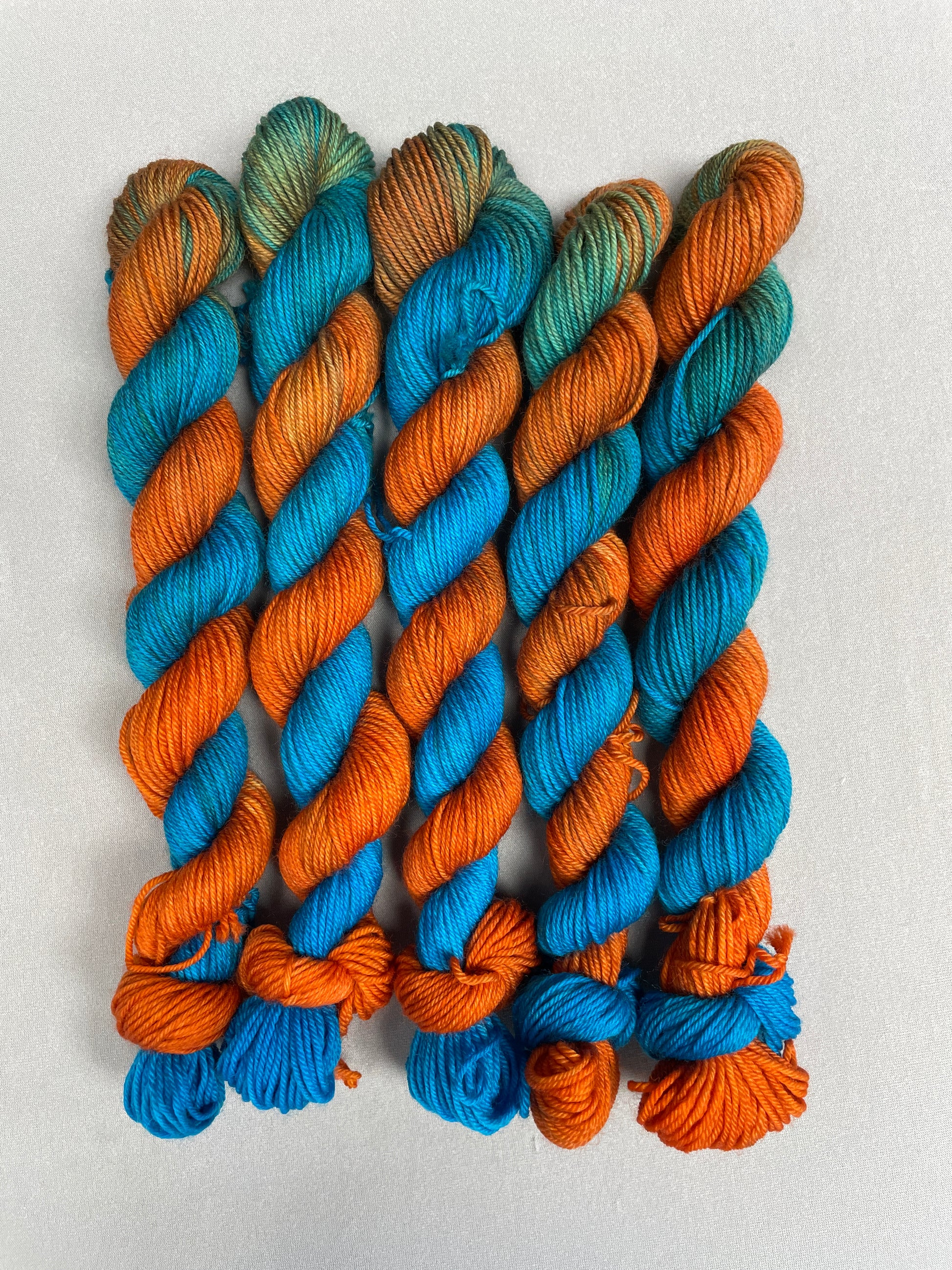 Fire & Ice is a two toned contrasting variegated colourway, one half is turquoise and the other half is orange. A bold colourway that pairs well with the Blue/Orange semi-solids.