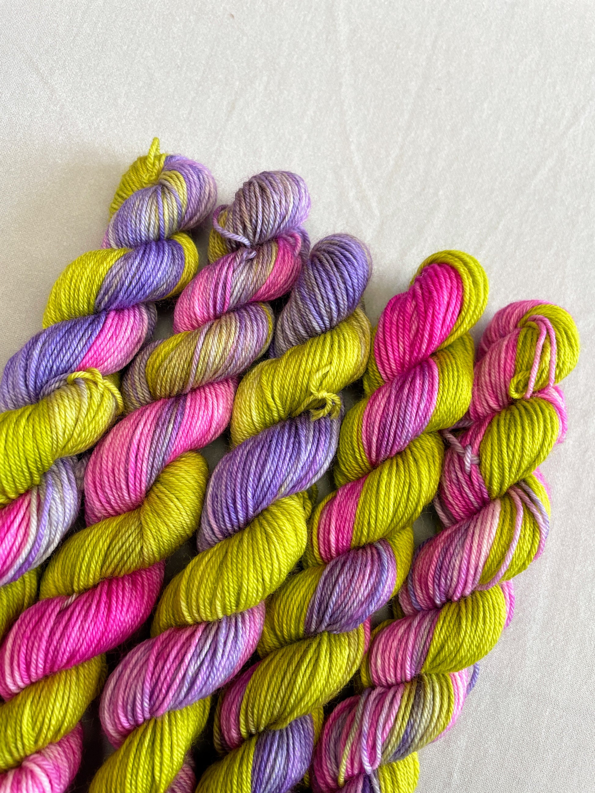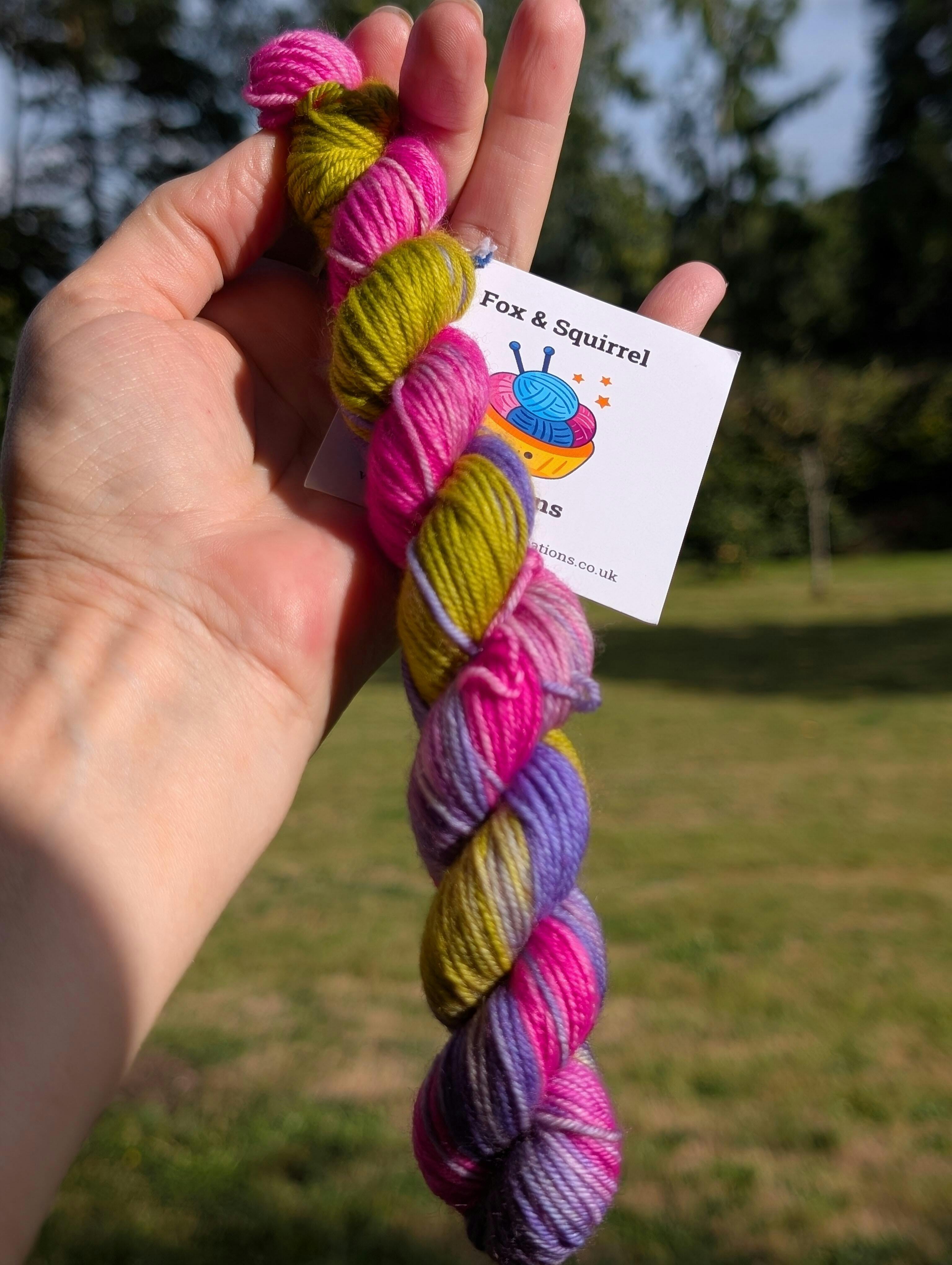 Passion Flower is bright and bold with shades of Lime Green, Lilac and Pink. A refreshing colourway that would add a zing to your next yarn project.