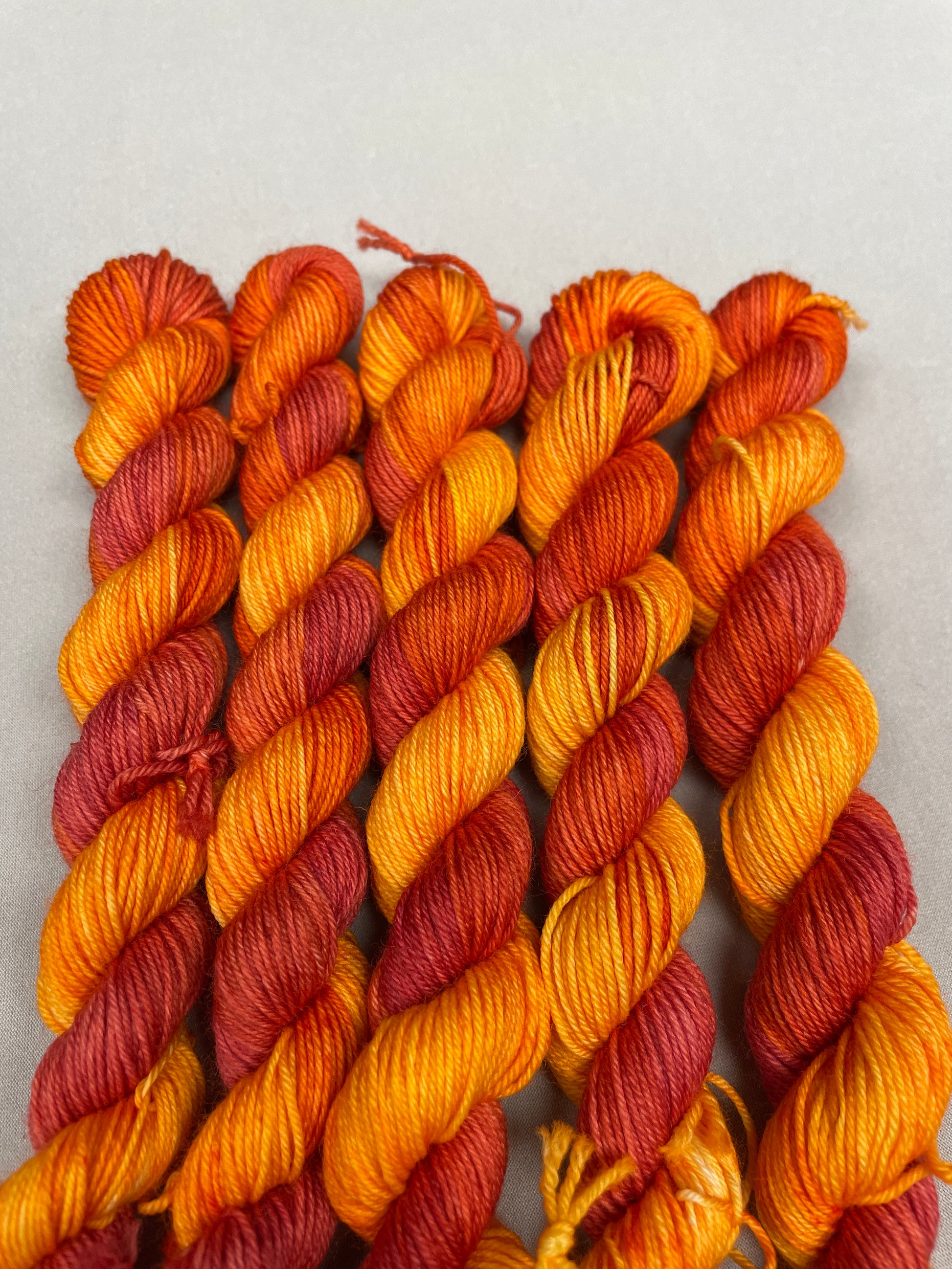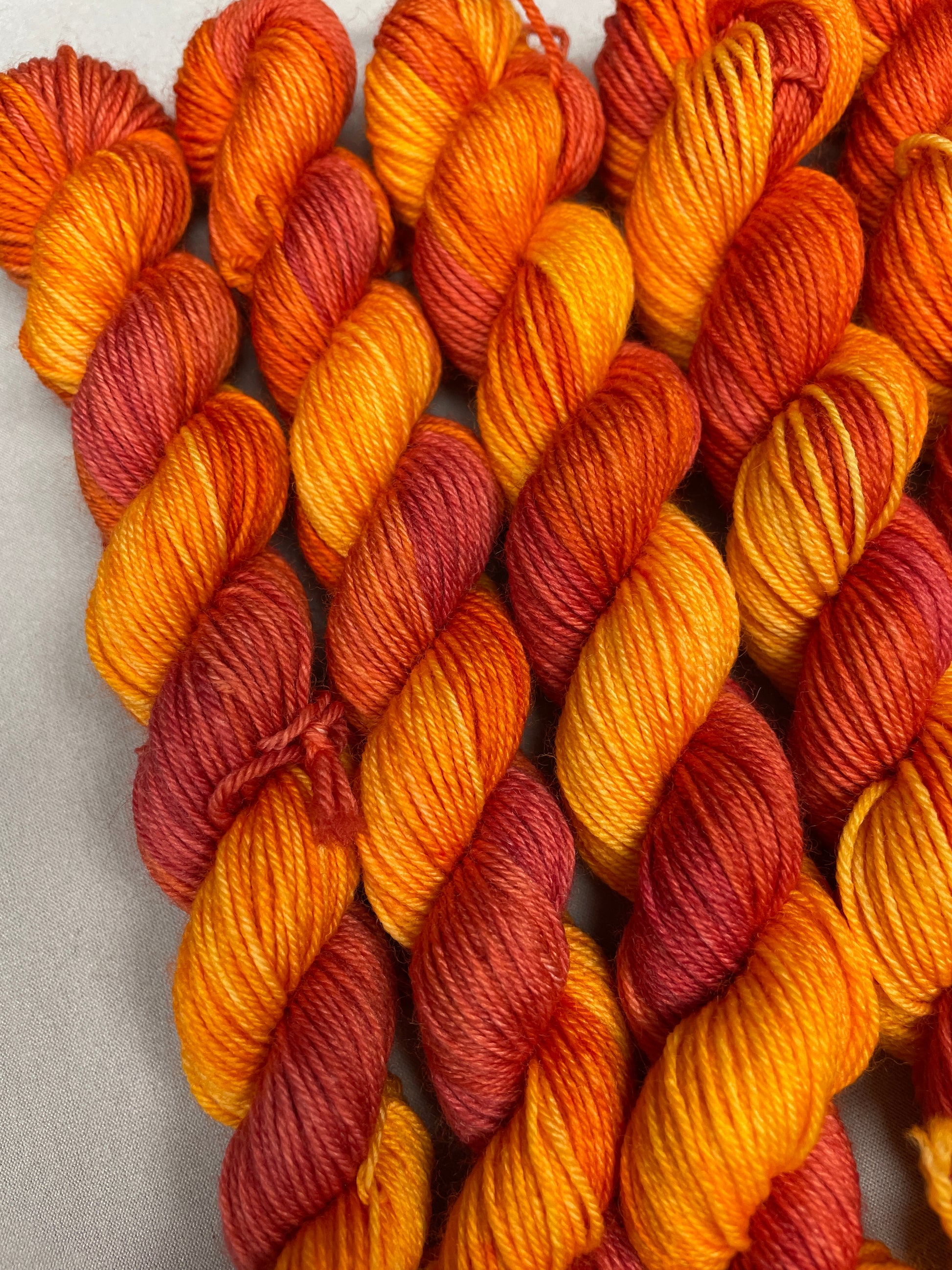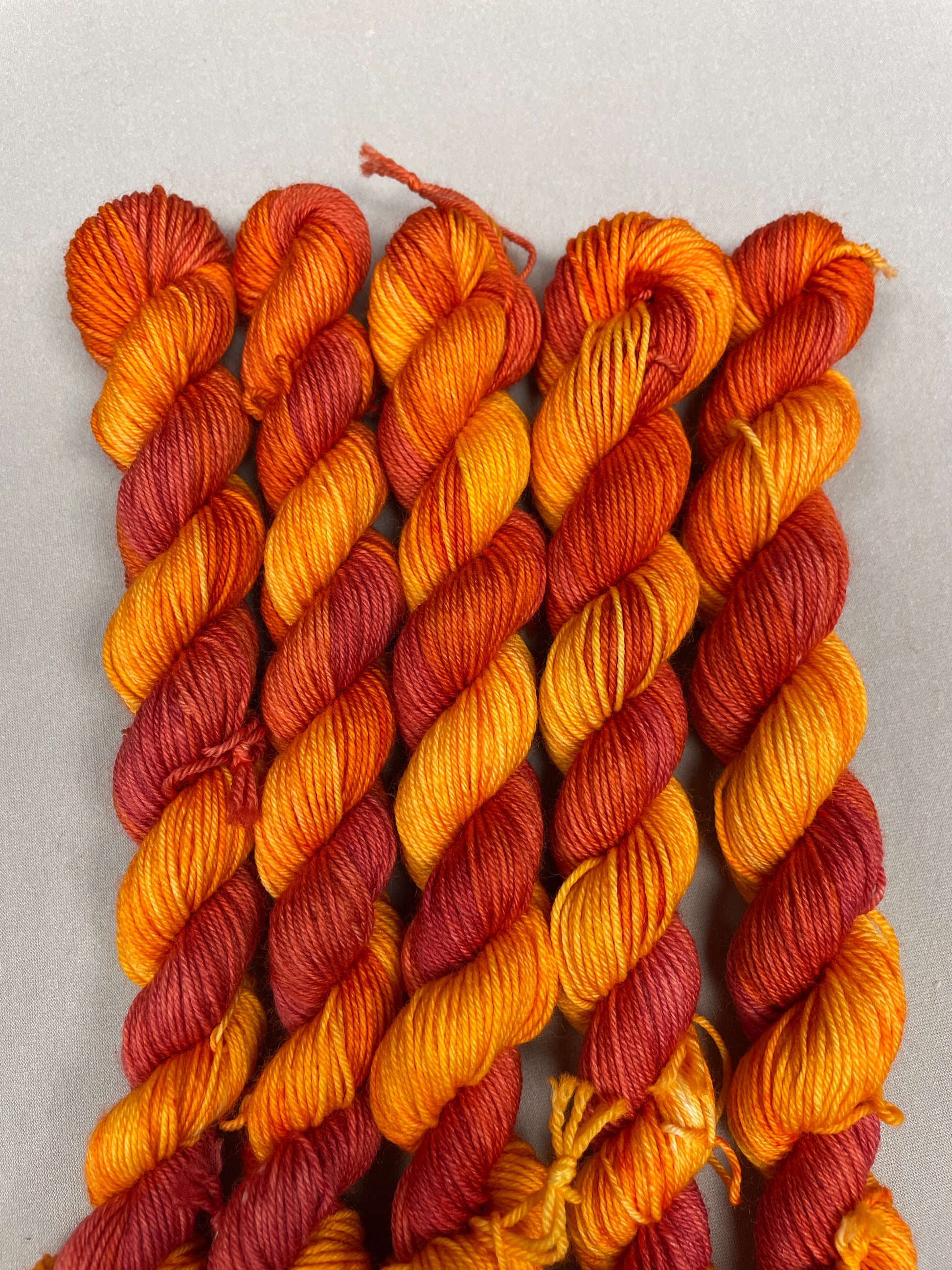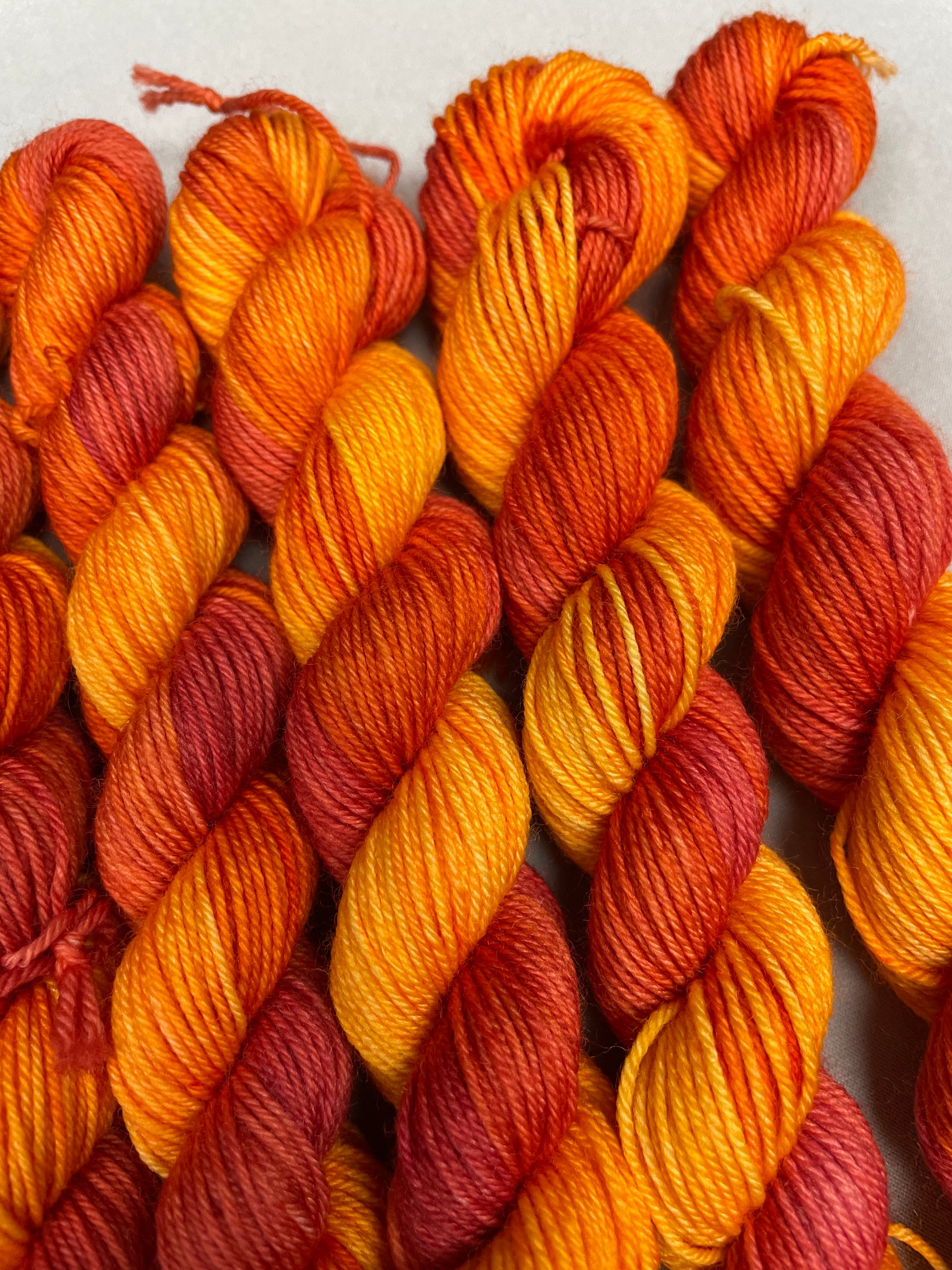 Phoenix is a variegated colourway with tones of Ruby Red, Golden Poppy and Saffron. A warming colourway that pairs well with the Yellow/Orange semi-solids.