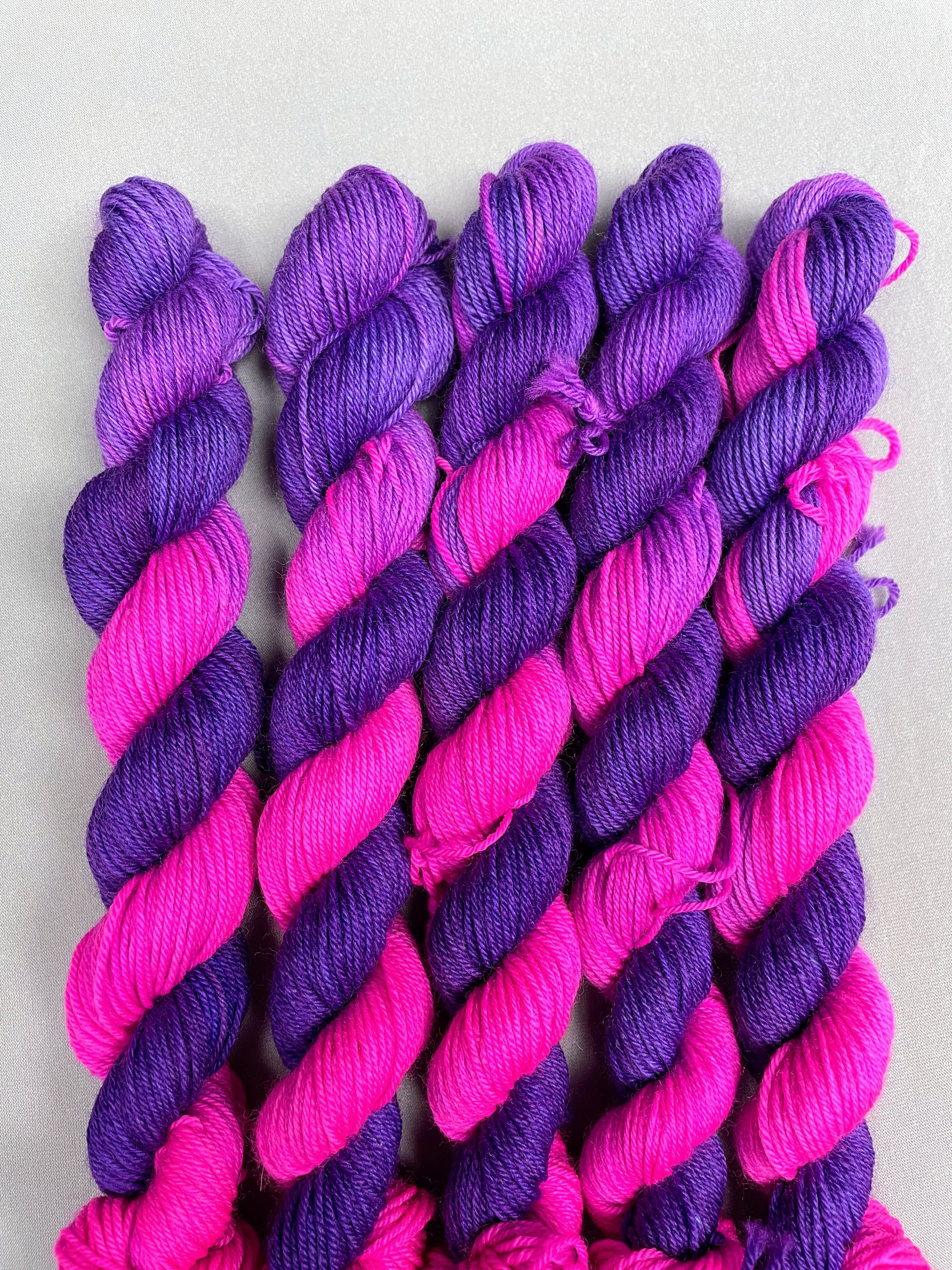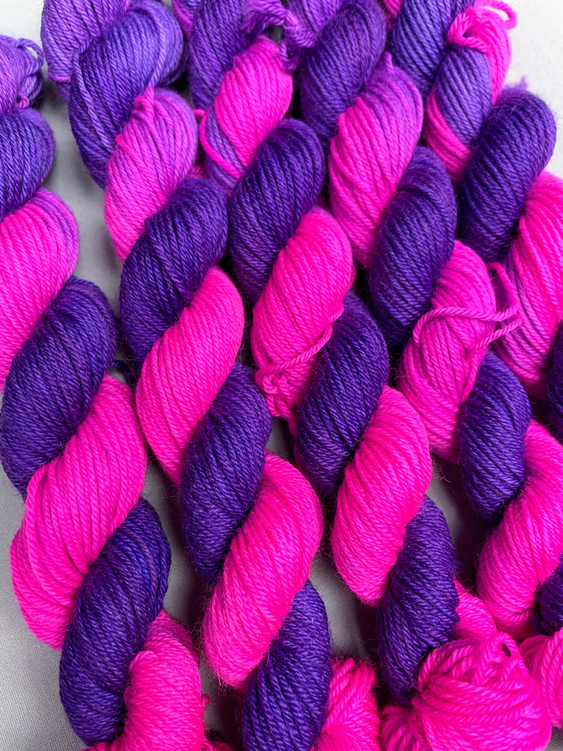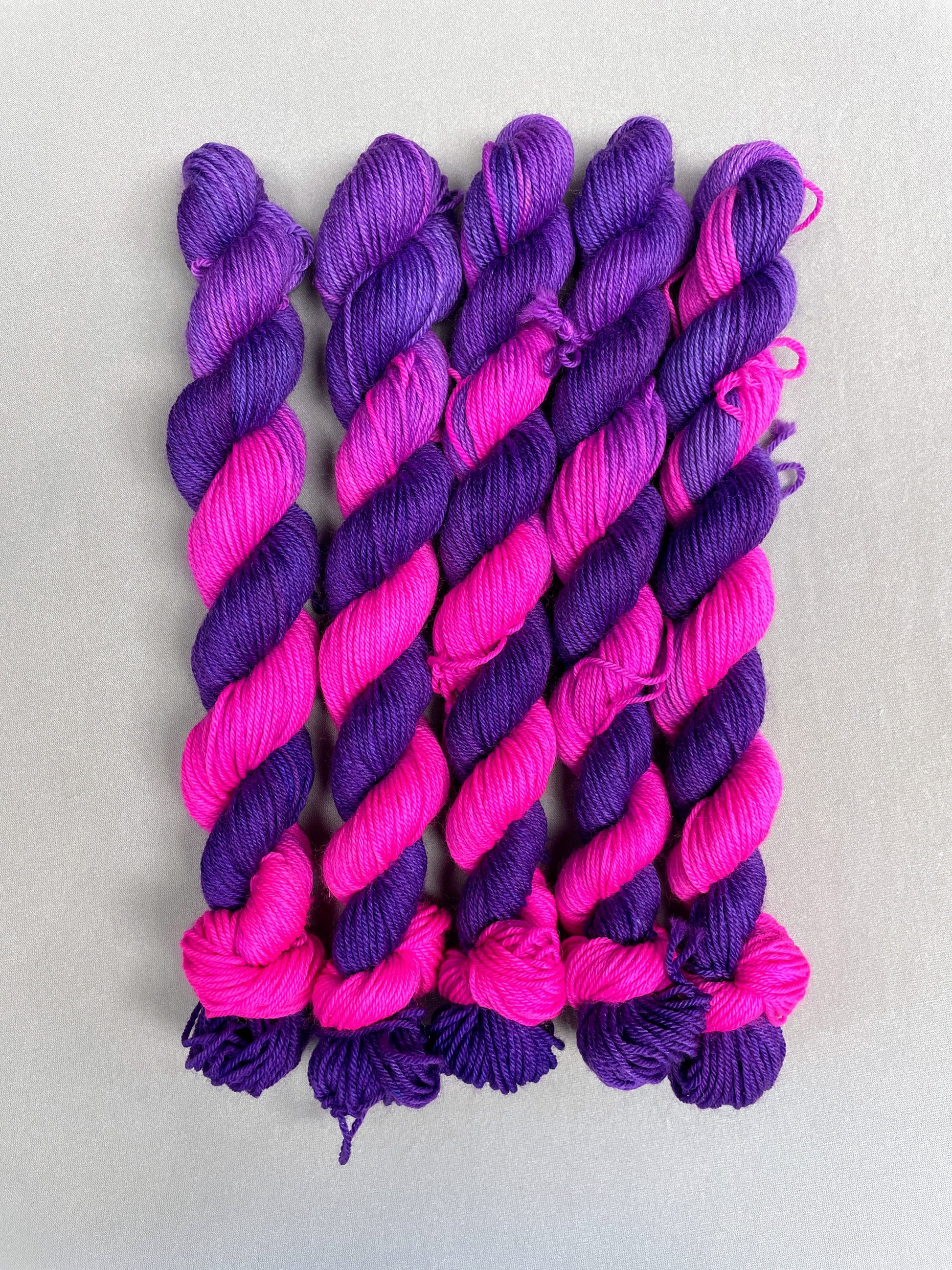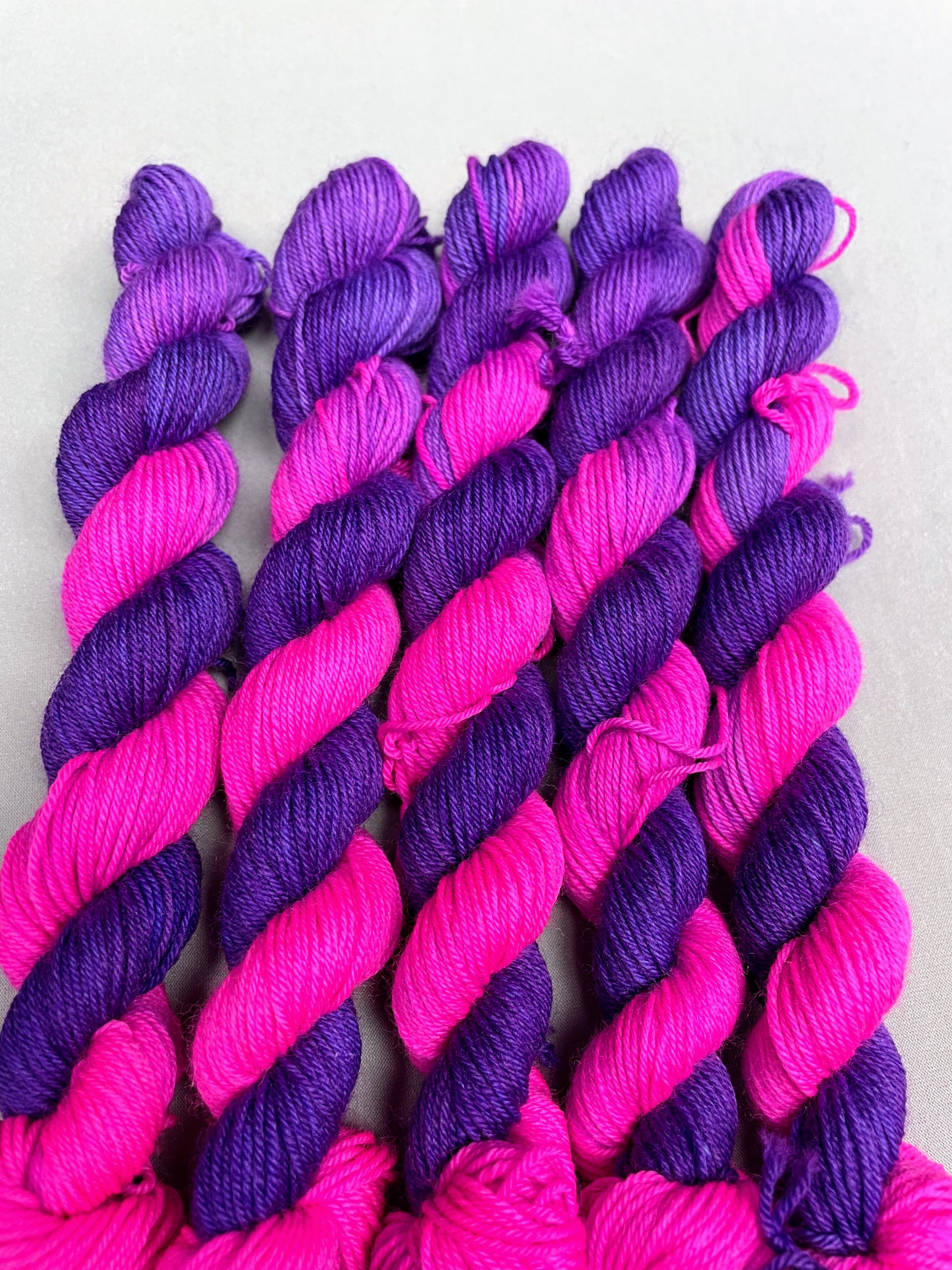 Purple Fizz is a two toned contrasting variegated colourway, one half is Neon Pink and the other half is Purple. A bold colourway that pairs well with the neon semi-solids.