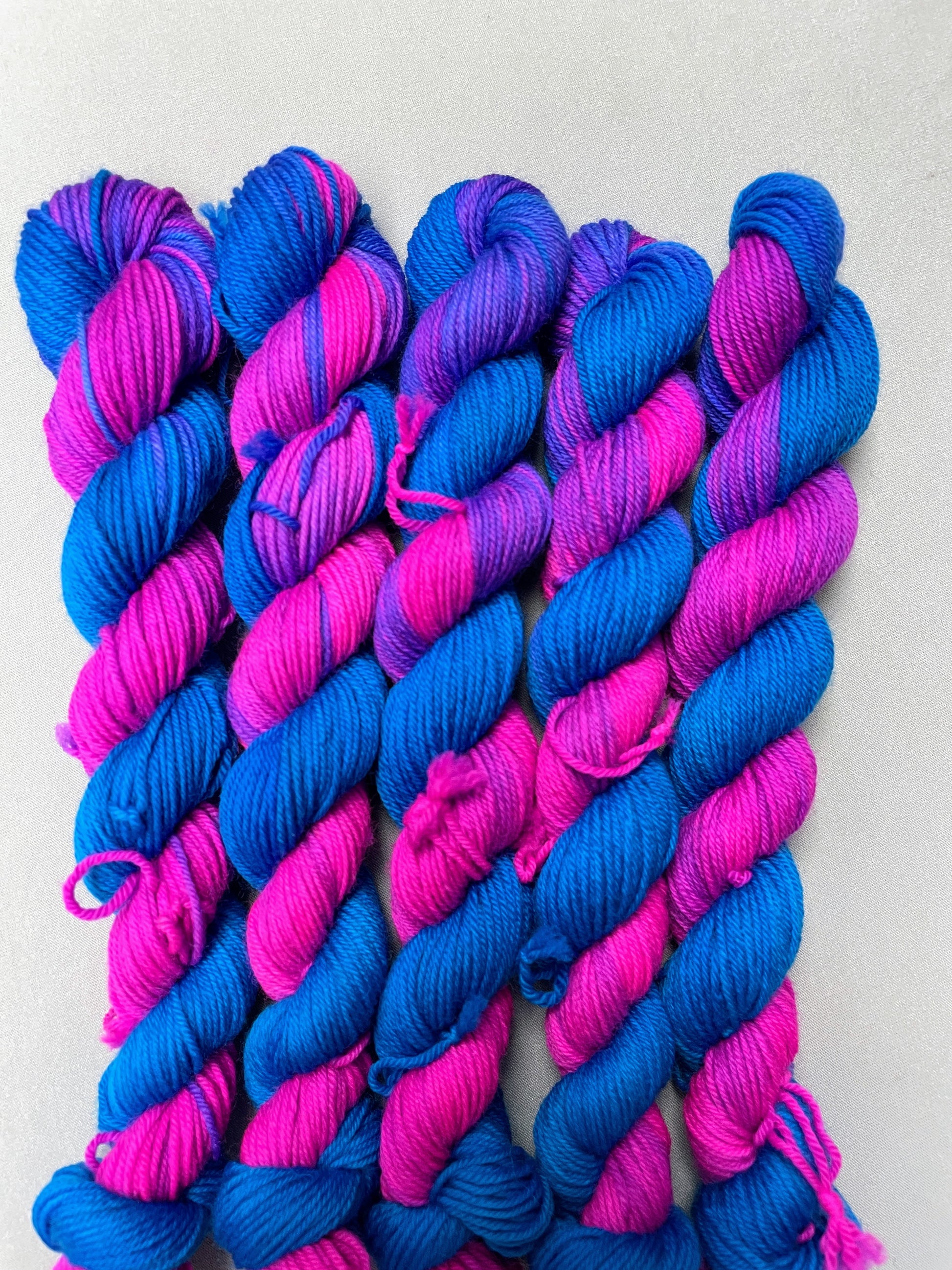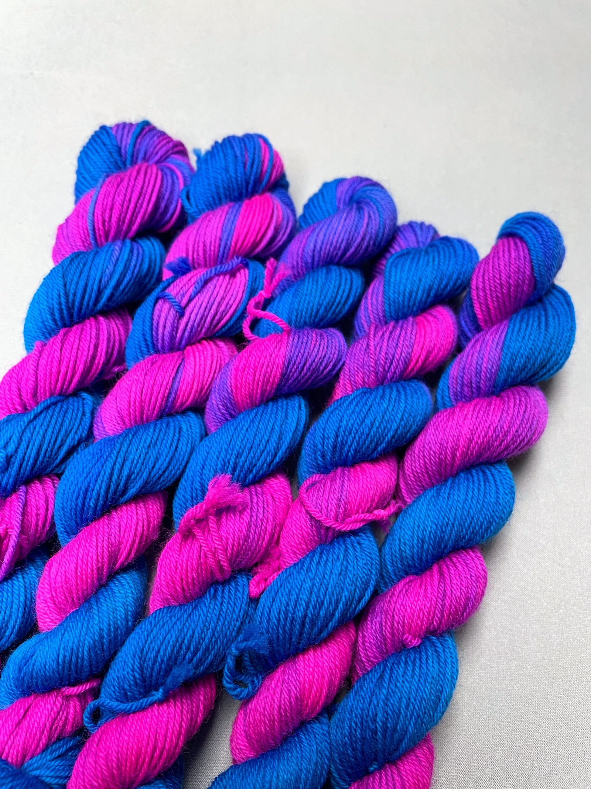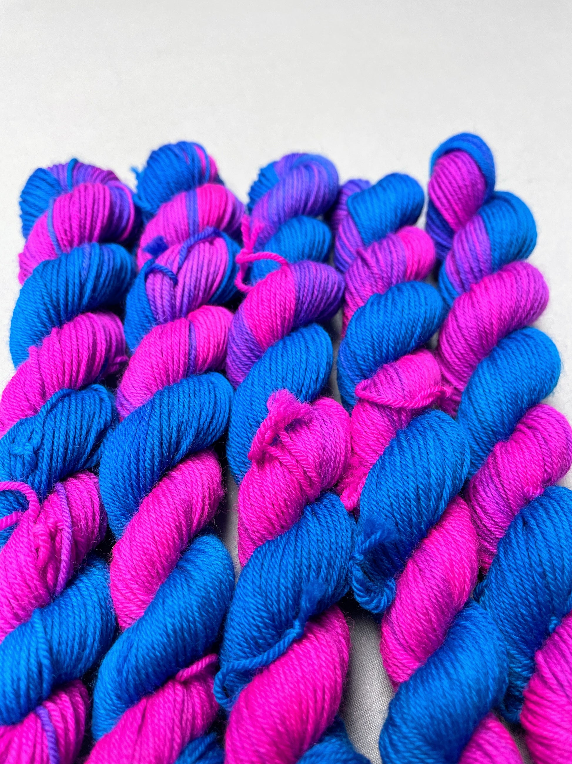 Rave is a two toned contrasting variegated colourway, one half is Neon Magenta and the other half is Bright Blue. A bold colourway that pairs well with the neon semi-solids.