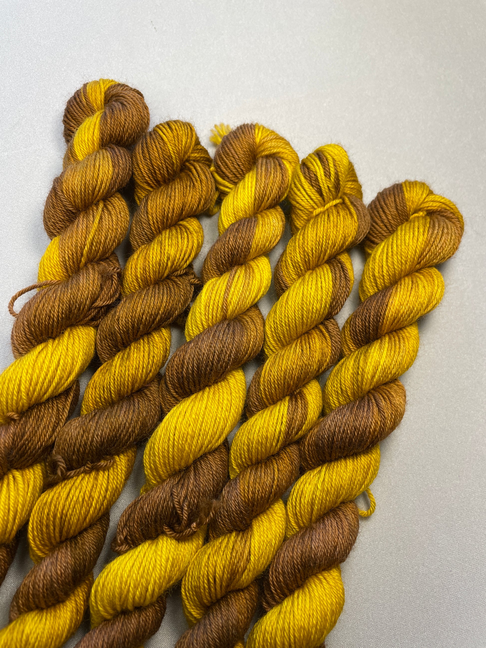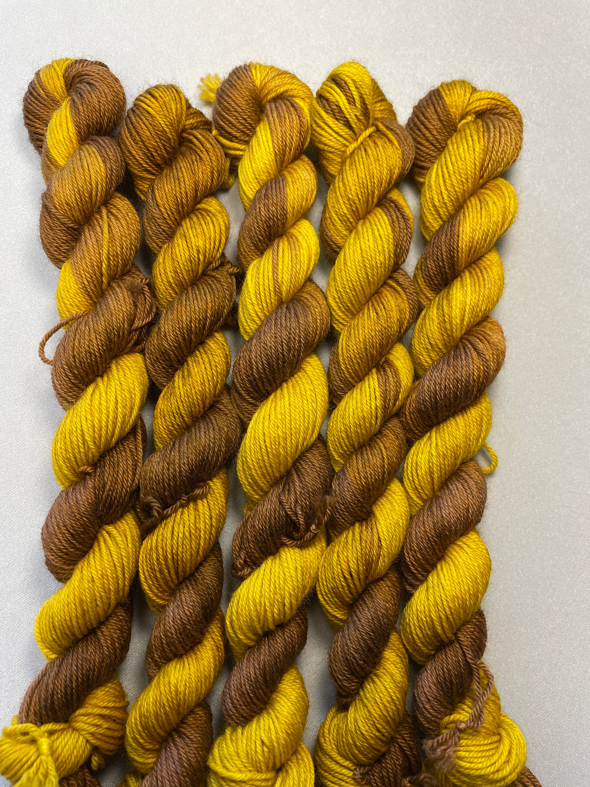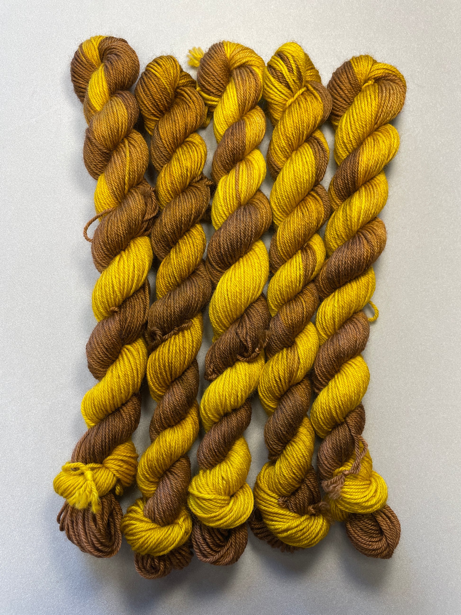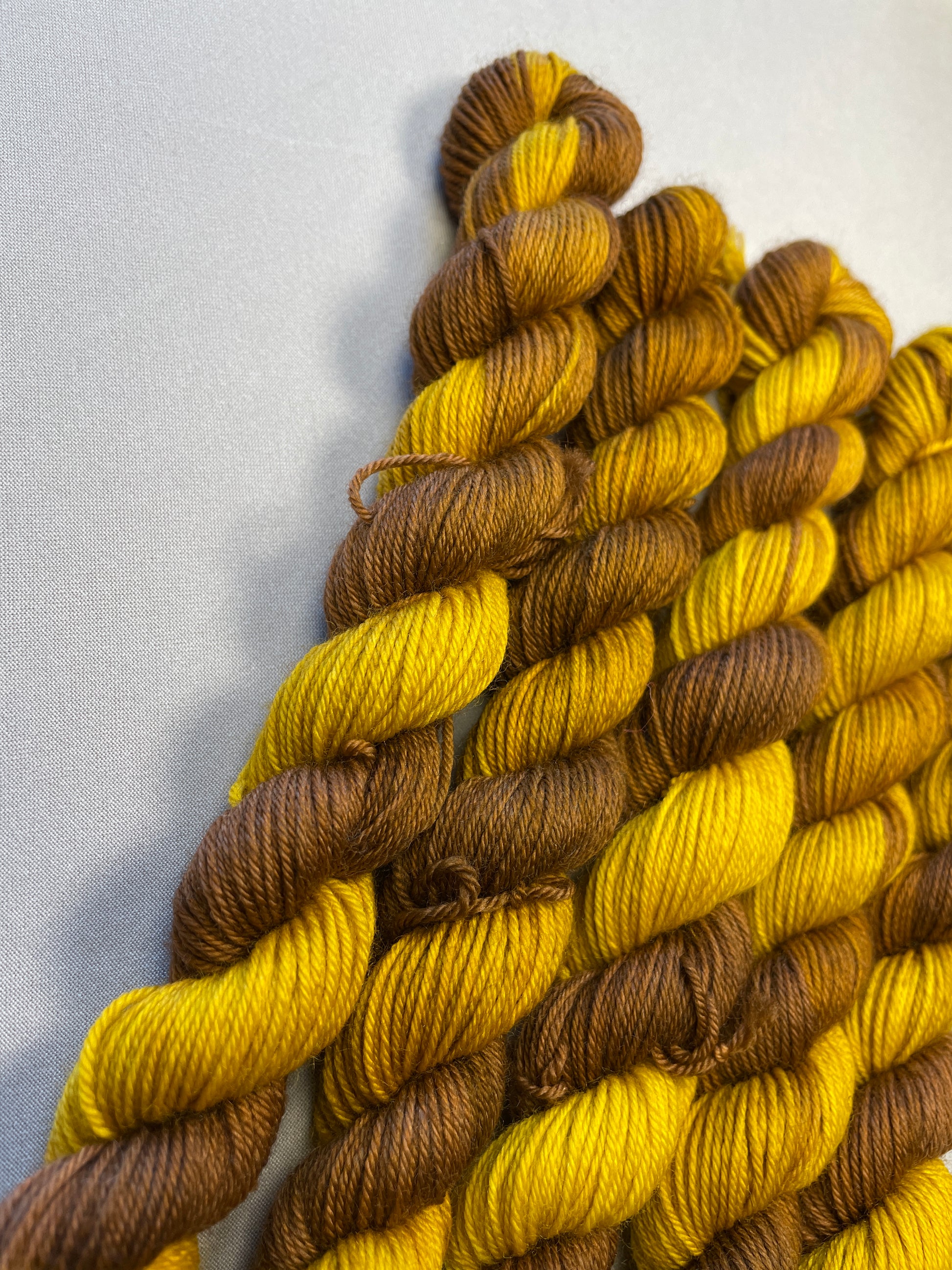 Salted Caramel is a two toned variegated colourway, one half is mustard and the other half is chocolate brown. A warm colourway that pairs well with the Yellow/Brown?Orange semi-solids.