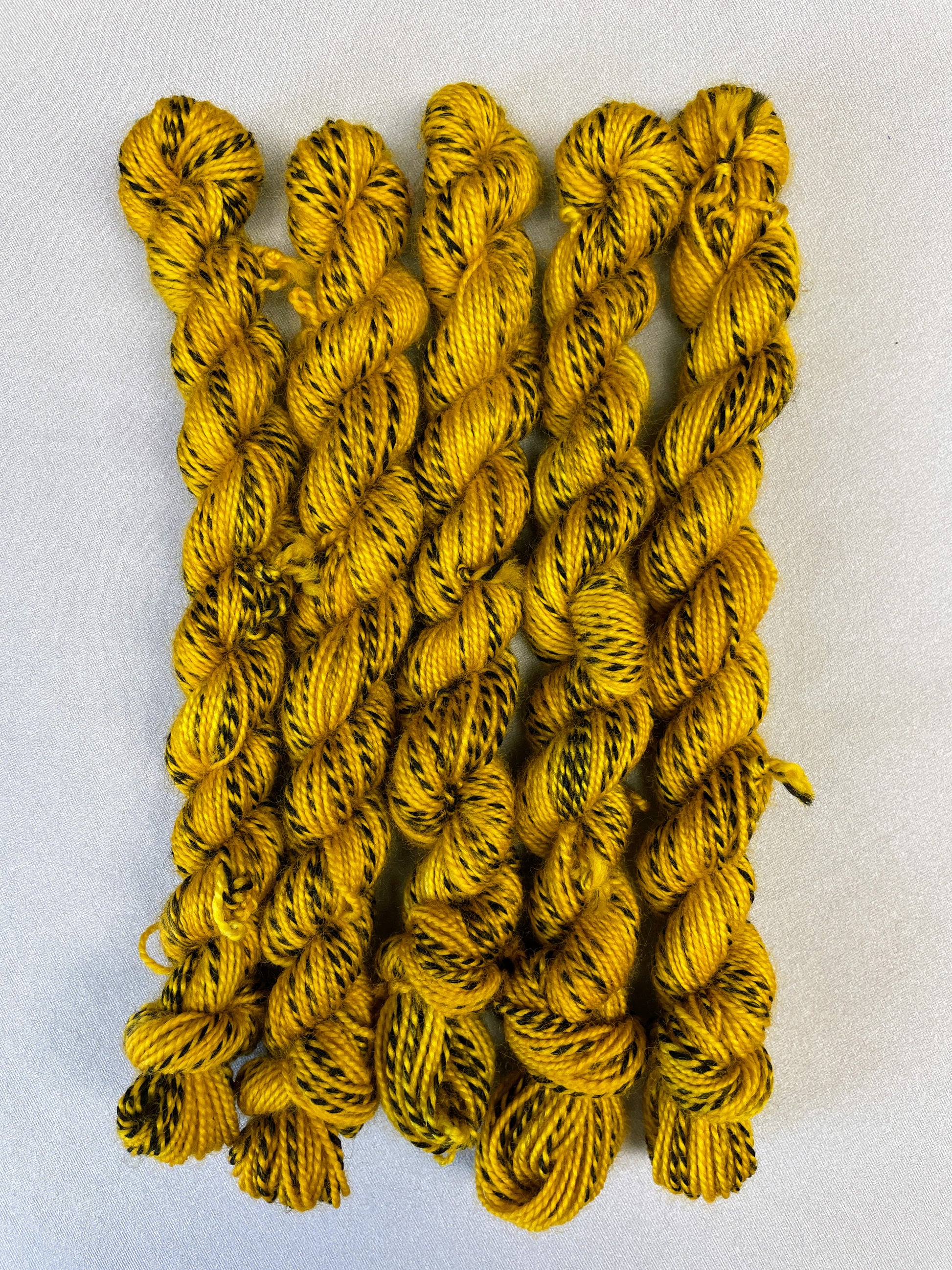 Mustard is a semi-solid colourway with tonal variations of golden yellow. Semi-solids pair well with variegated colourways or to add variation to a big project, they are great for contrasting heel and toes on a pair of socks.