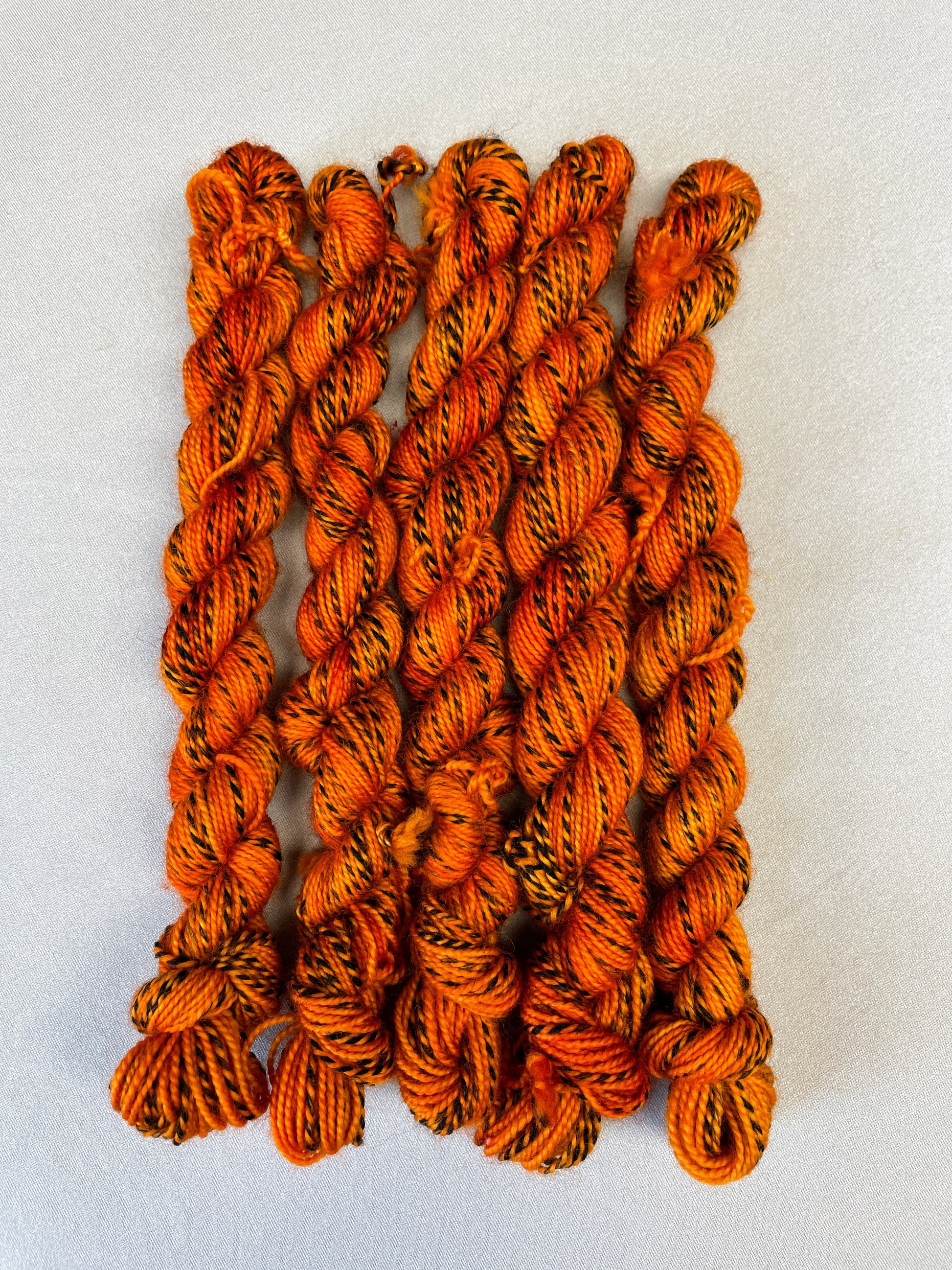 Saffron is a semi-solid colourway with tonal variations of saffron spice. Due to the dye separation there may be patches of more intense colour, which adds variation to the skein. Semi-solids pair well with variegated colourways or to add variation to a big project, they are great for contrasting heel and toes on a pair of socks.