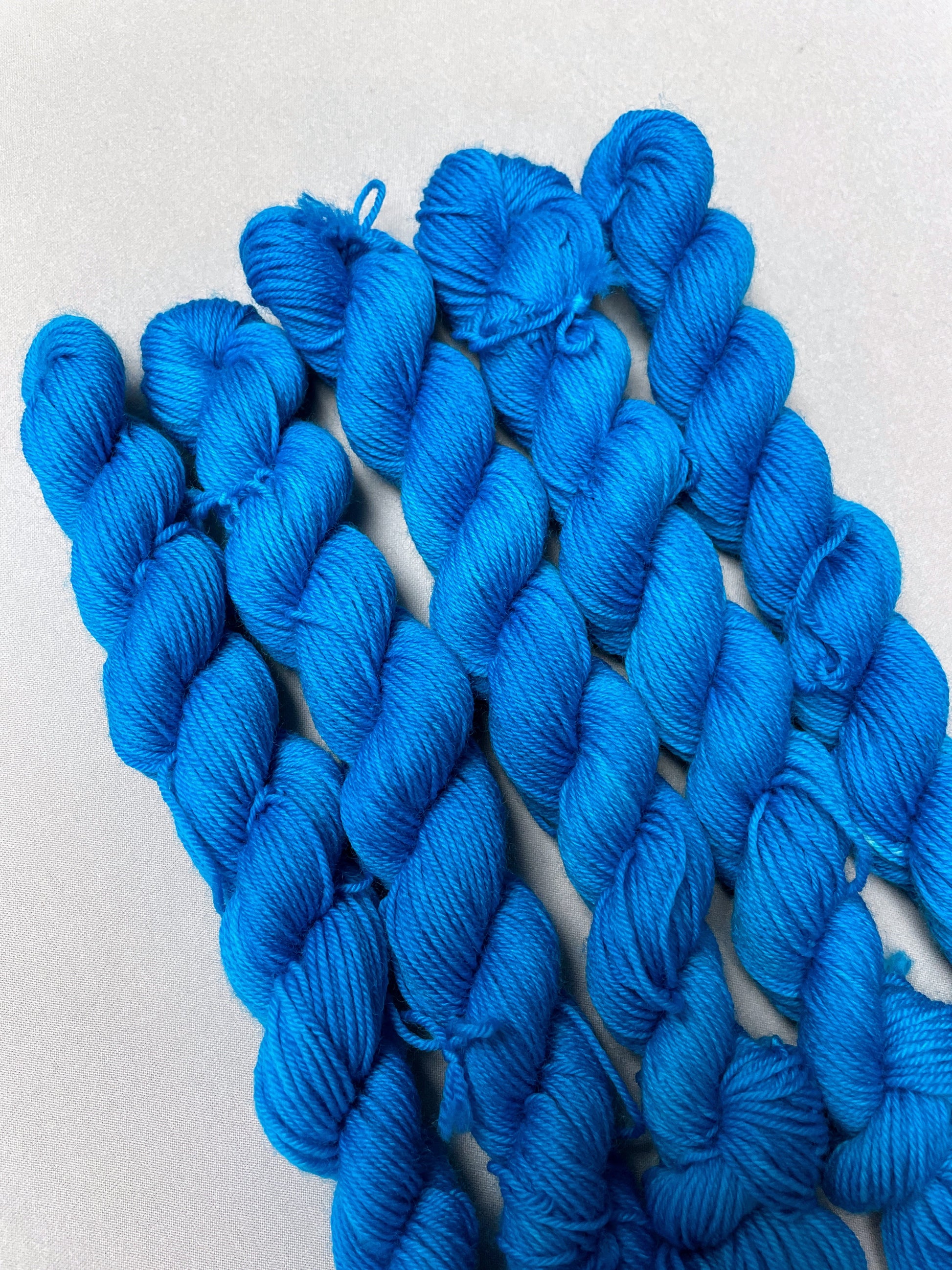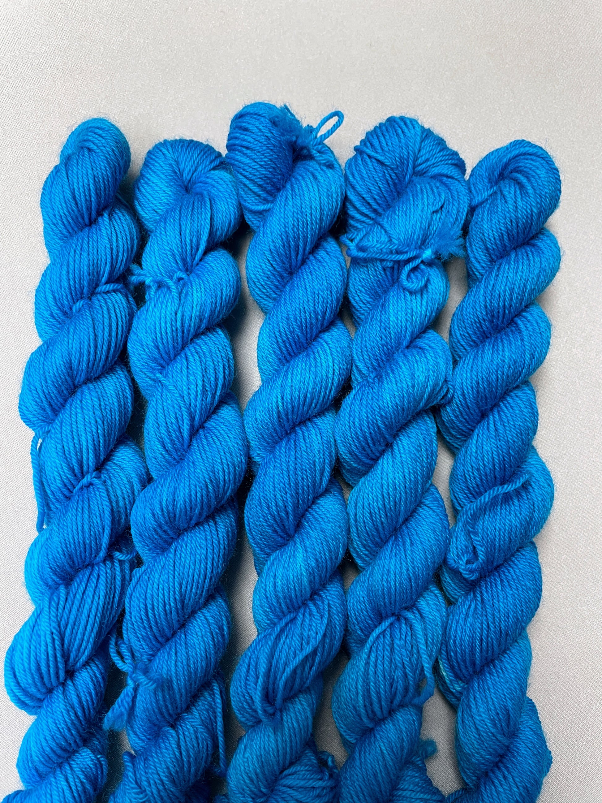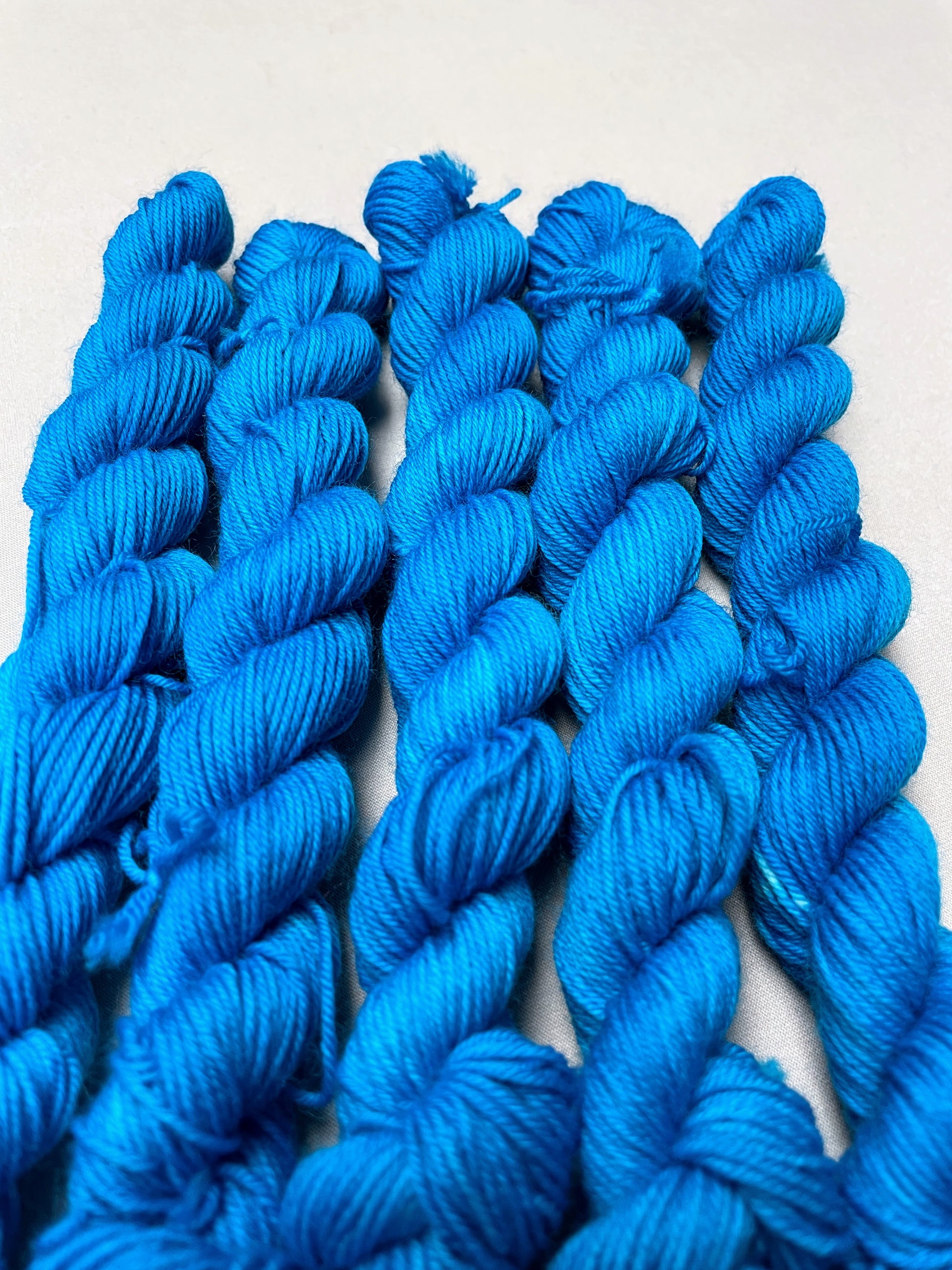 Turquoise is a semi-solid, bright blue colourway. Semi-solids pair well with variegated colourways or to add variation to a big project, they are great for contrasting heel and toes on a pair of socks.