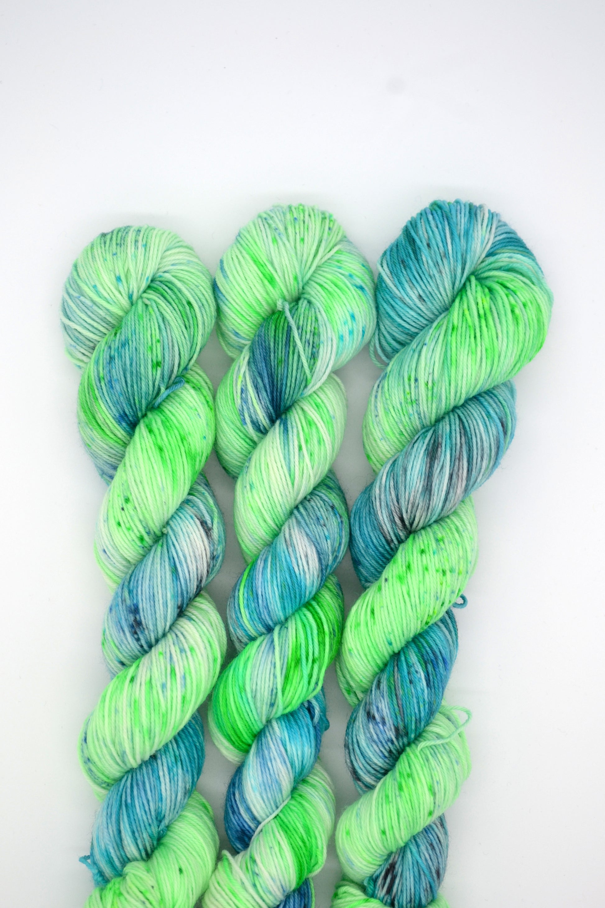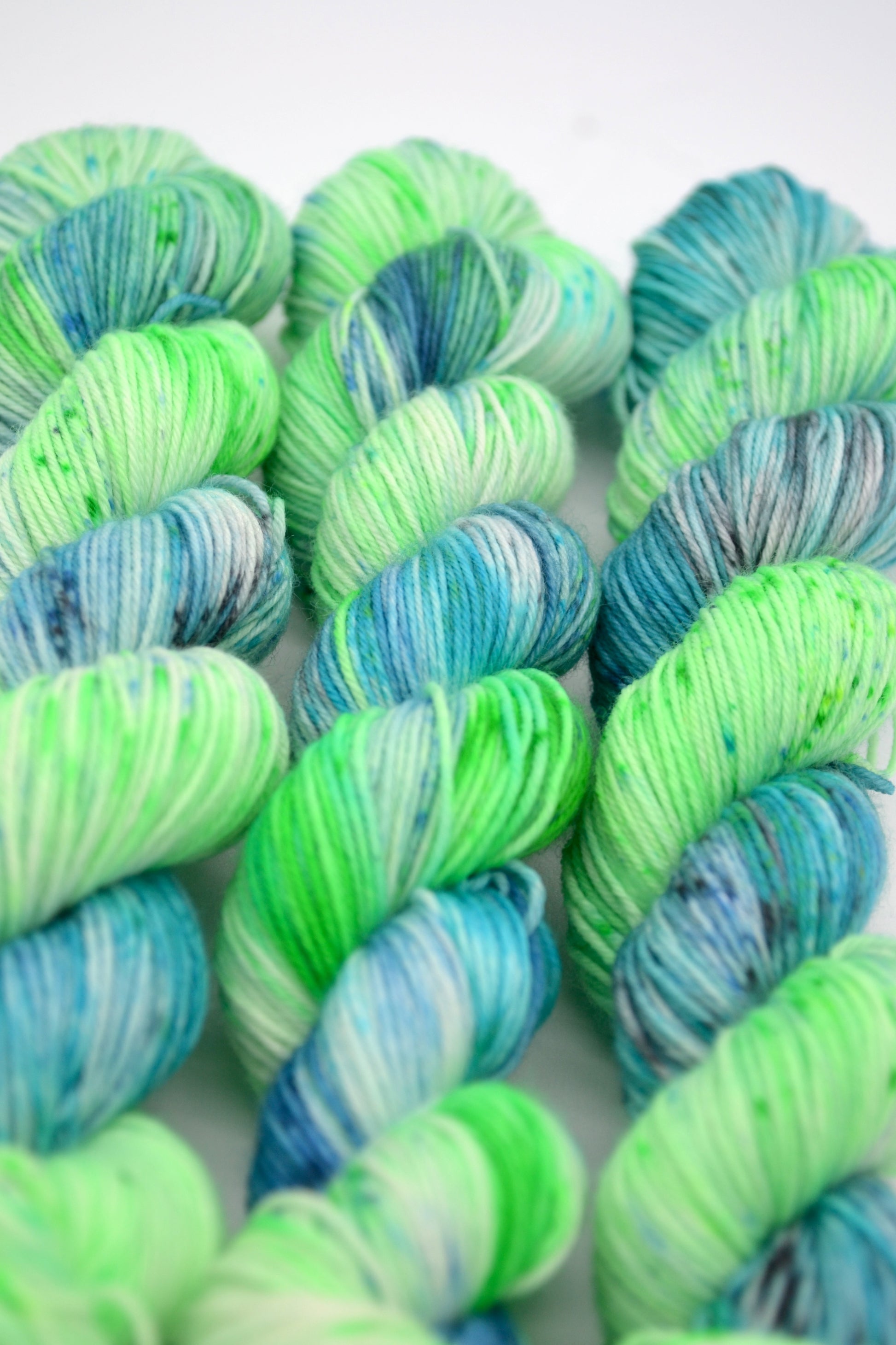 Bluewater is a variegated colourway with a splashes of Neon Lime and Blue with Speckles of Silver Grey, Green and Blue, it almost shimmers under the light.