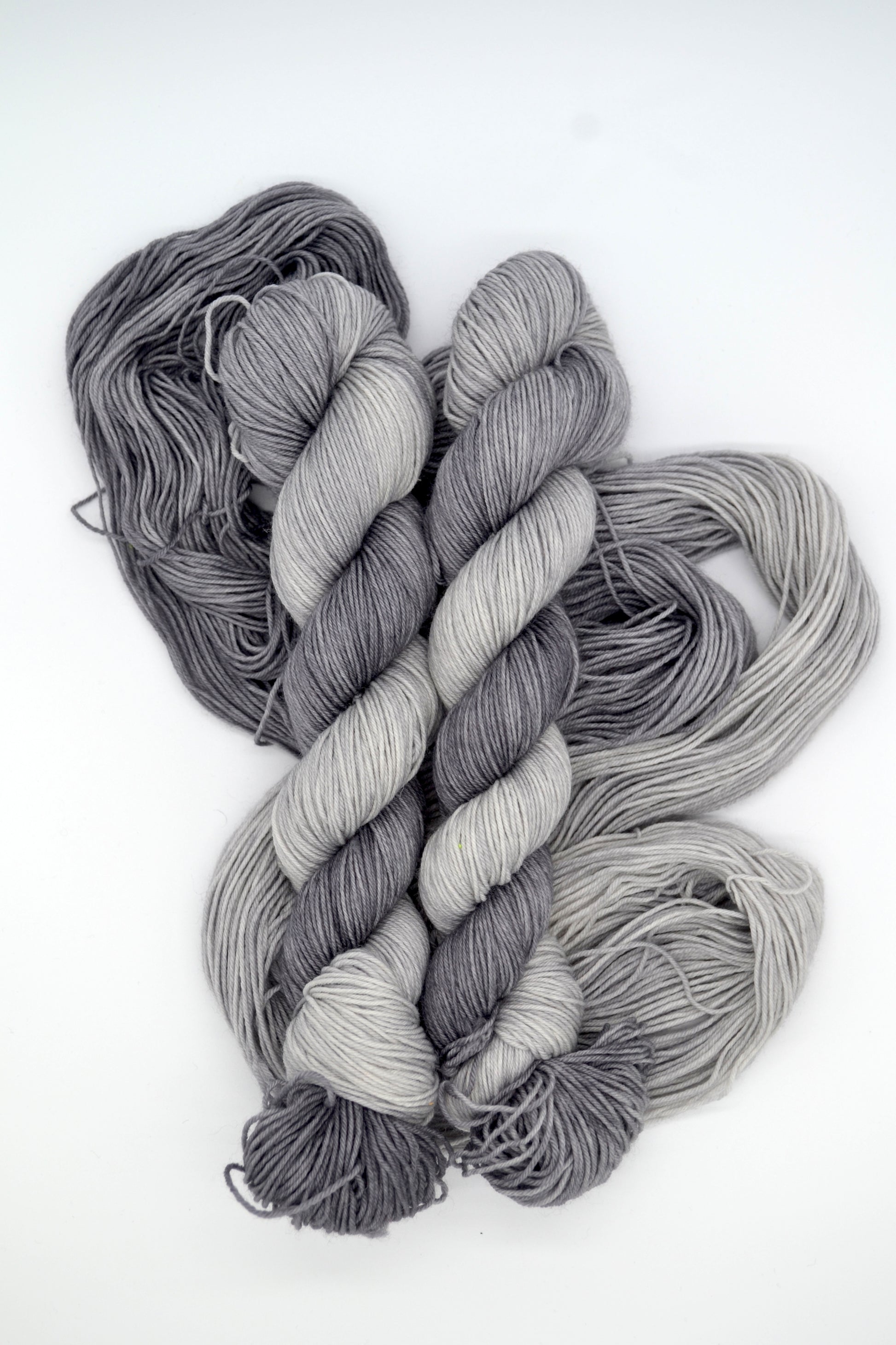 Silver is a tonal colourway using two shades of Silver Grey, one half of the skein is a lighter tone, whilst the other half is more concentrated.