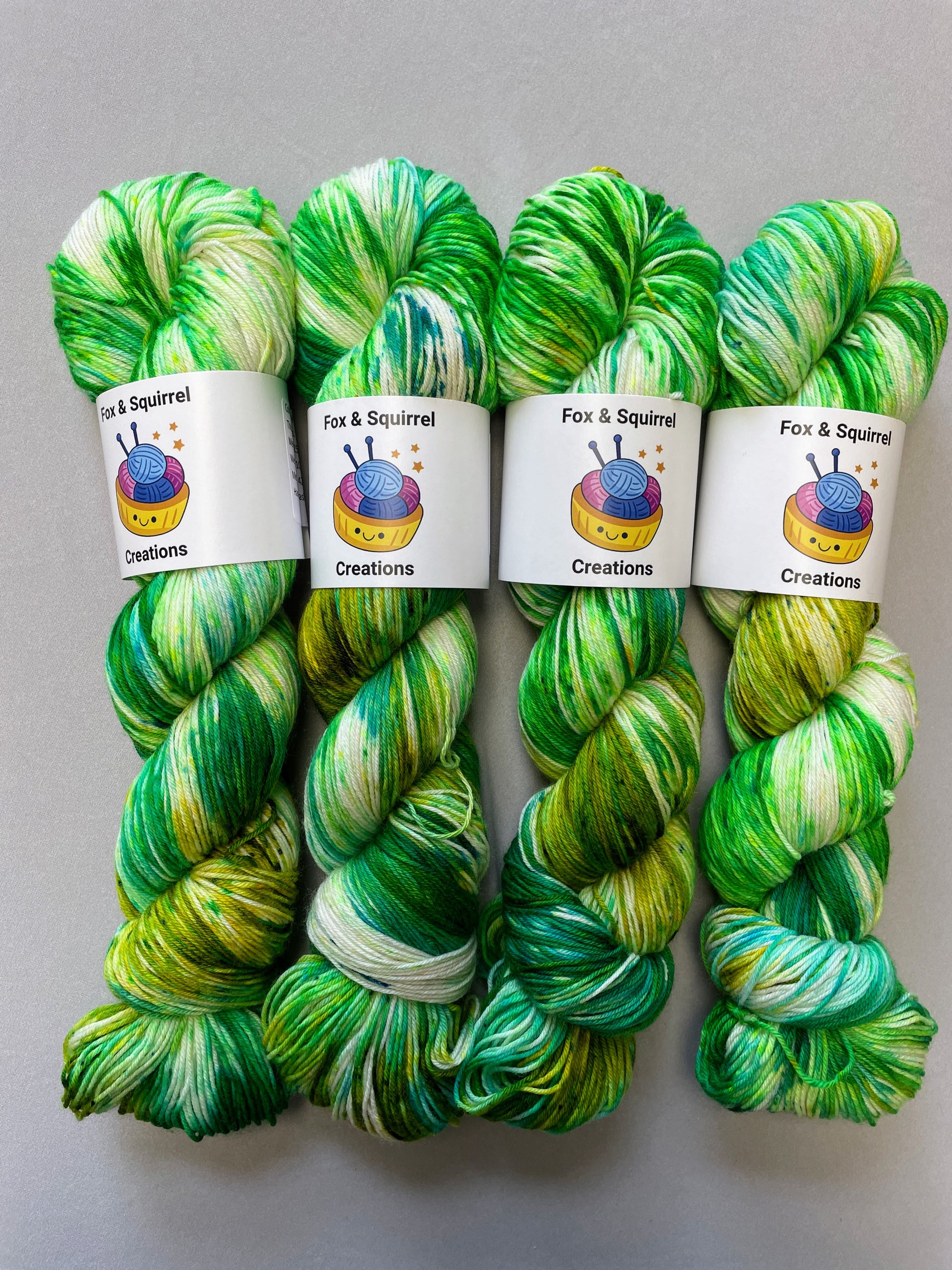 Apple Sprinkles is a speckled colourway, with speckles of green and blue. Due to the nature of the speckling technique each skein is unique in colour depth and placement.
