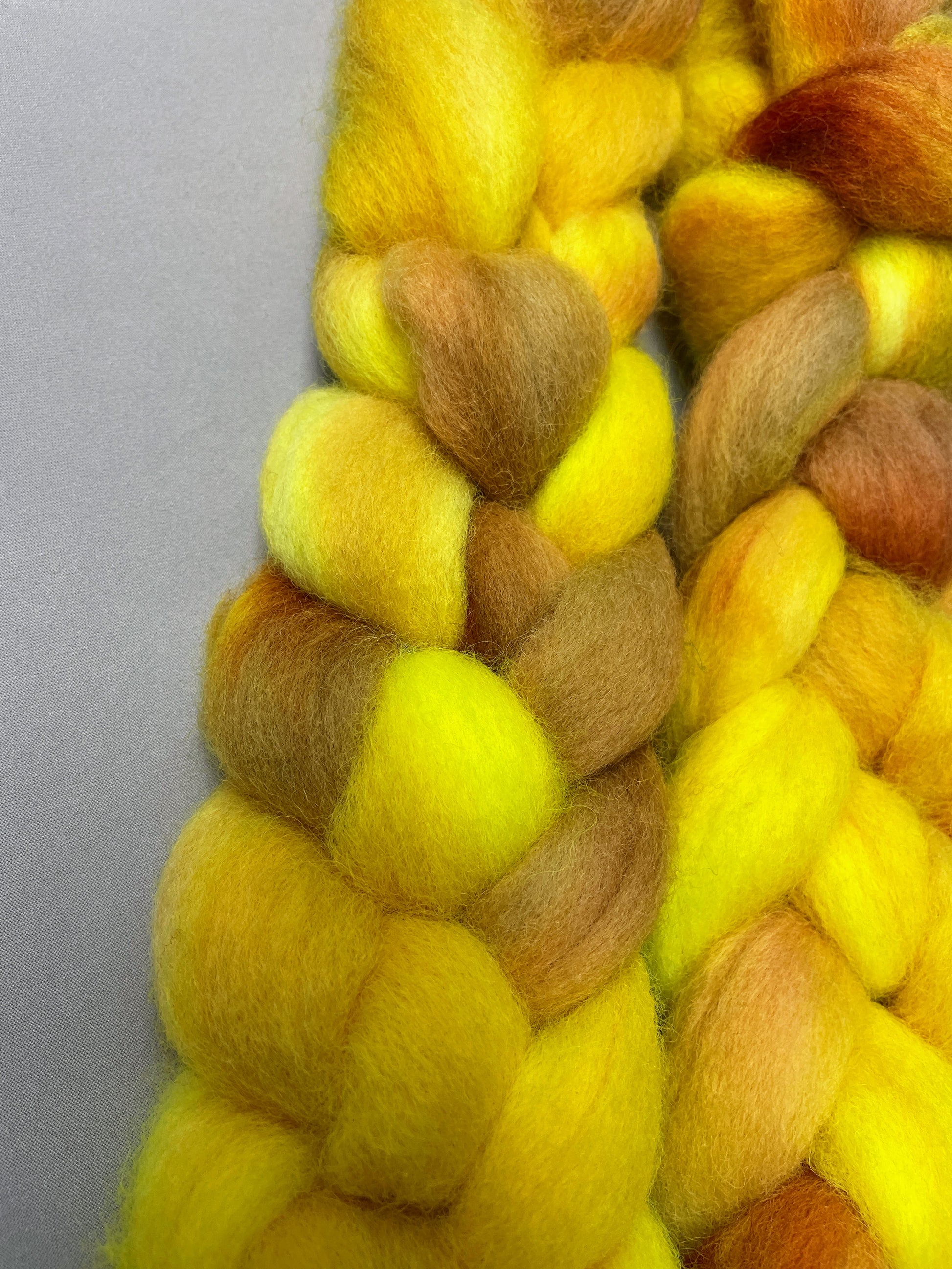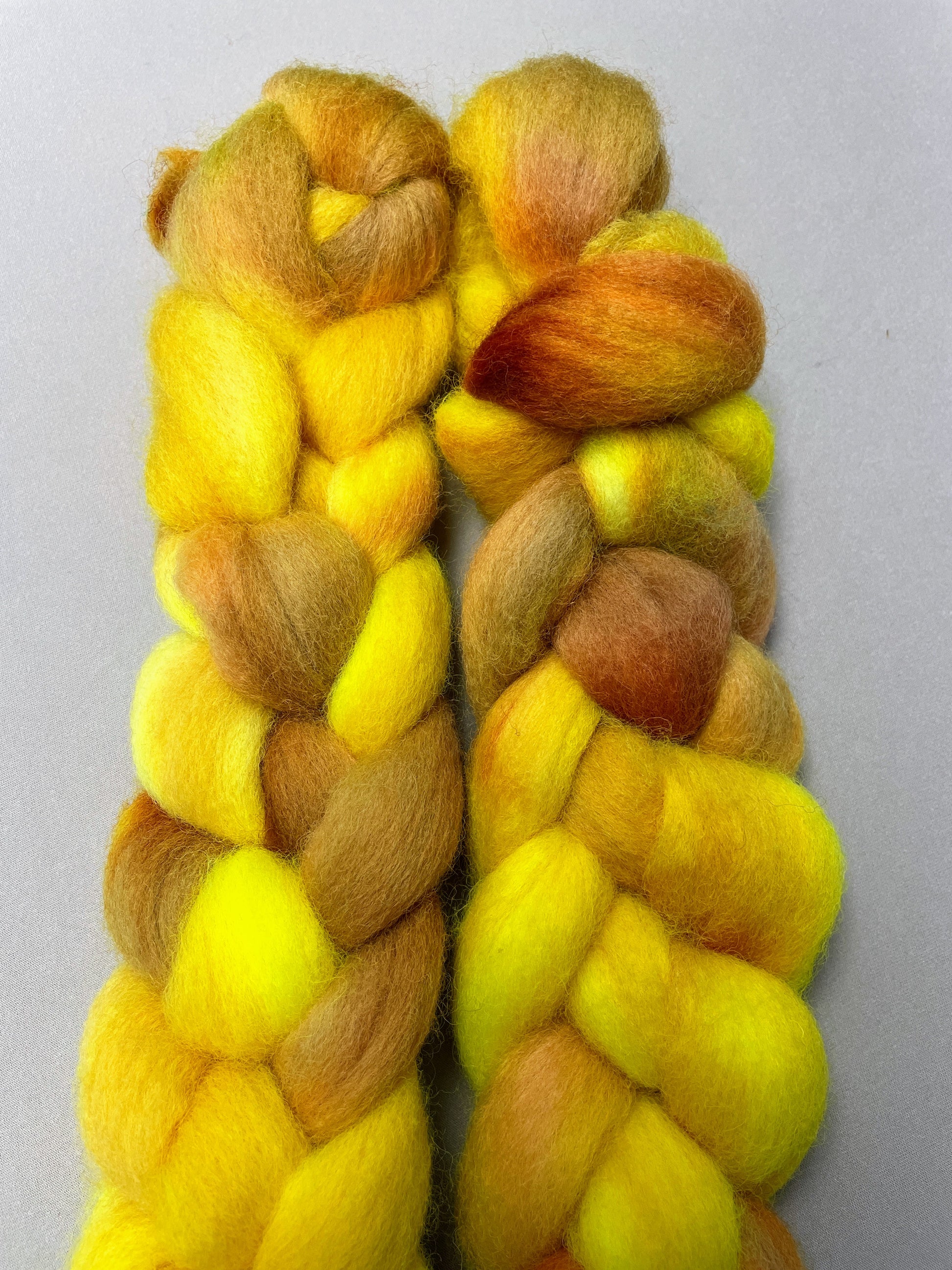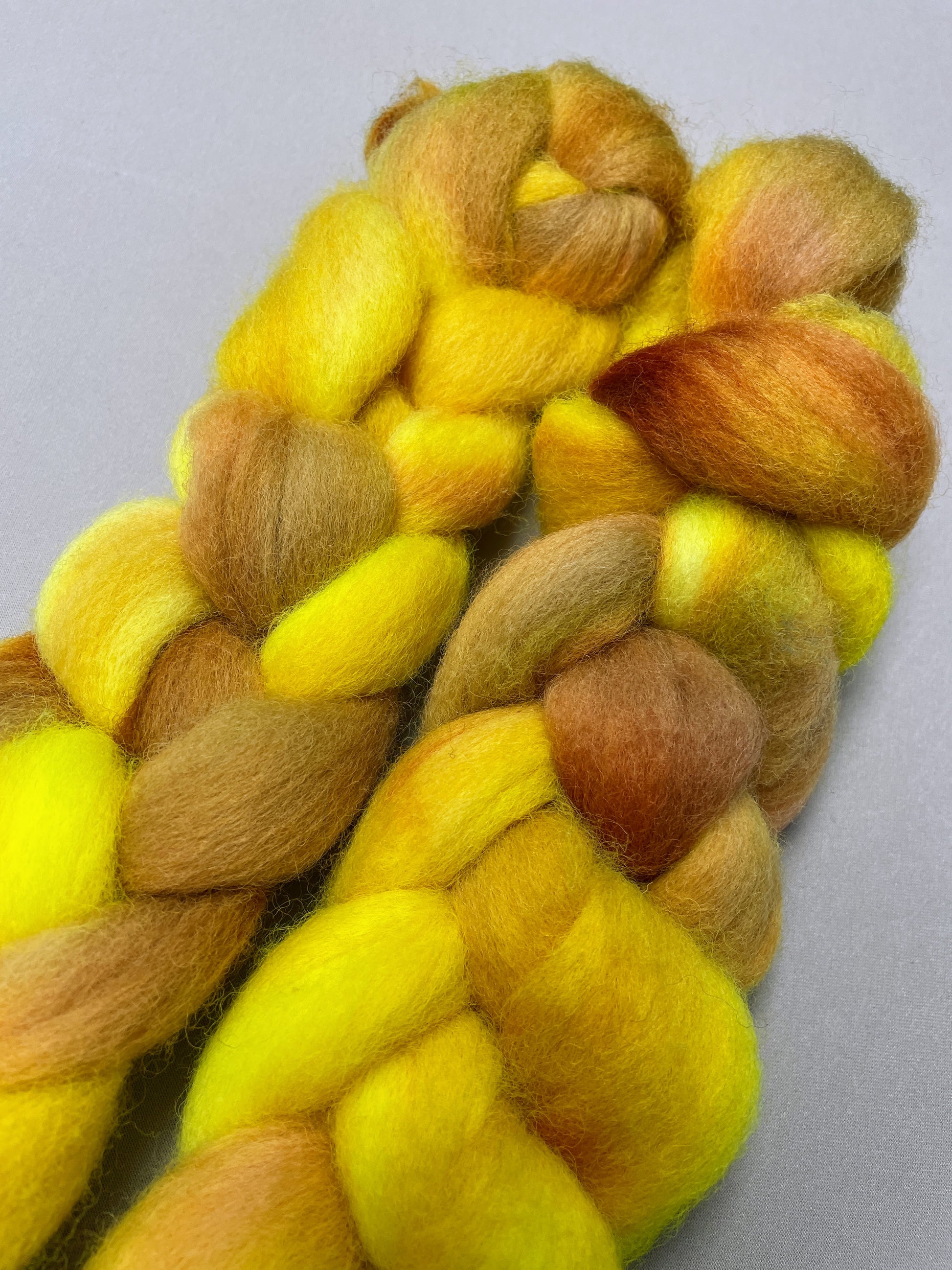 Hand-dyed fibre roving in shades of Mustard, Autumn Gold, Caramel and Copper. Dyed on non-superwash Corriedale Fibre.