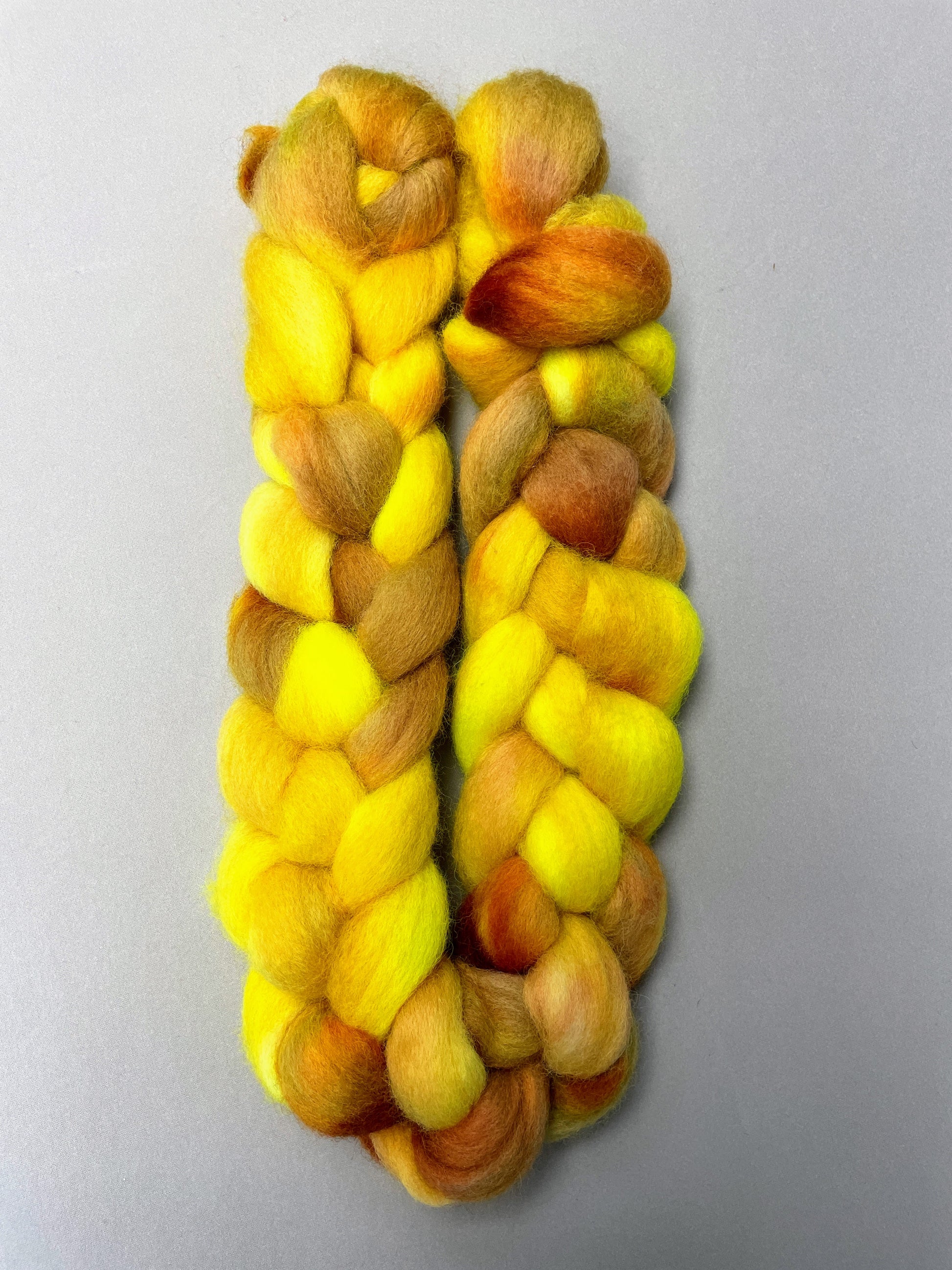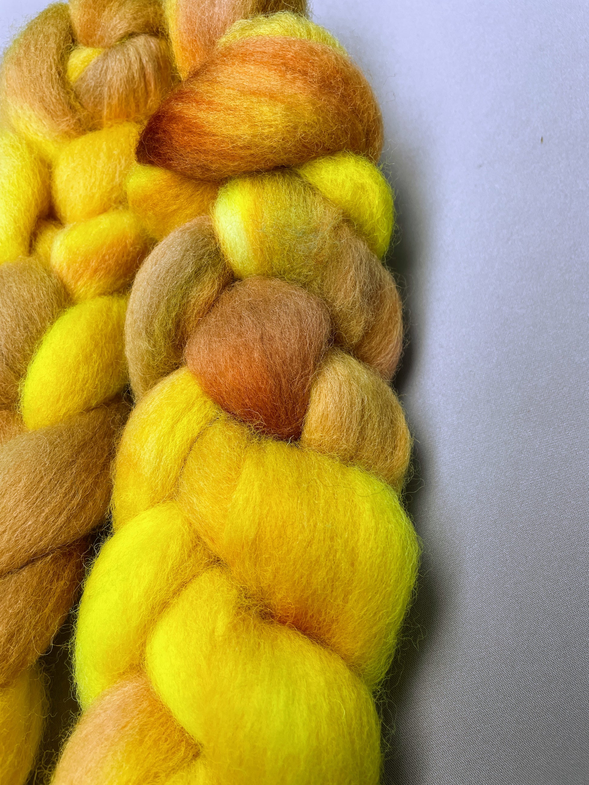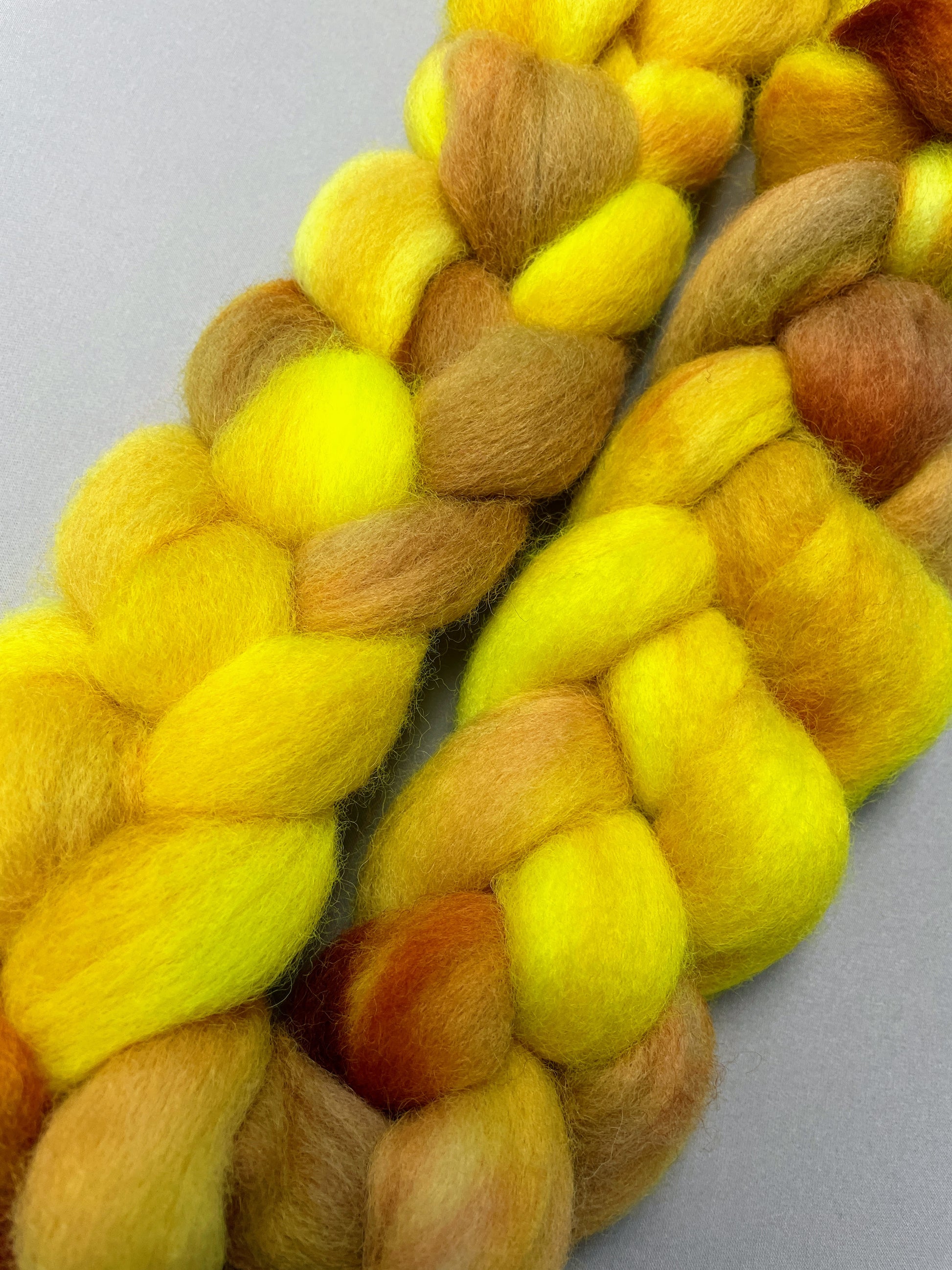 Hand-dyed fibre roving in shades of Mustard, Autumn Gold, Caramel and Copper. Dyed on non-superwash Corriedale Fibre.