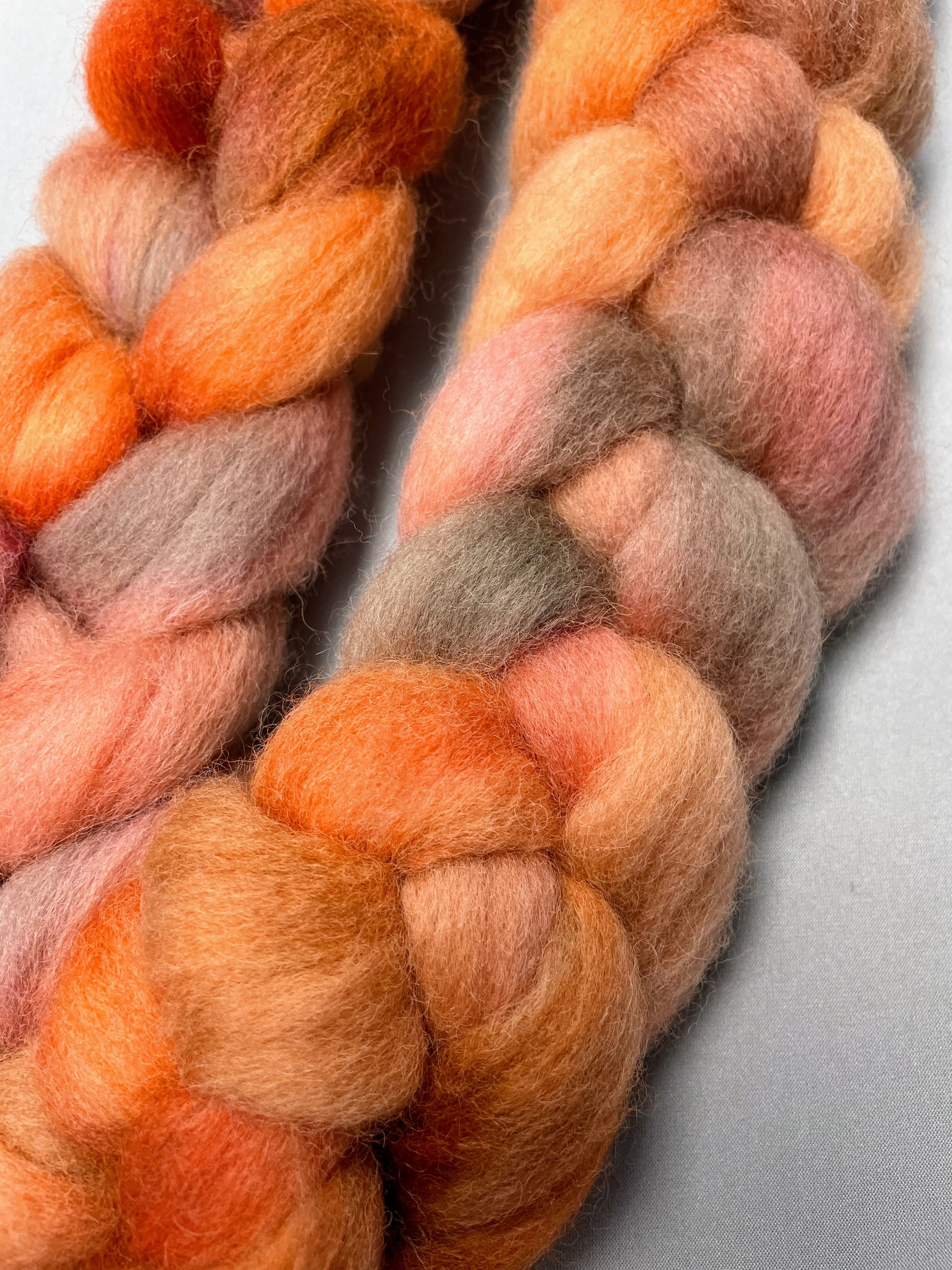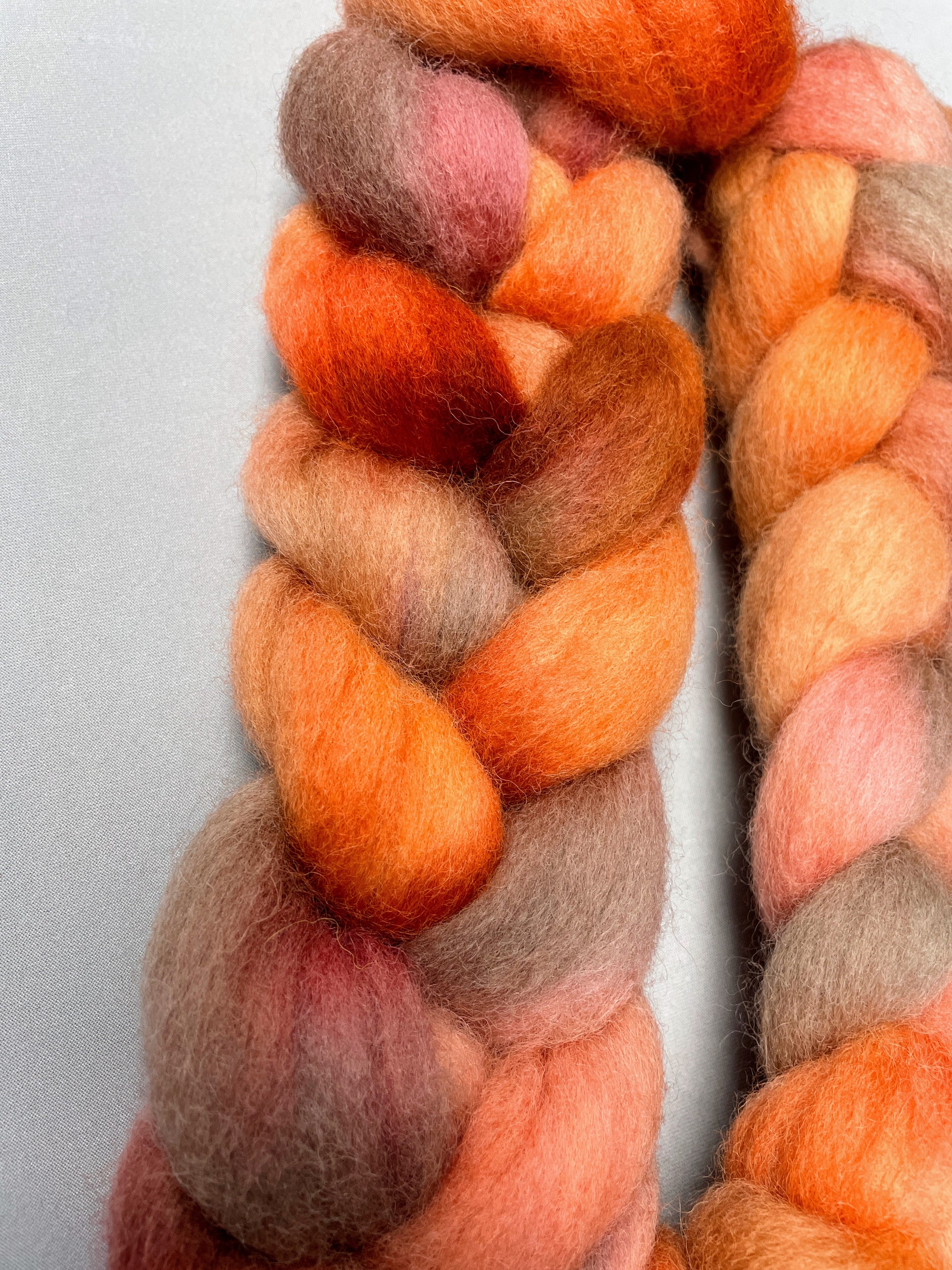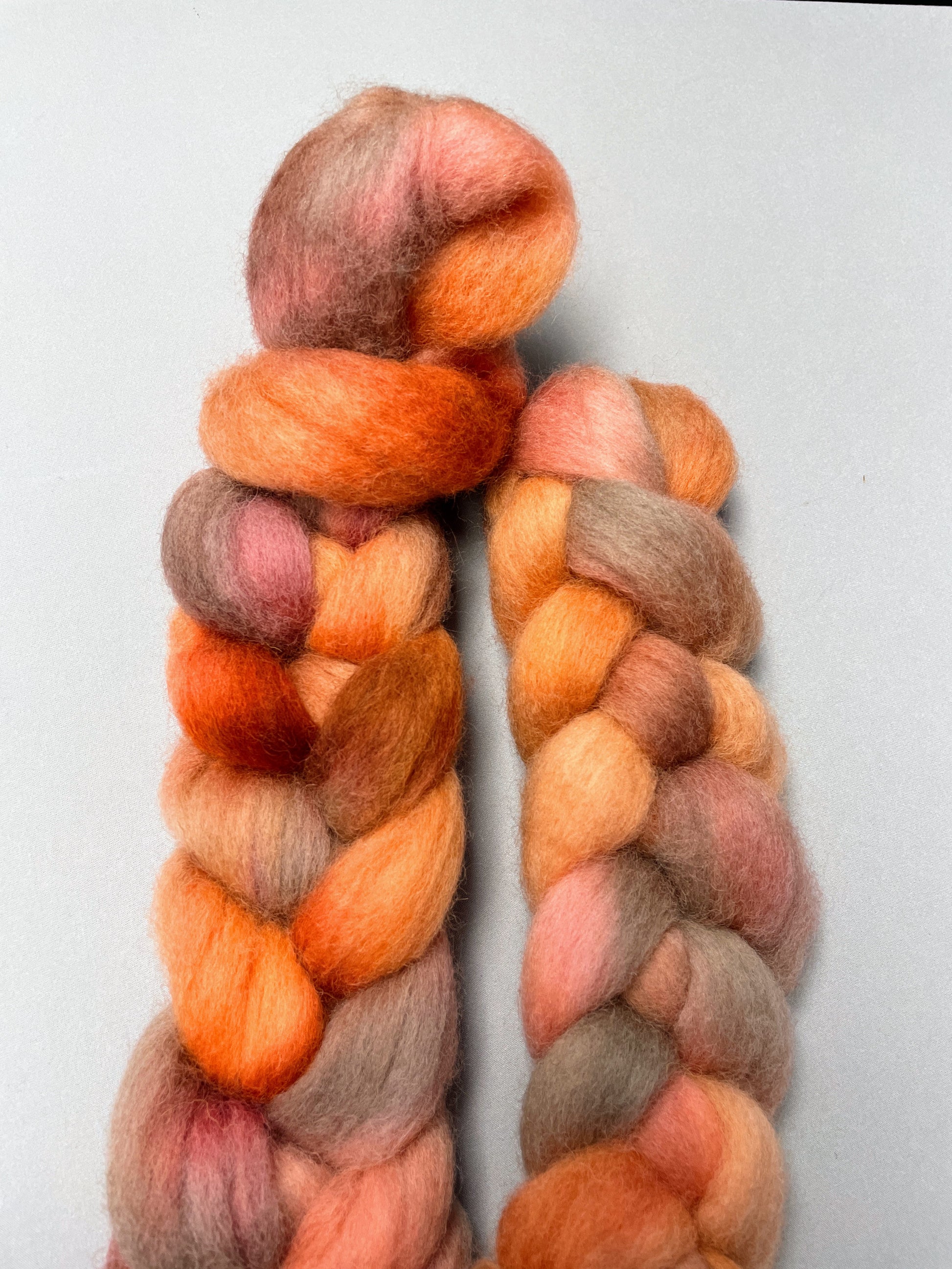 Hand-dyed fibre roving in shades of Peach, Salmon Pink, Orange and Dusty Pink. Dyed on non-superwash Corriedale Fibre.
