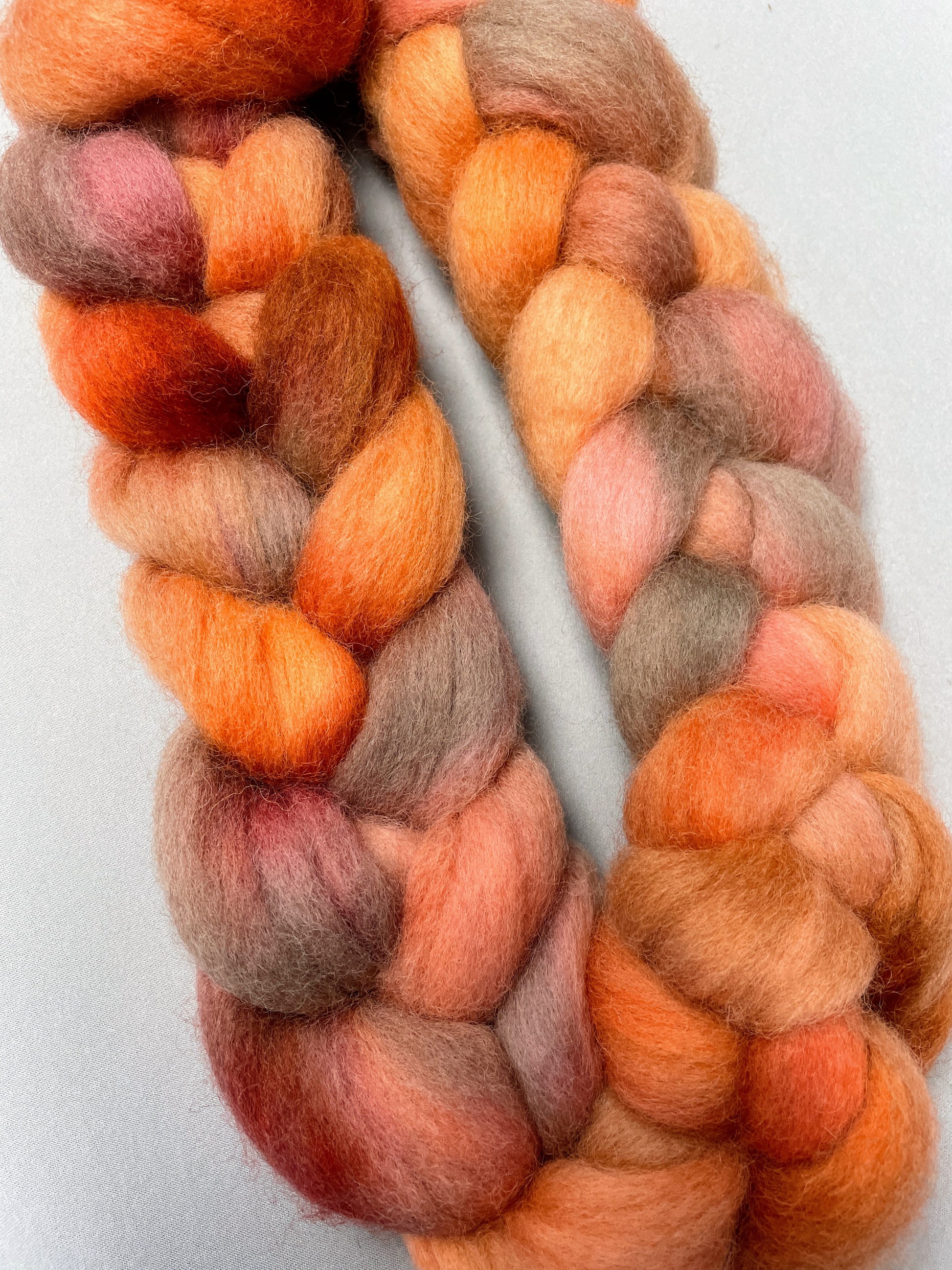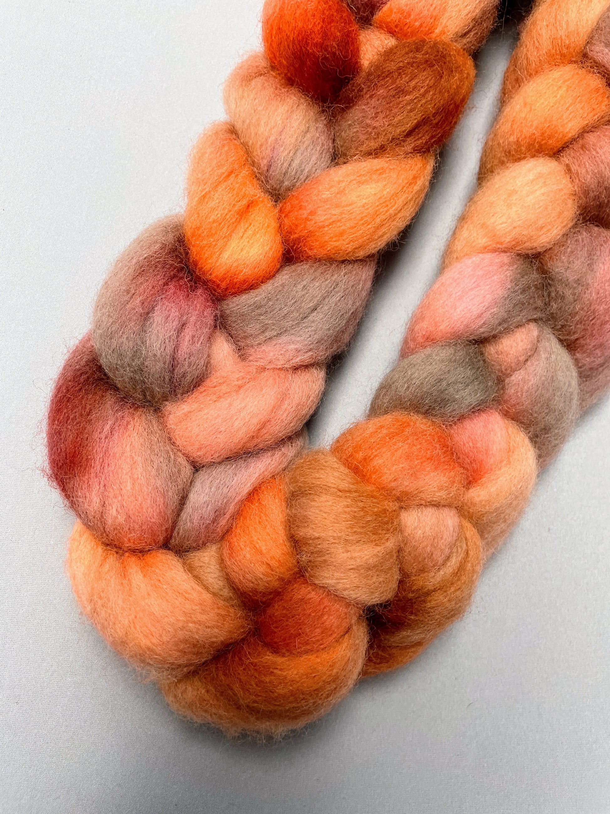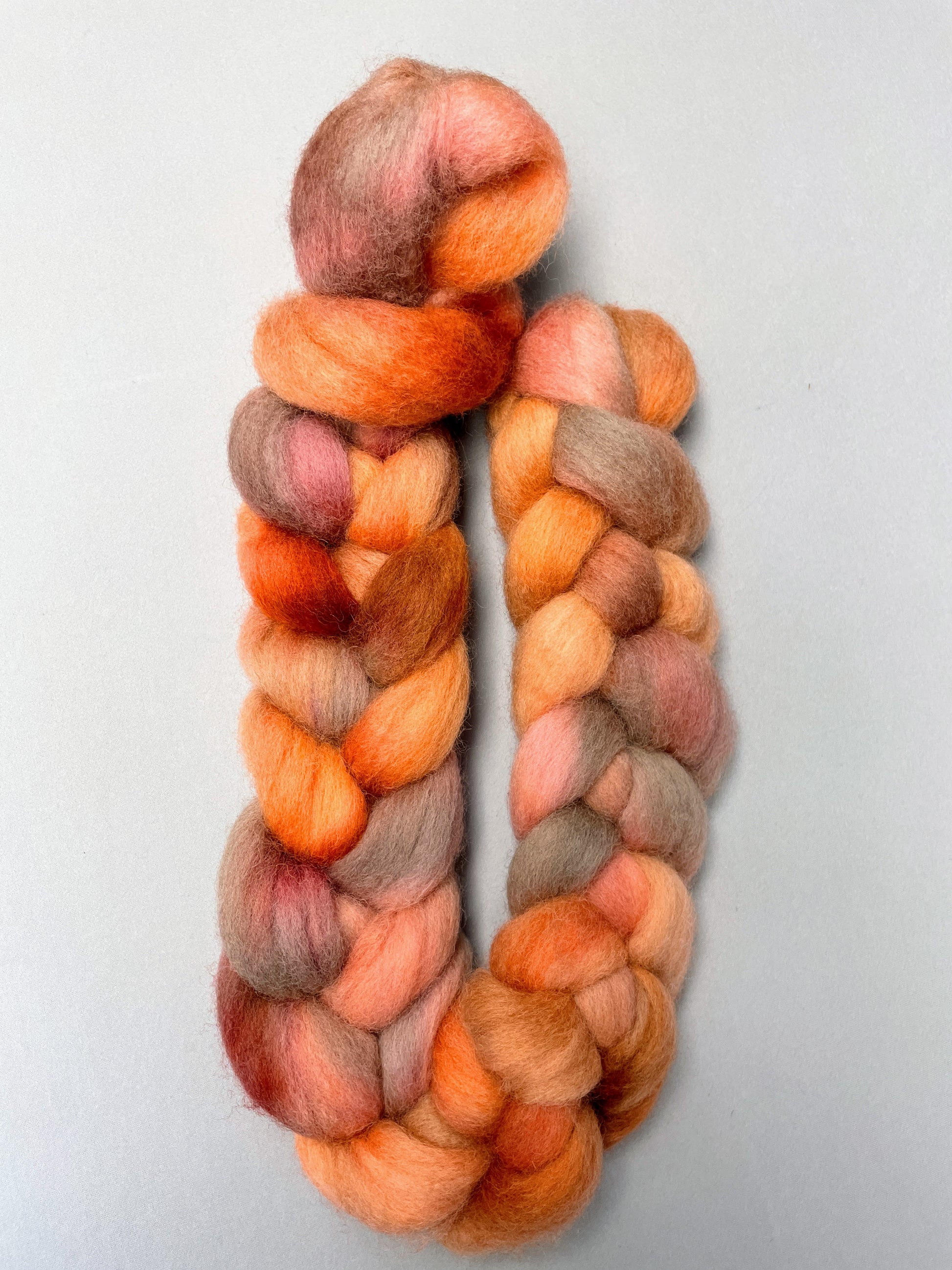Hand-dyed fibre roving in shades of Peach, Salmon Pink, Orange and Dusty Pink. Dyed on non-superwash Corriedale Fibre.