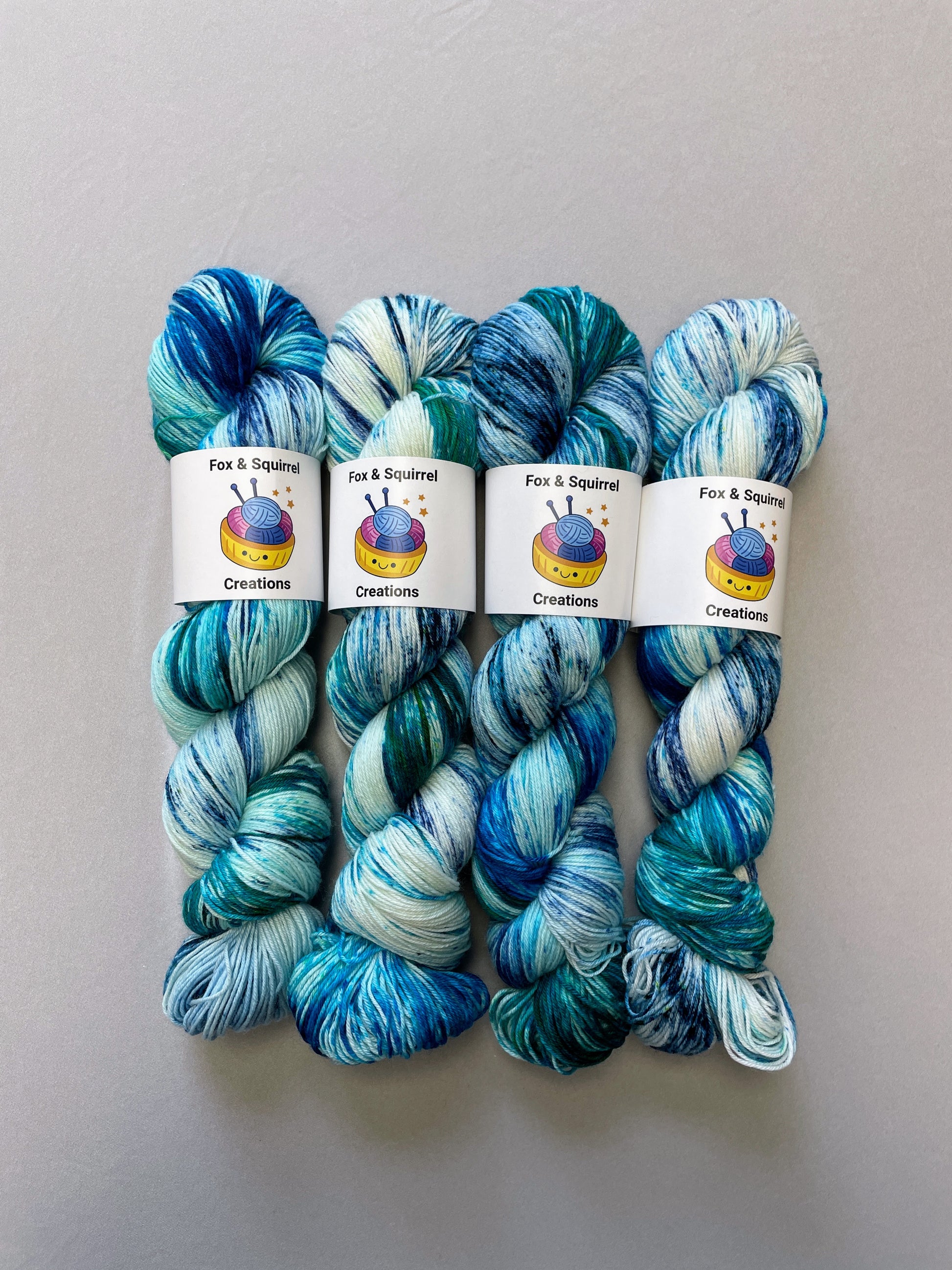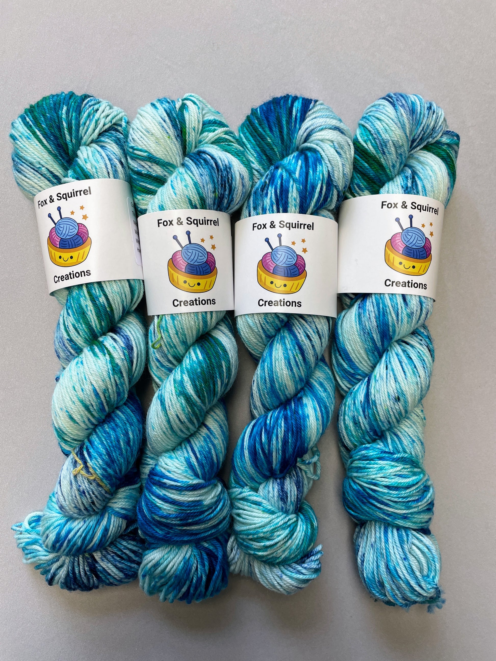 Ice Sprinkles is a speckled colourway, with speckles of different shades of blue and teal. Due to the nature of the speckling technique each skein is unique in colour depth and placement.