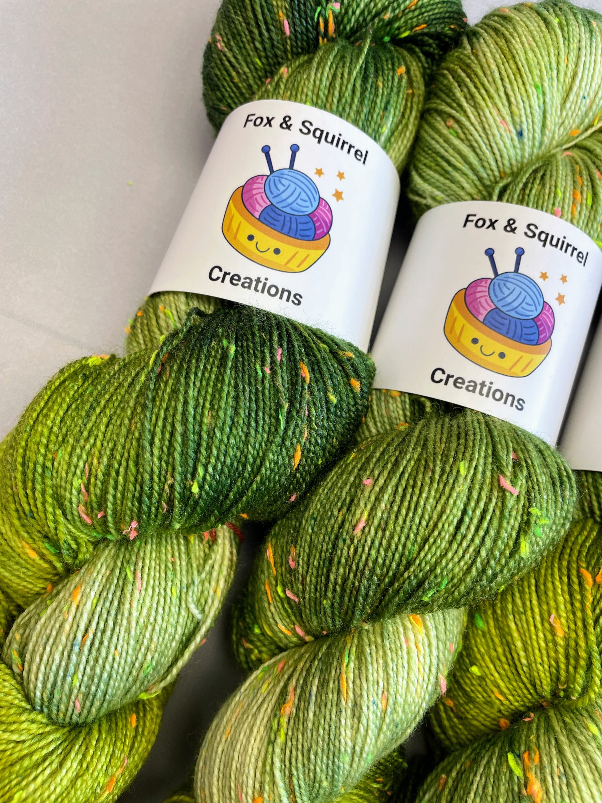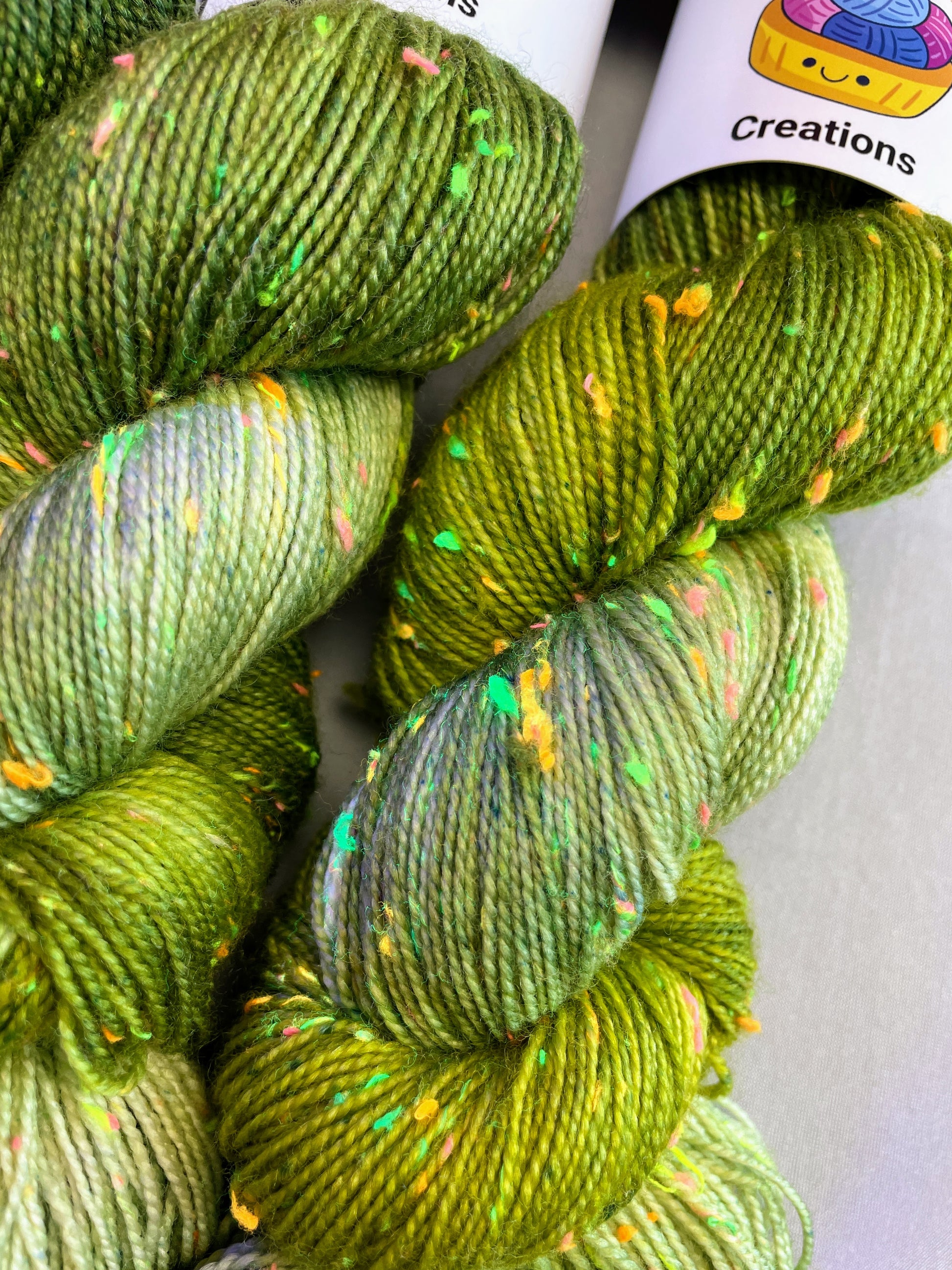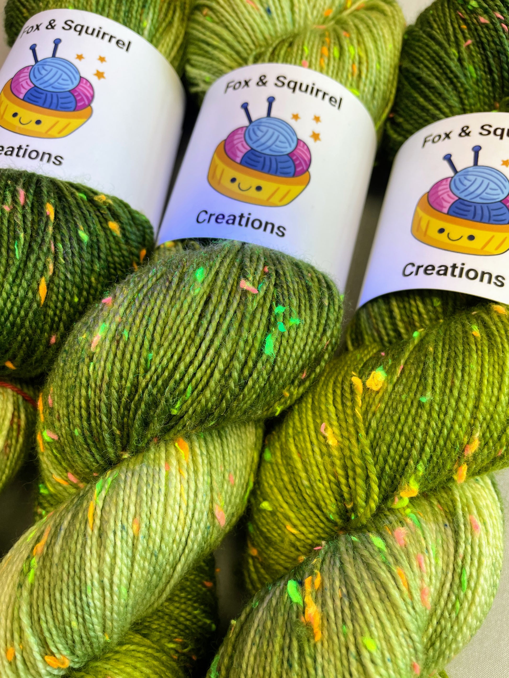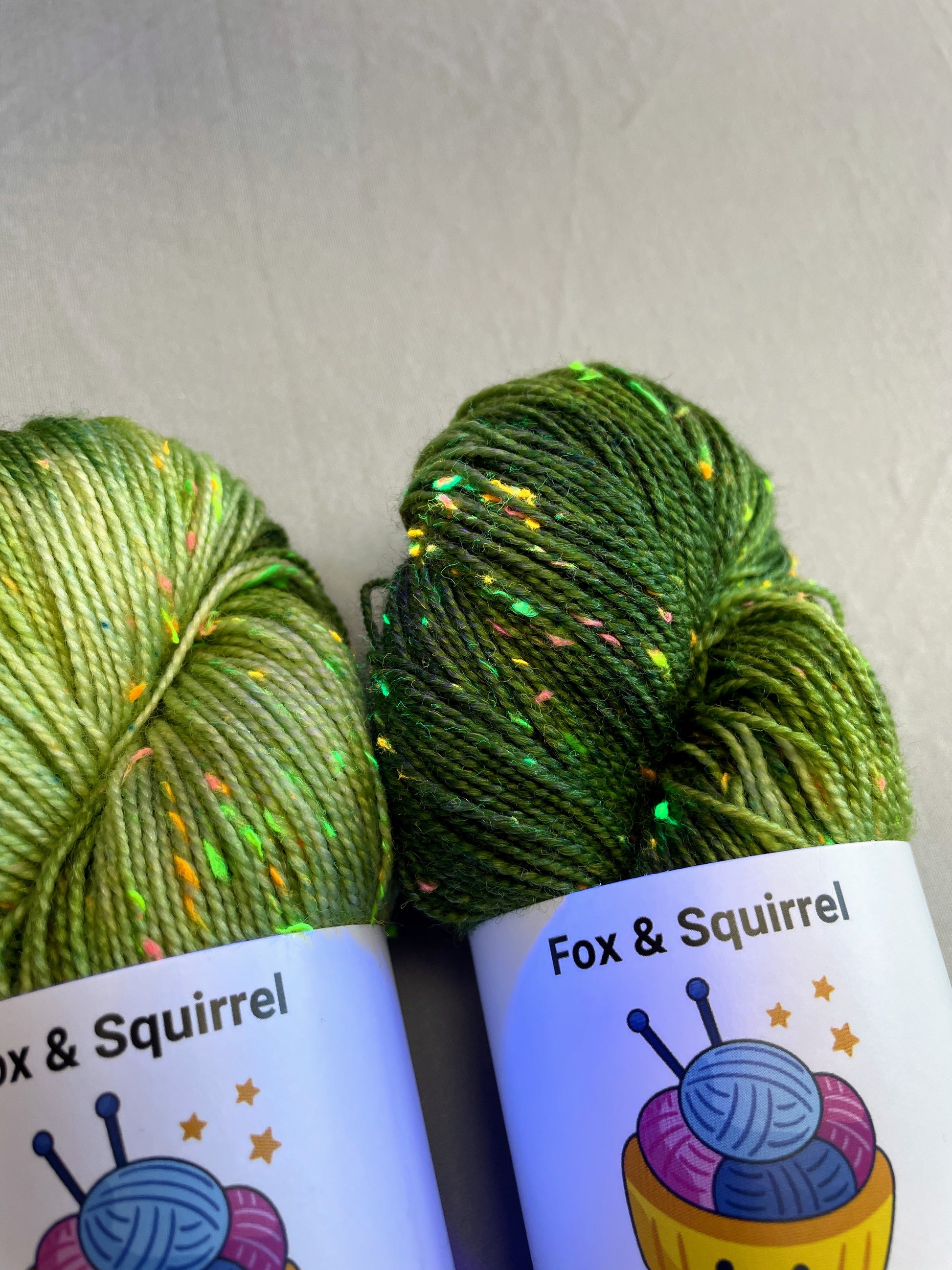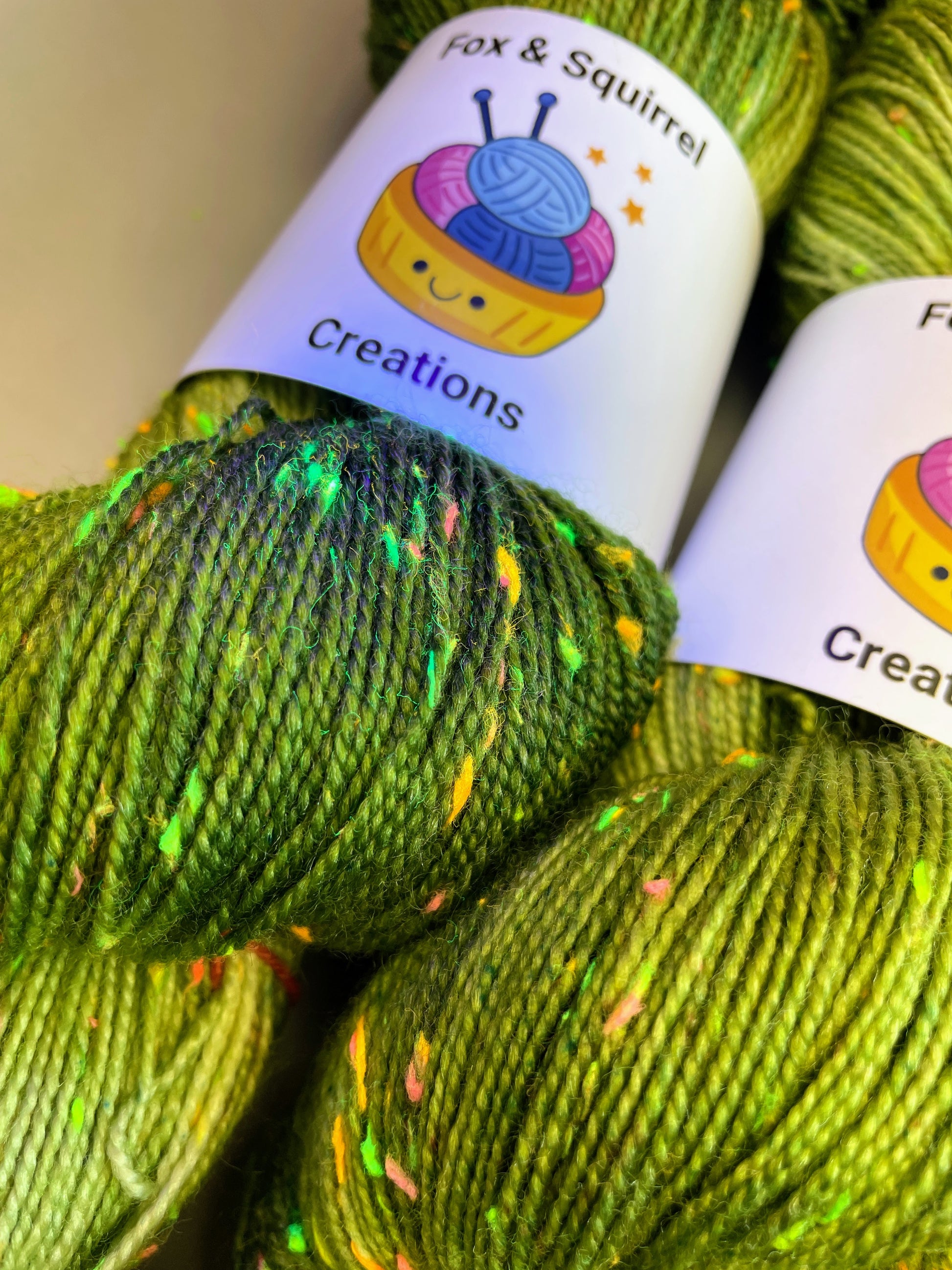 Evergreen is a tonal colourway ranging from Pistachio up to Emerald Green with a lovely Olive Green blended throughout the skein. This colourway is dyed on our Neon Nep yarn base, the neon neps are spun into the wool, meaning the neps will glow under U.V. light. They also don't pick up the dye solution so add a pop of colour throughout the skein.