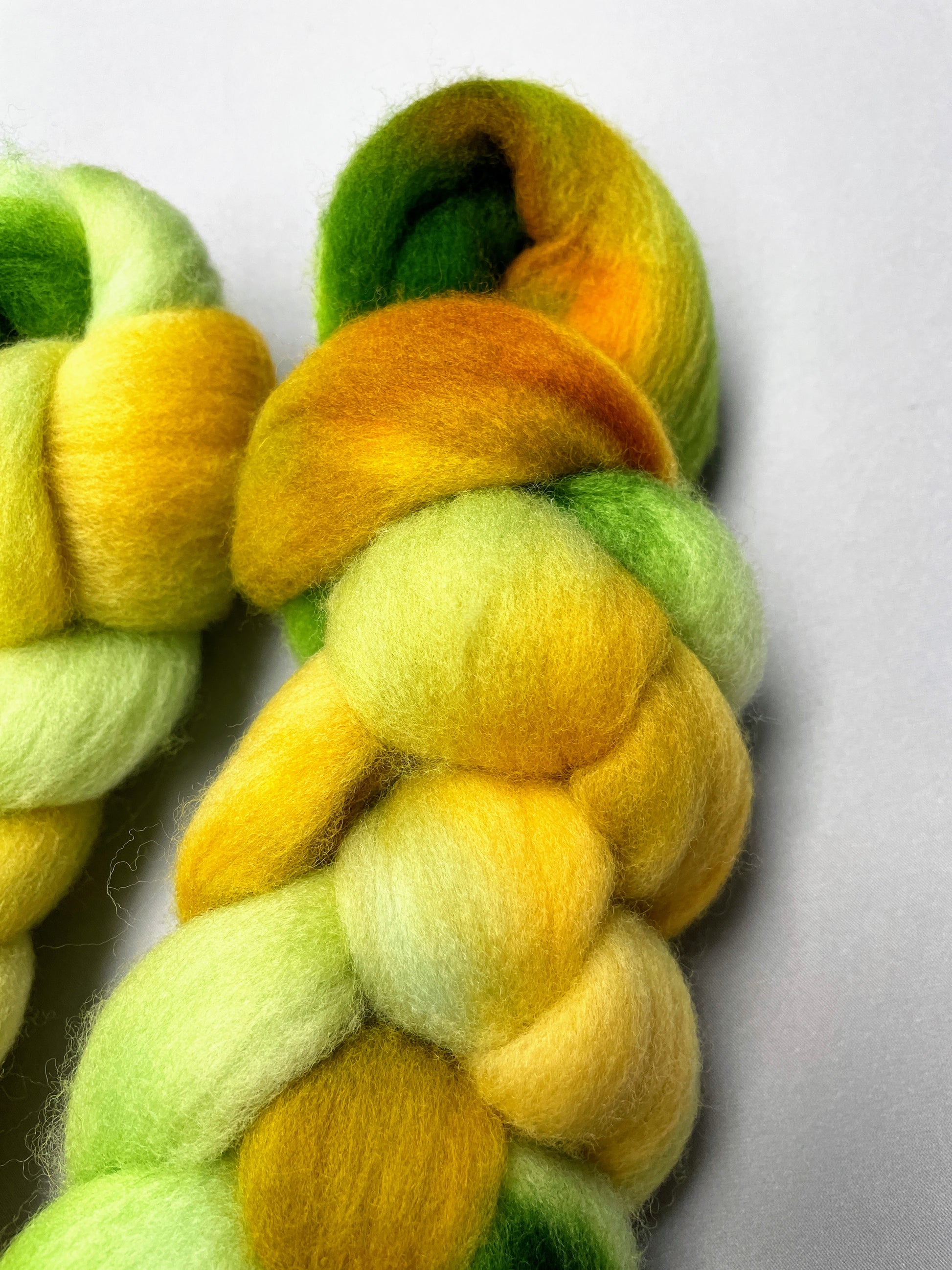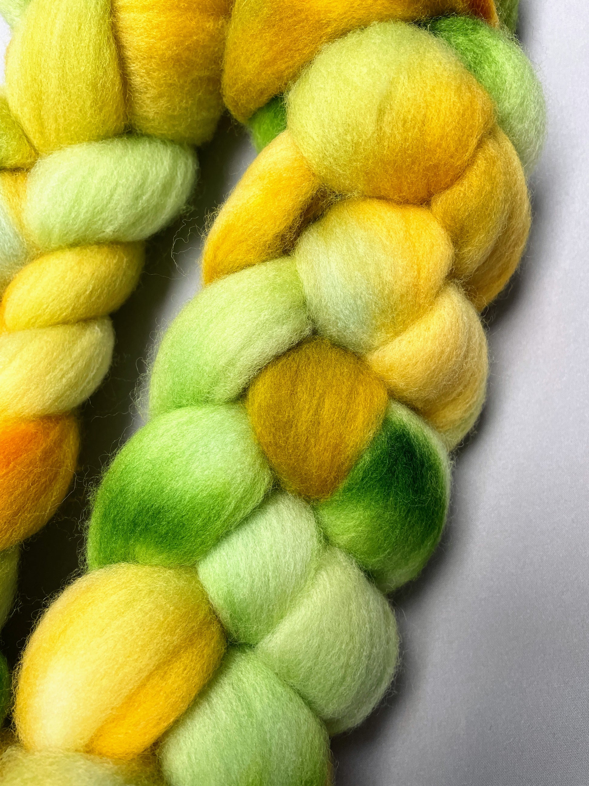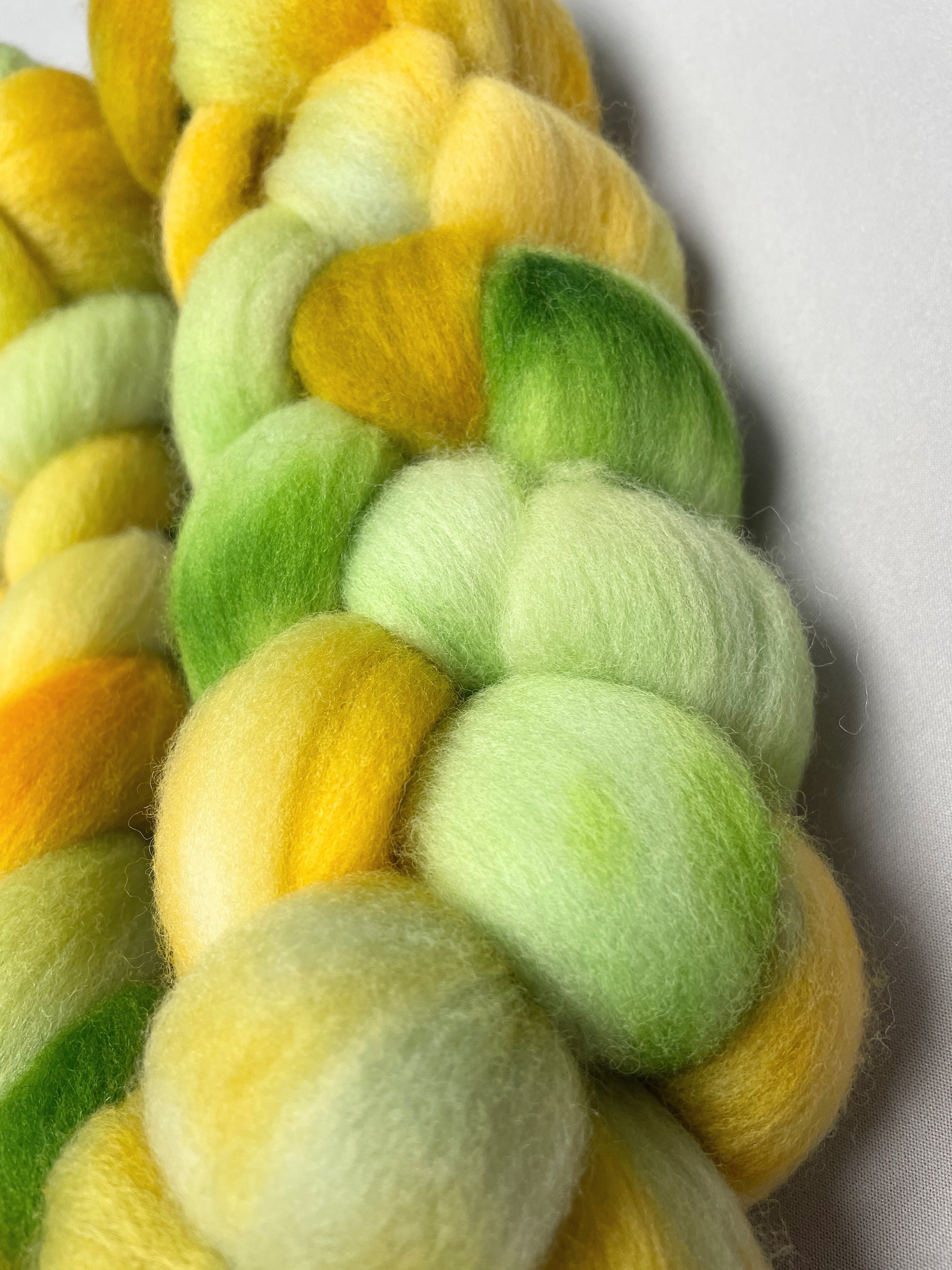Hand-dyed fibre roving in shades of Sour Apple, Mustard and Yellow. A bright colourway, perfect for your next spinning project. Dyed on non-superwash polwarth fibre.