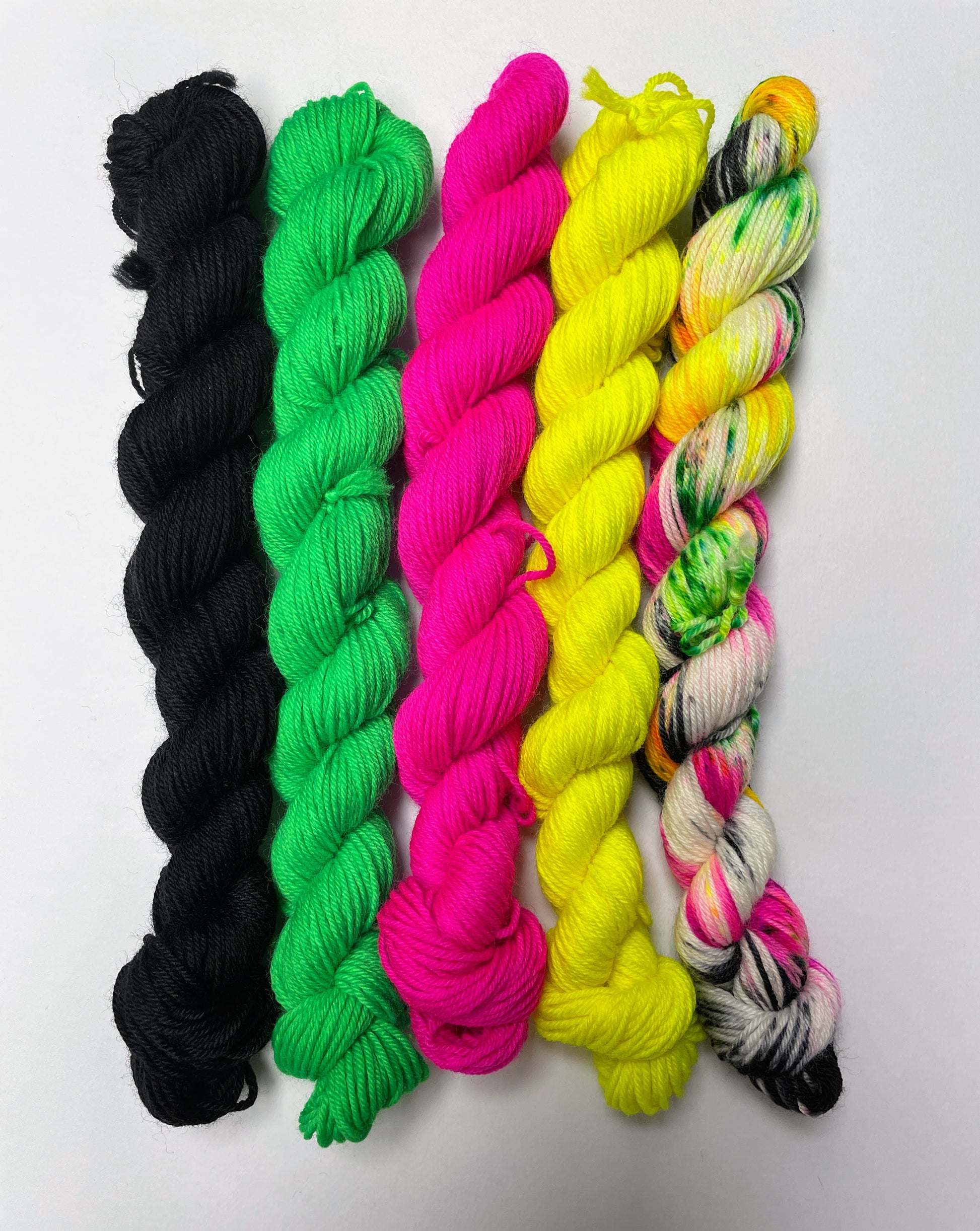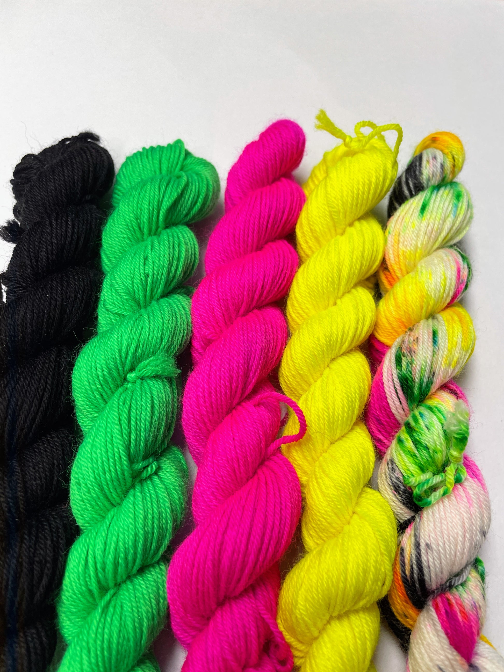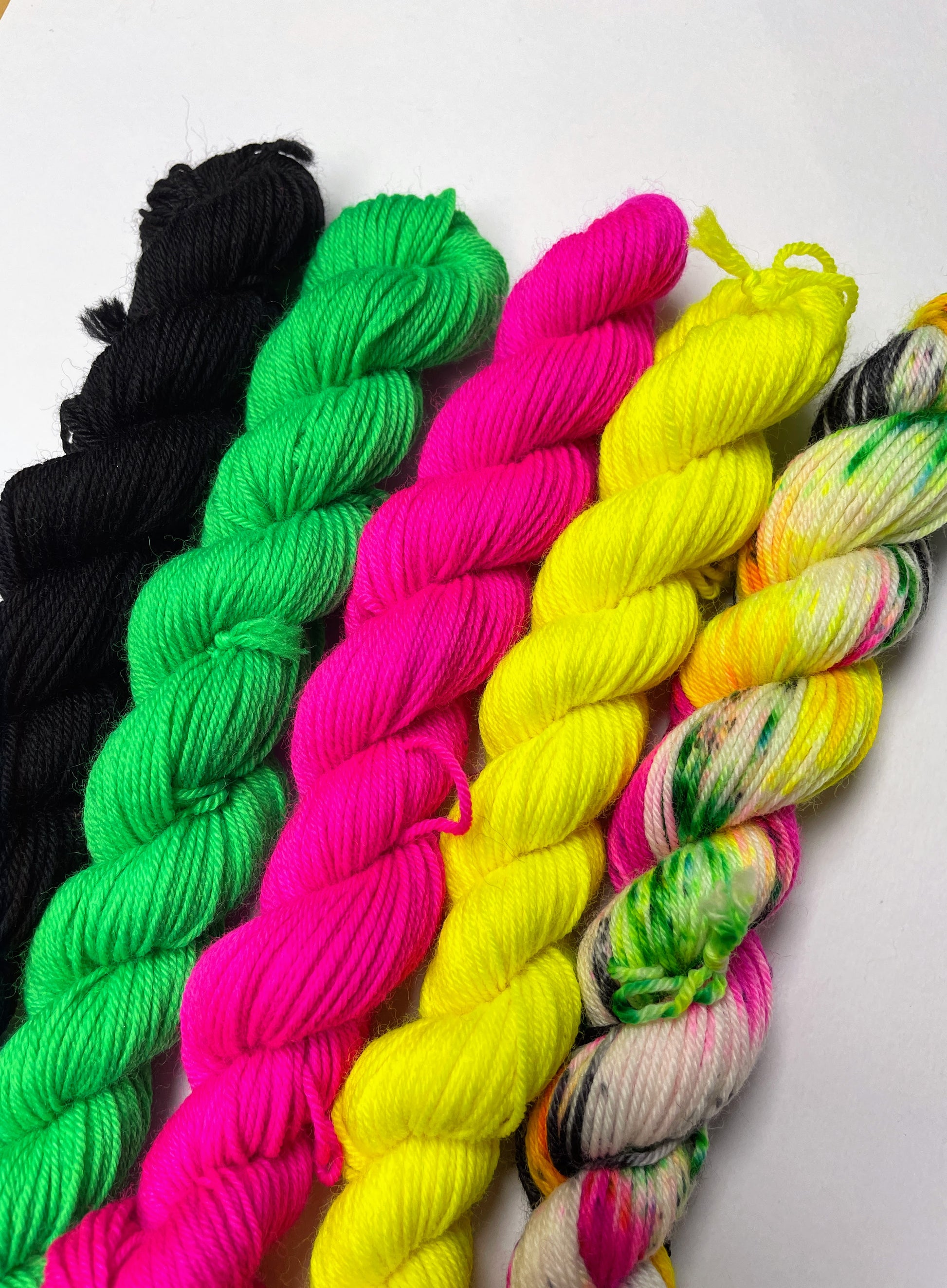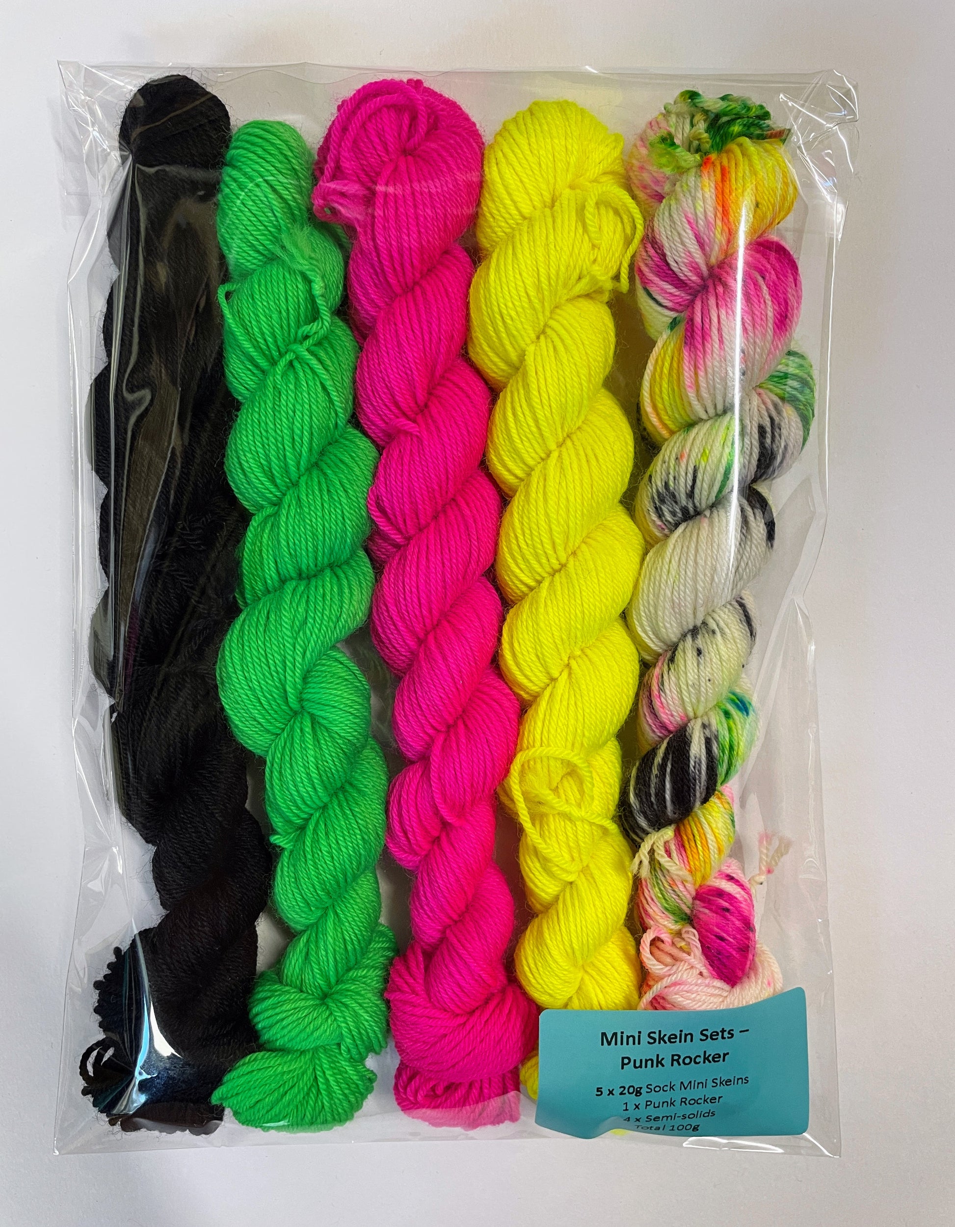 The semi-solid colourways all feature as speckles in the Punk Rocker colourway so compliment each other perfectly. These sets are perfect for scrappy socks/shawls and advent calendar style patterns. The possibilities are endless.