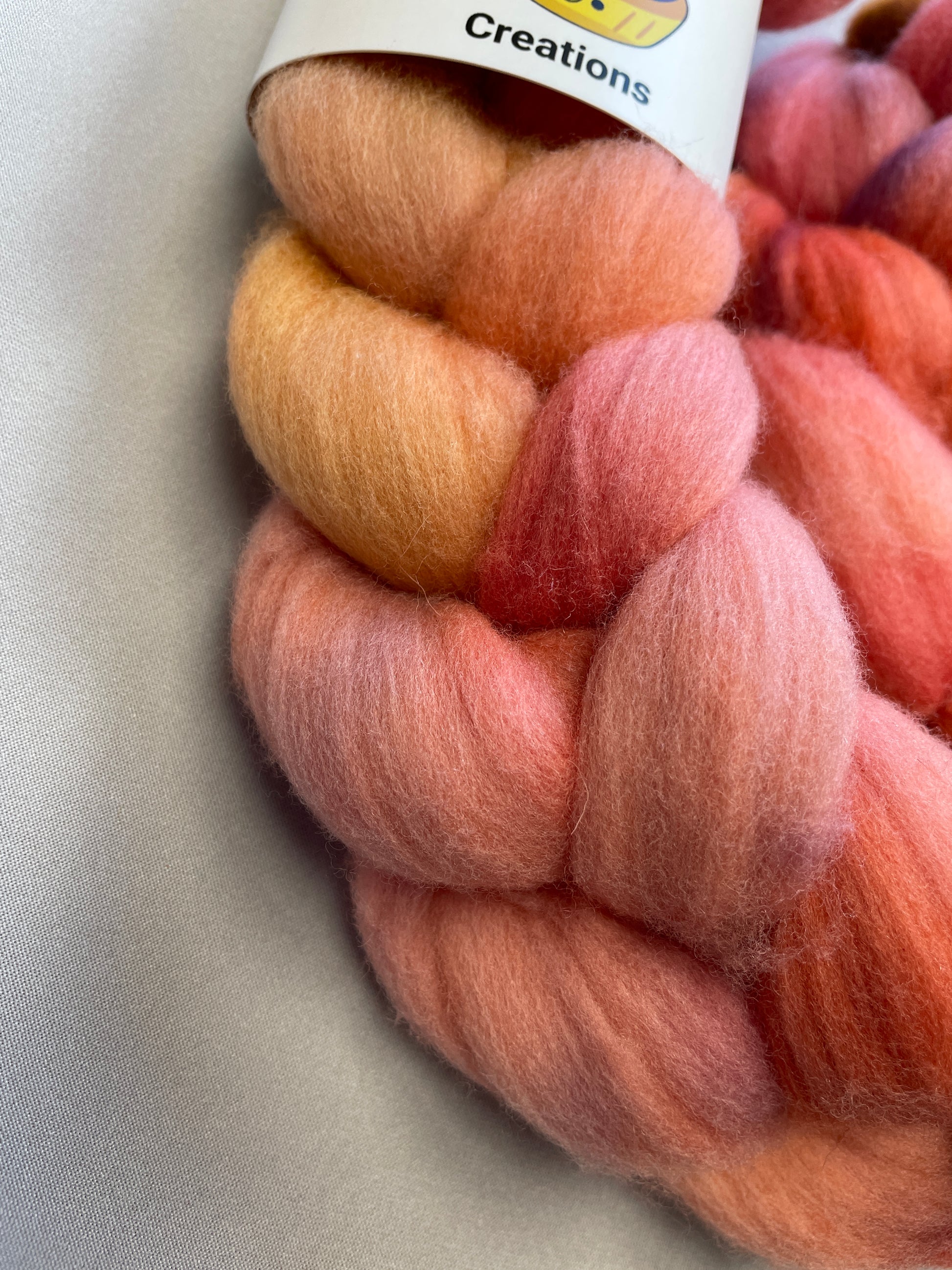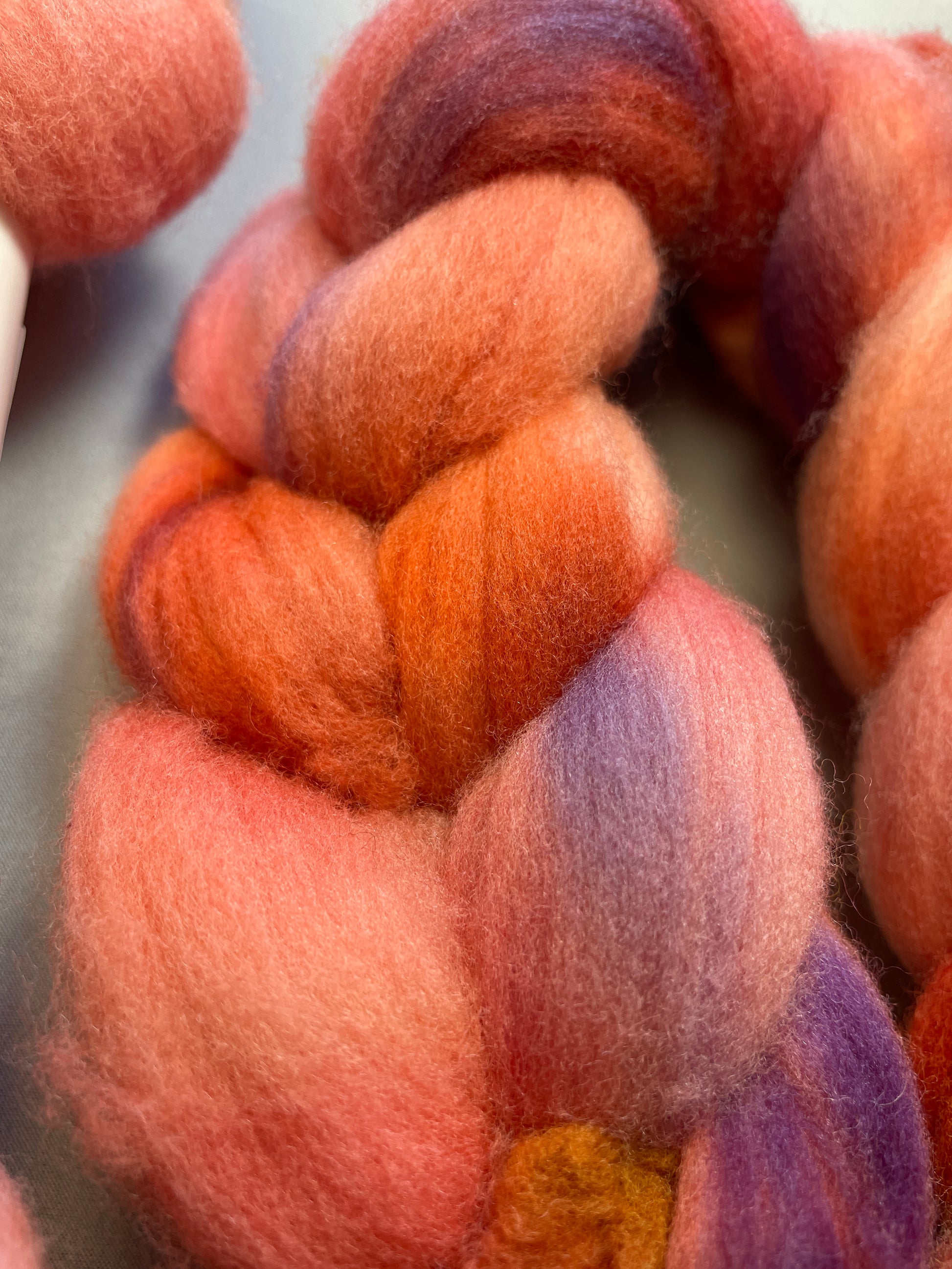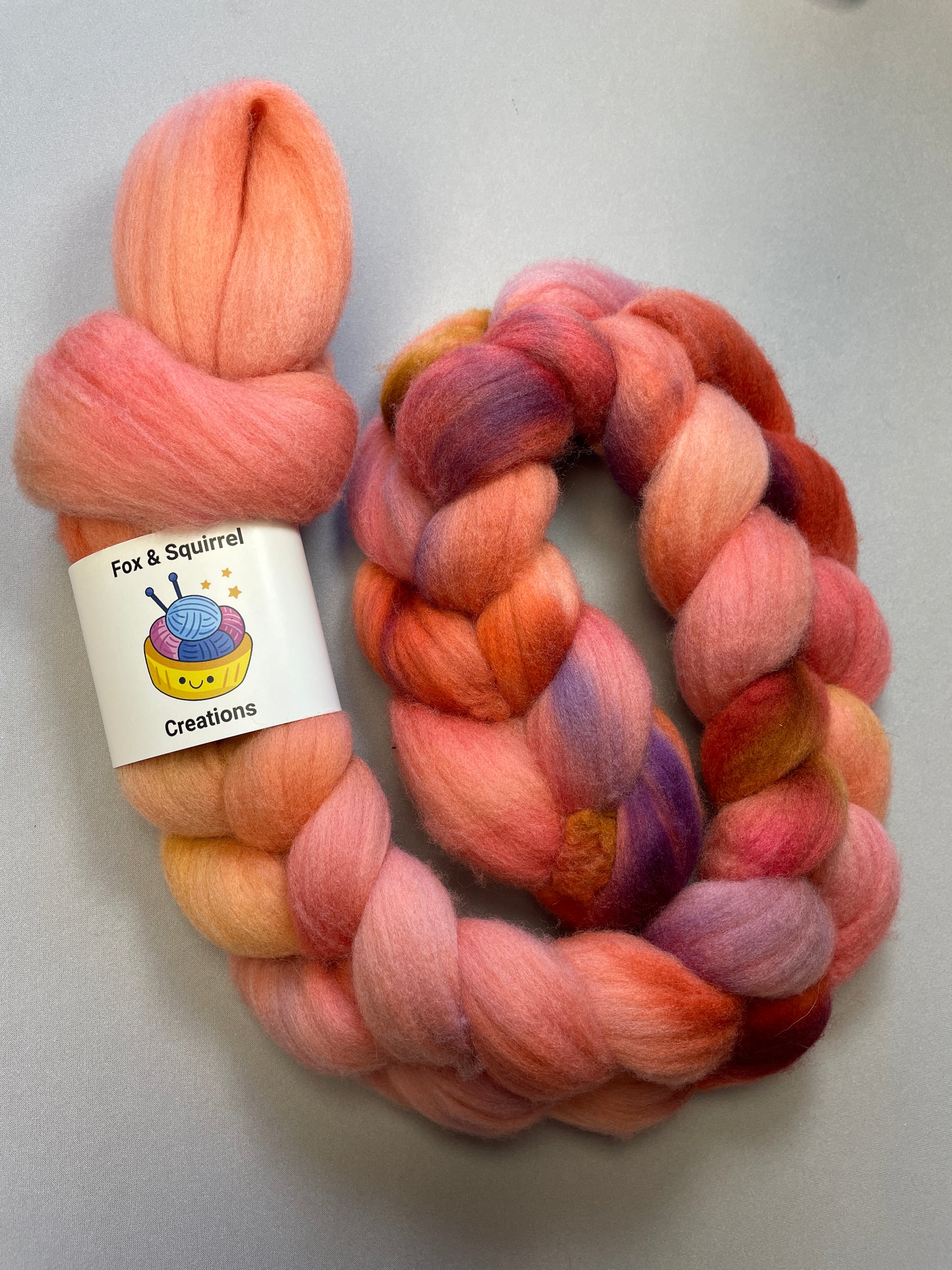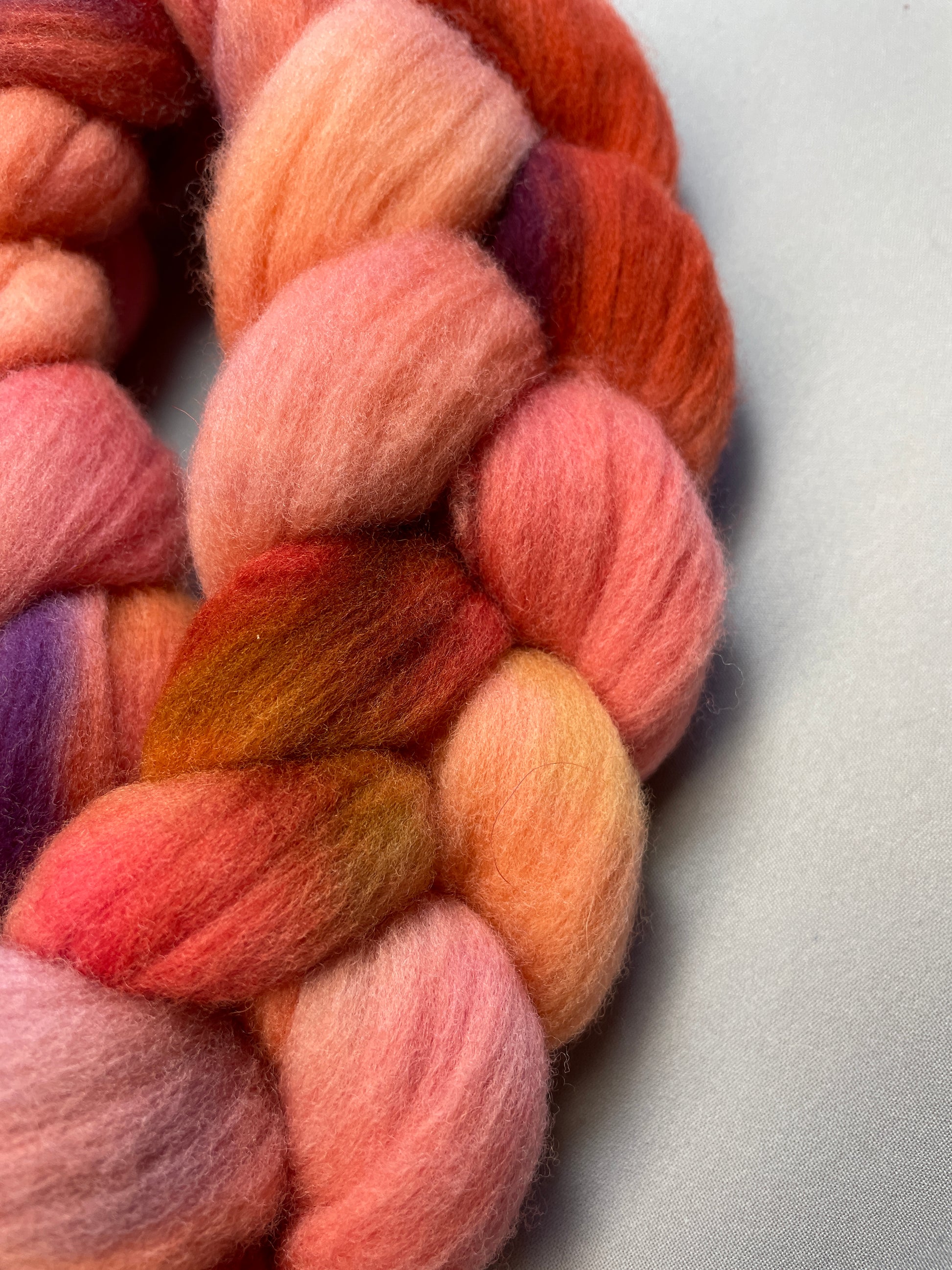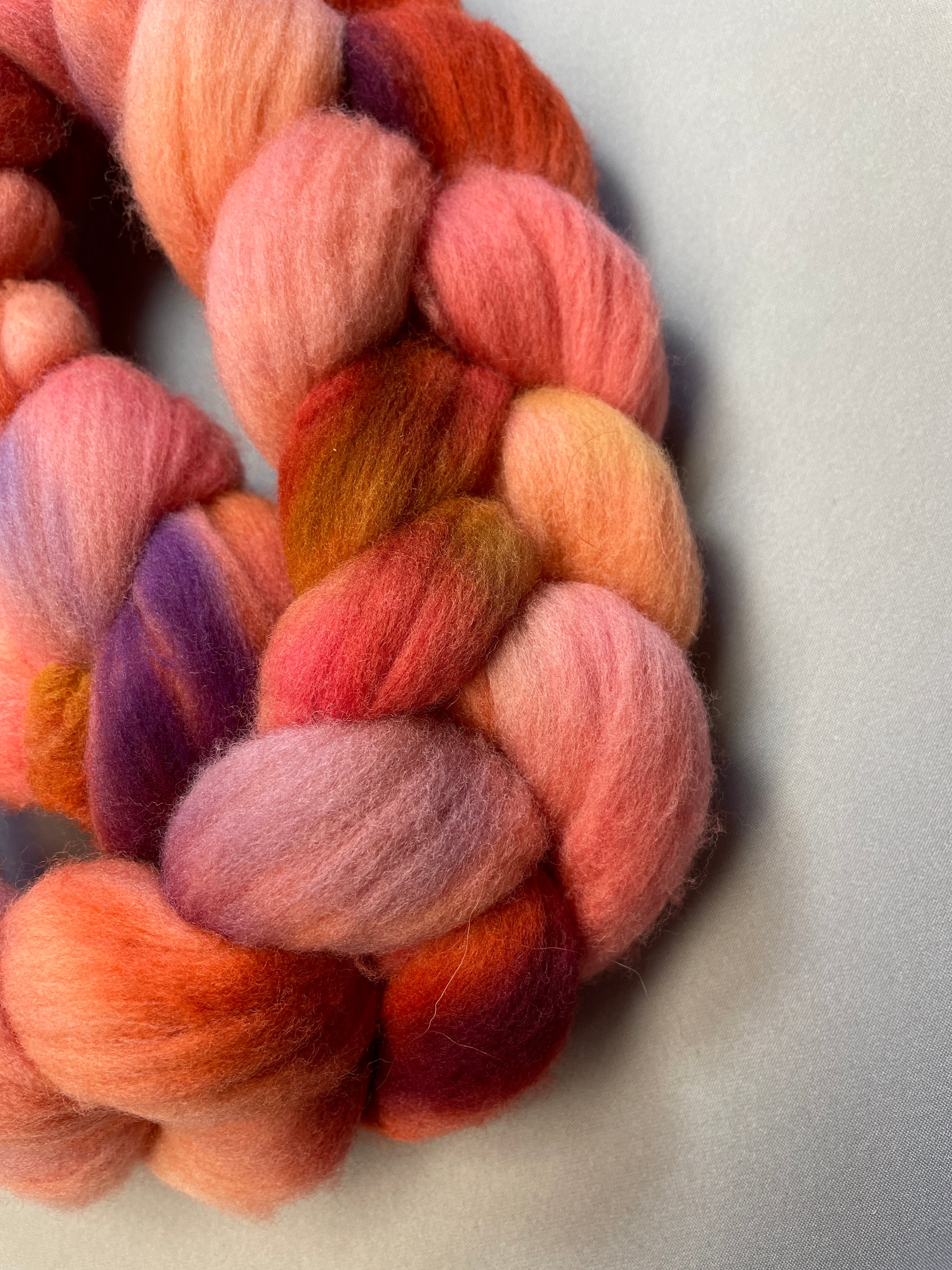 Hand-dyed fibre roving in shades of Red, Pink, Peach and Purple. A soft colourway, perfect for your next spinning project. Dyed on non-superwash rambouillet fibre.