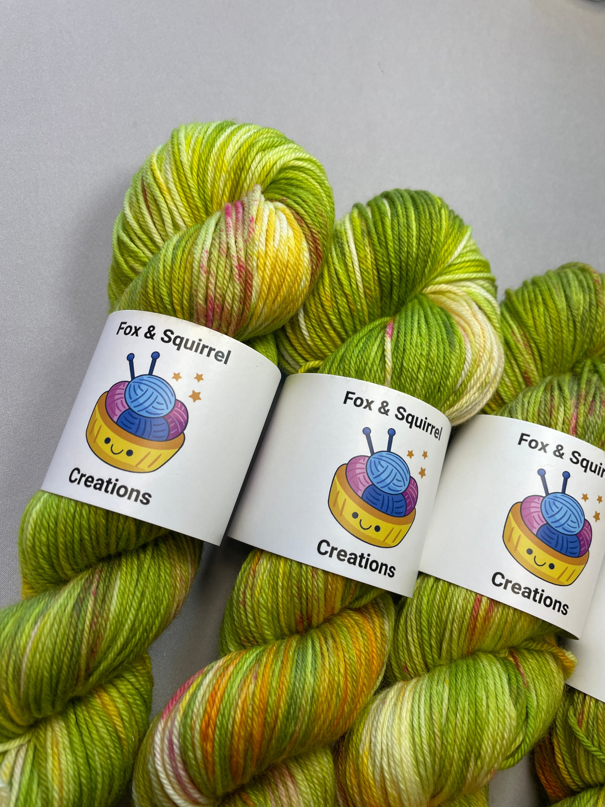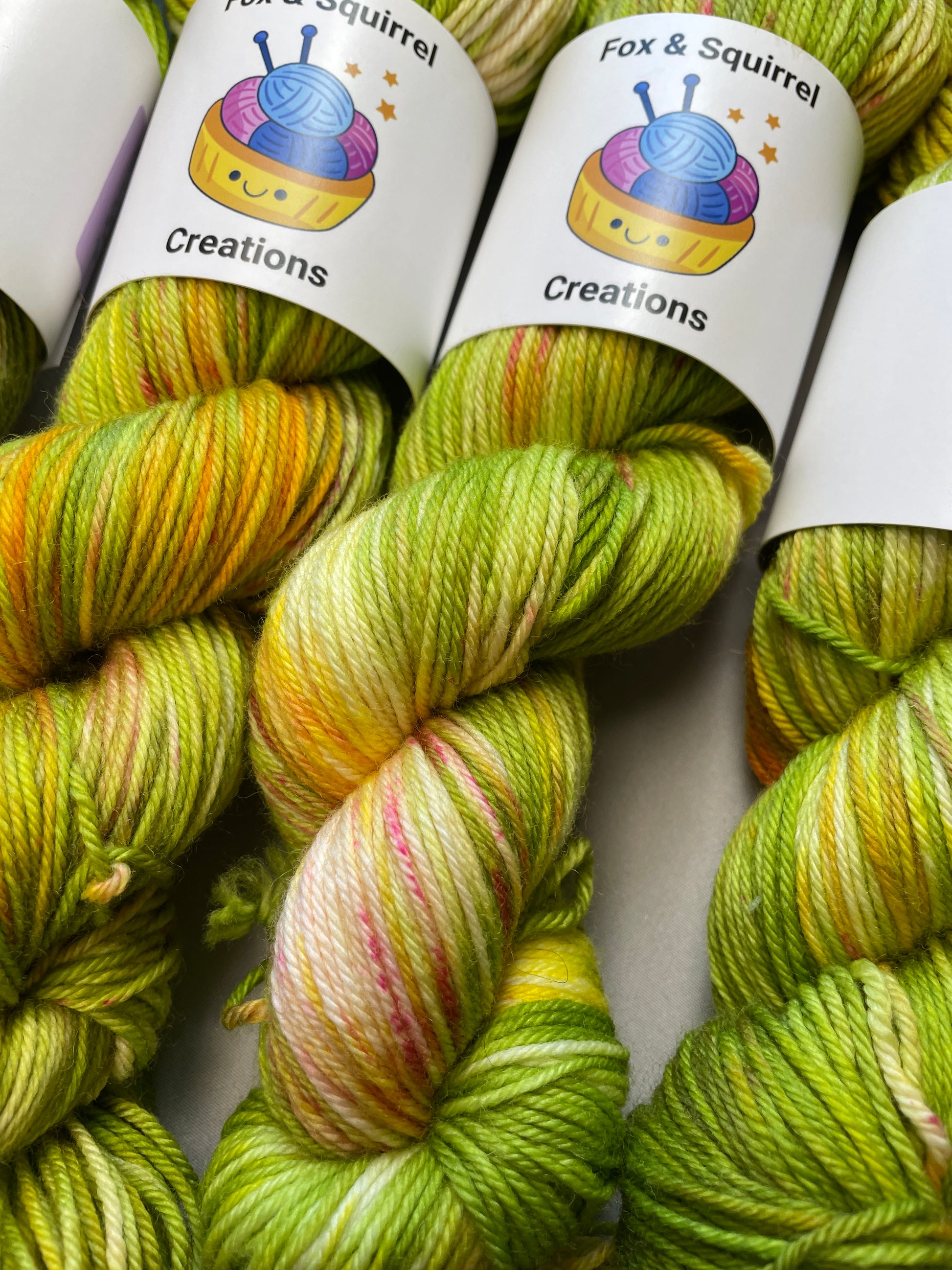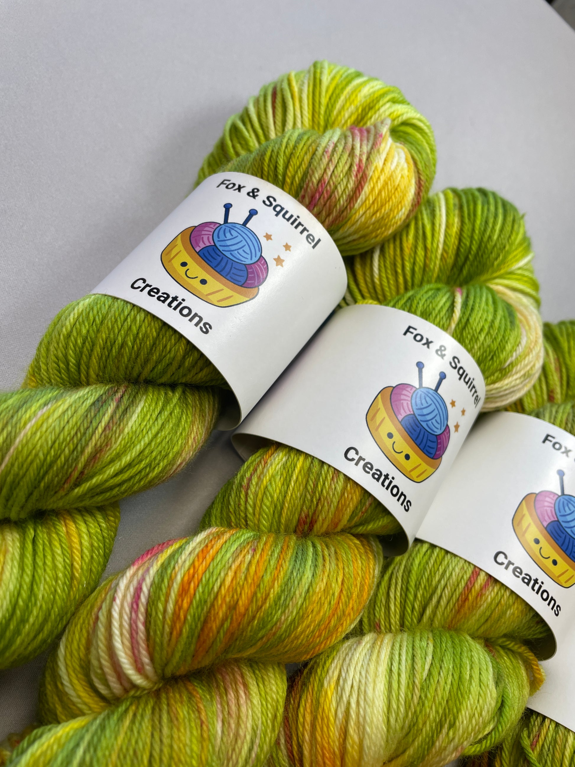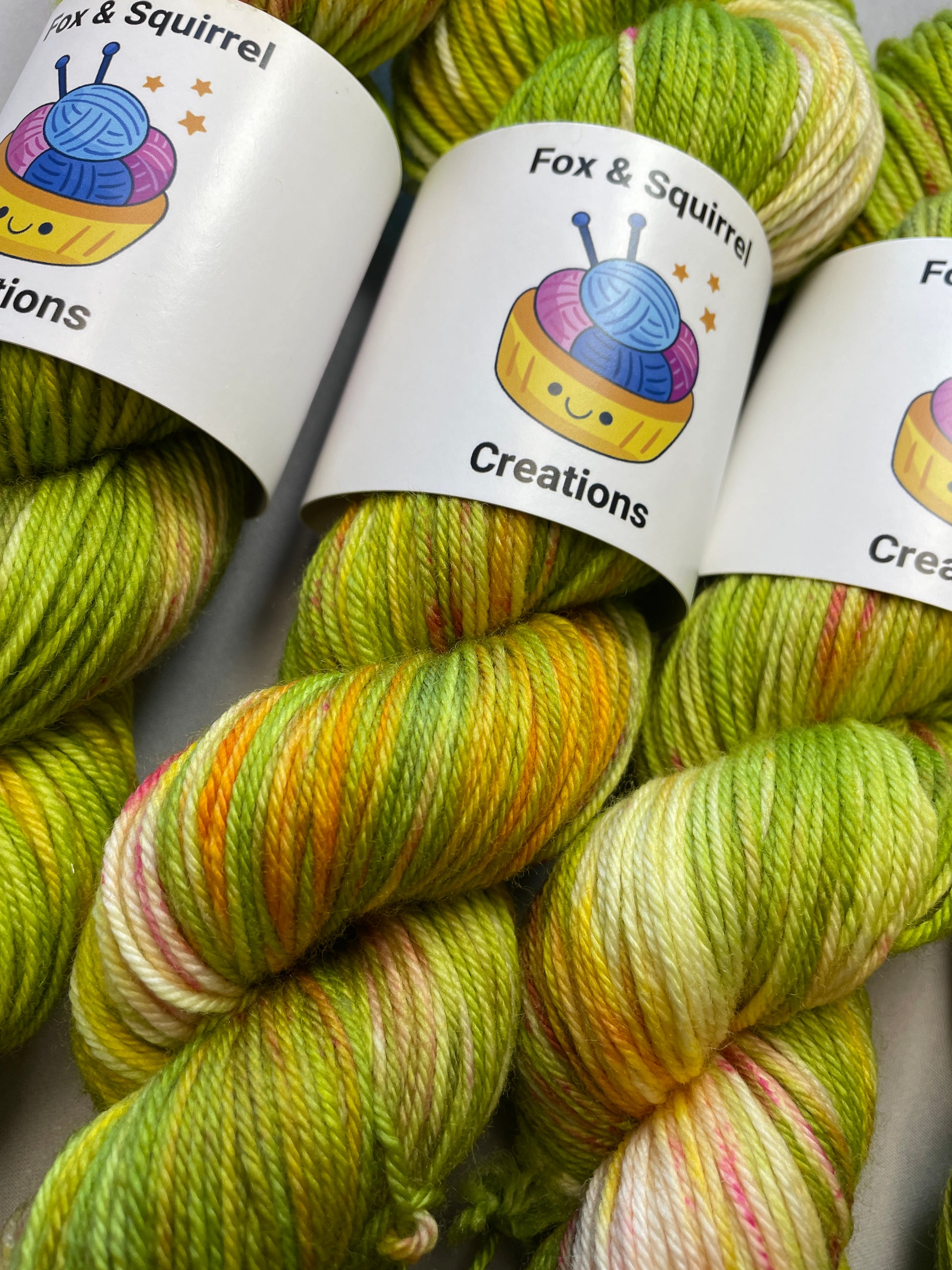 Vintage Rose is a variegated colourway with a base of light green with pops of raspberry and mustard throughout the skein creating a soft, floral colourway.