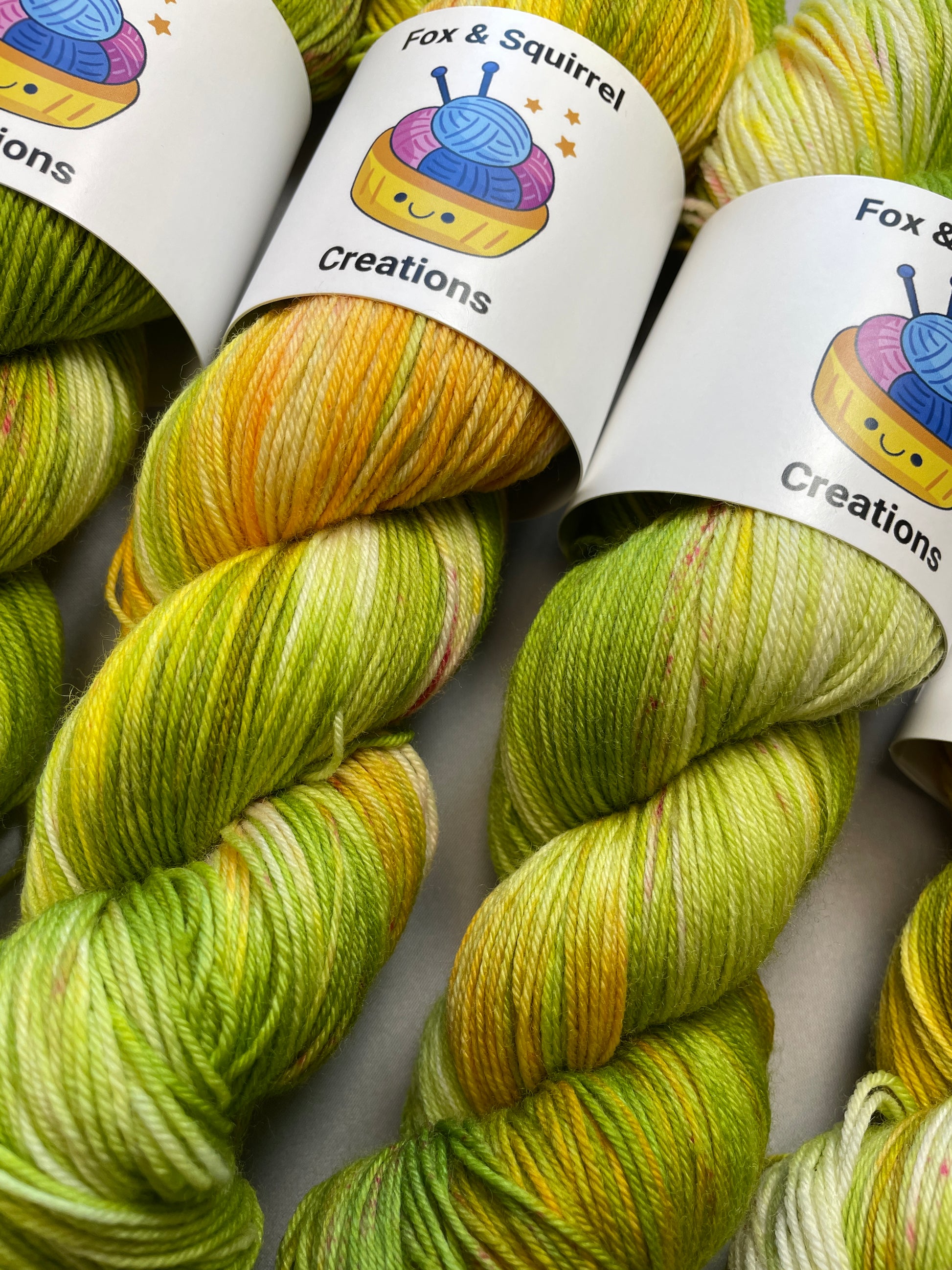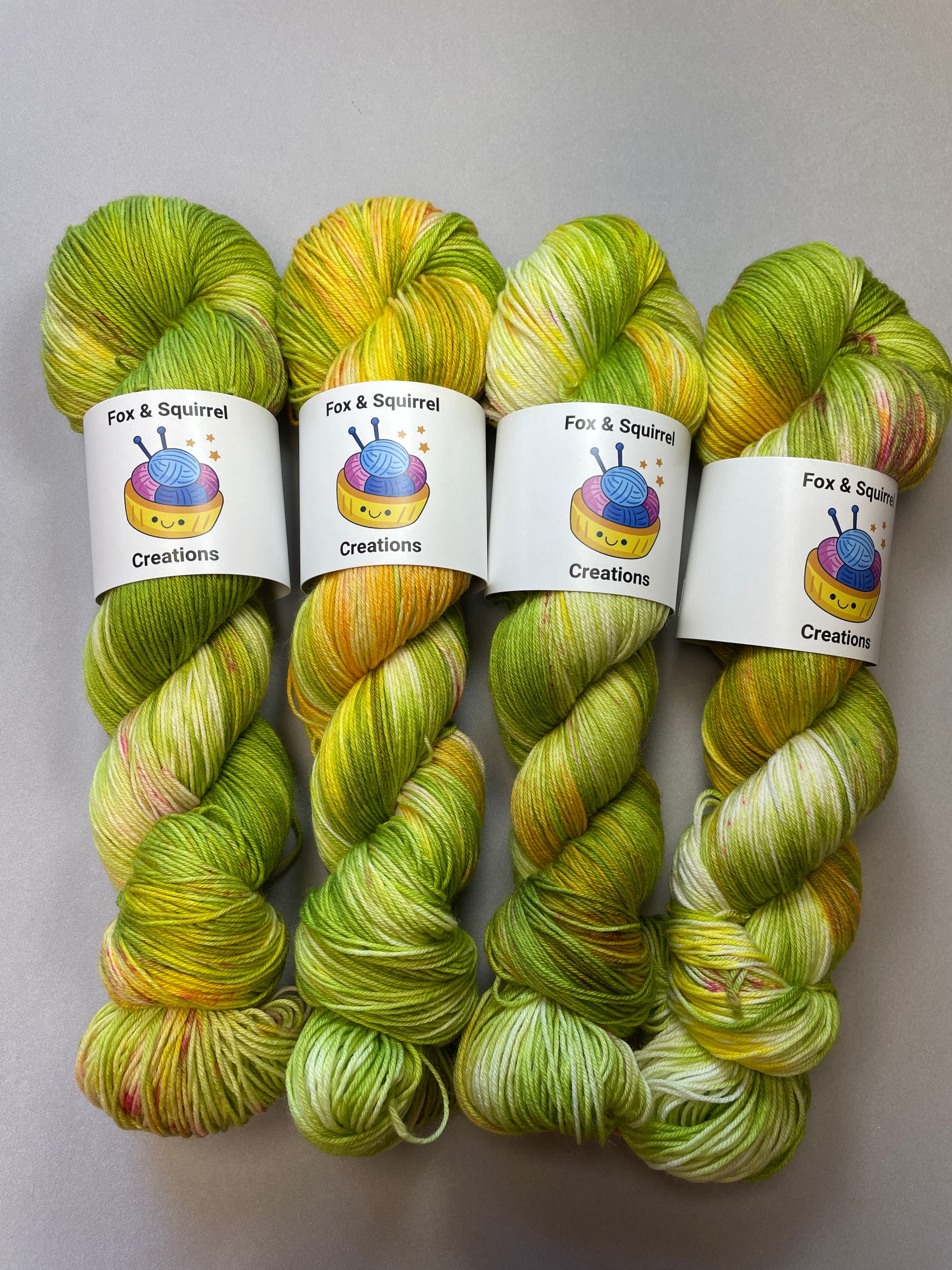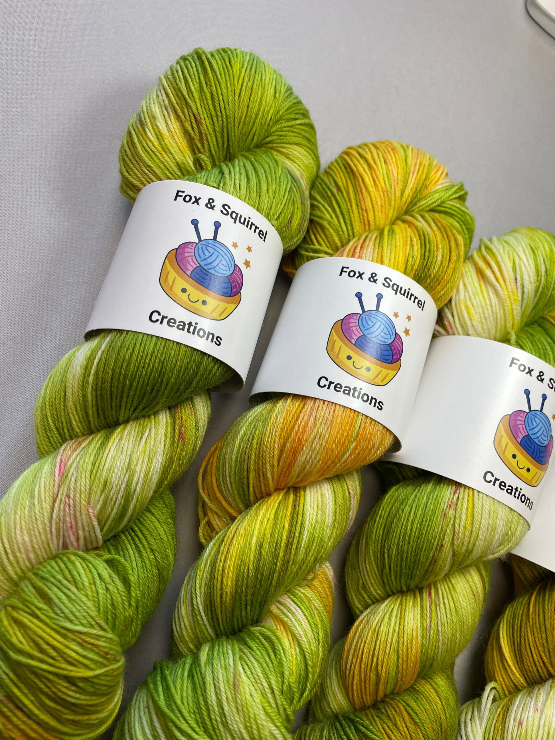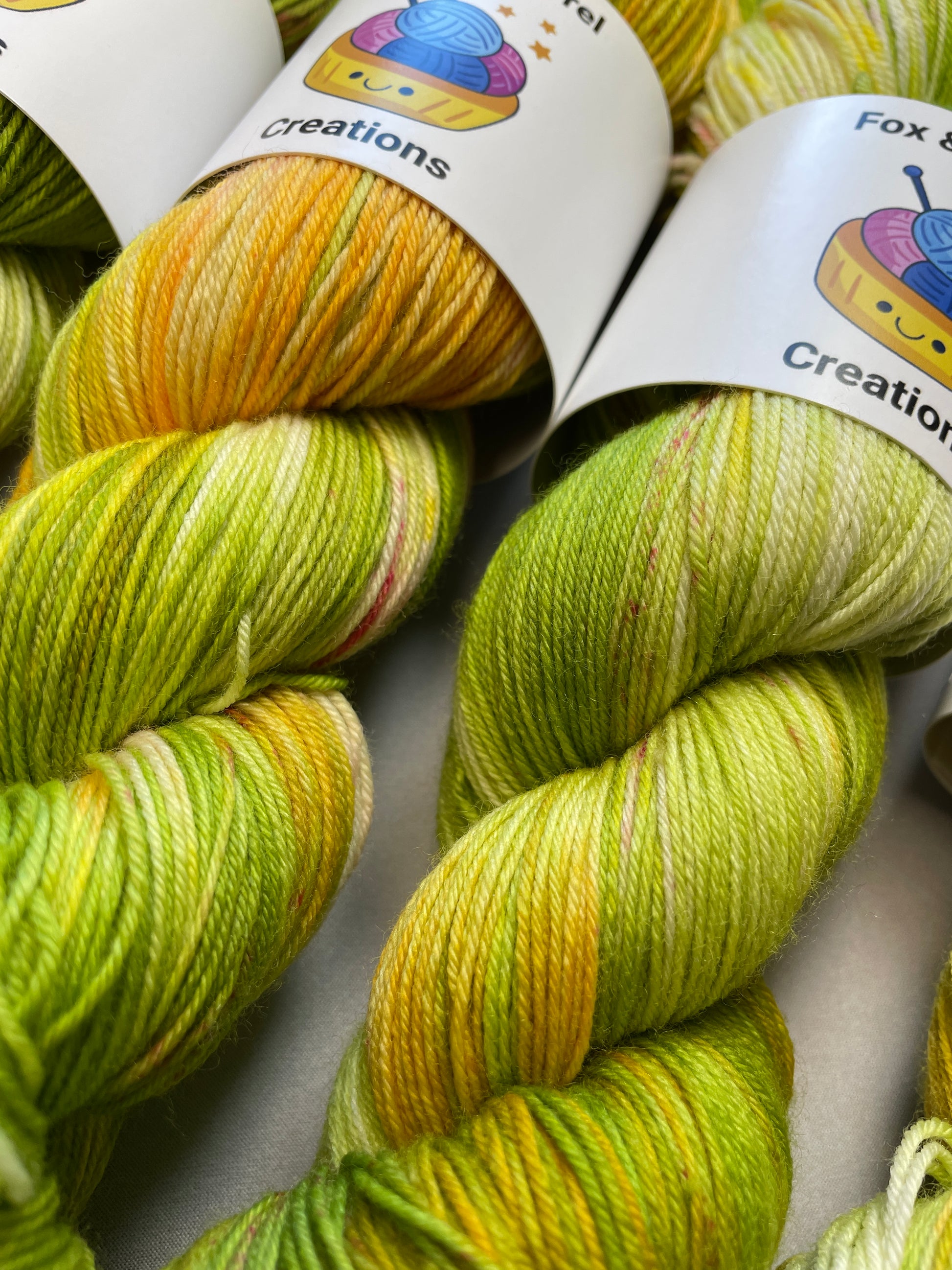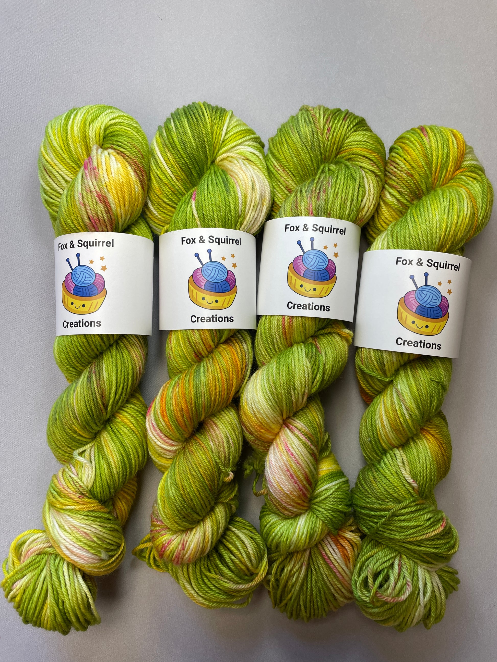 Vintage Rose is a variegated colourway with a base of light green with pops of raspberry and mustard throughout the skein creating a soft, floral colourway.